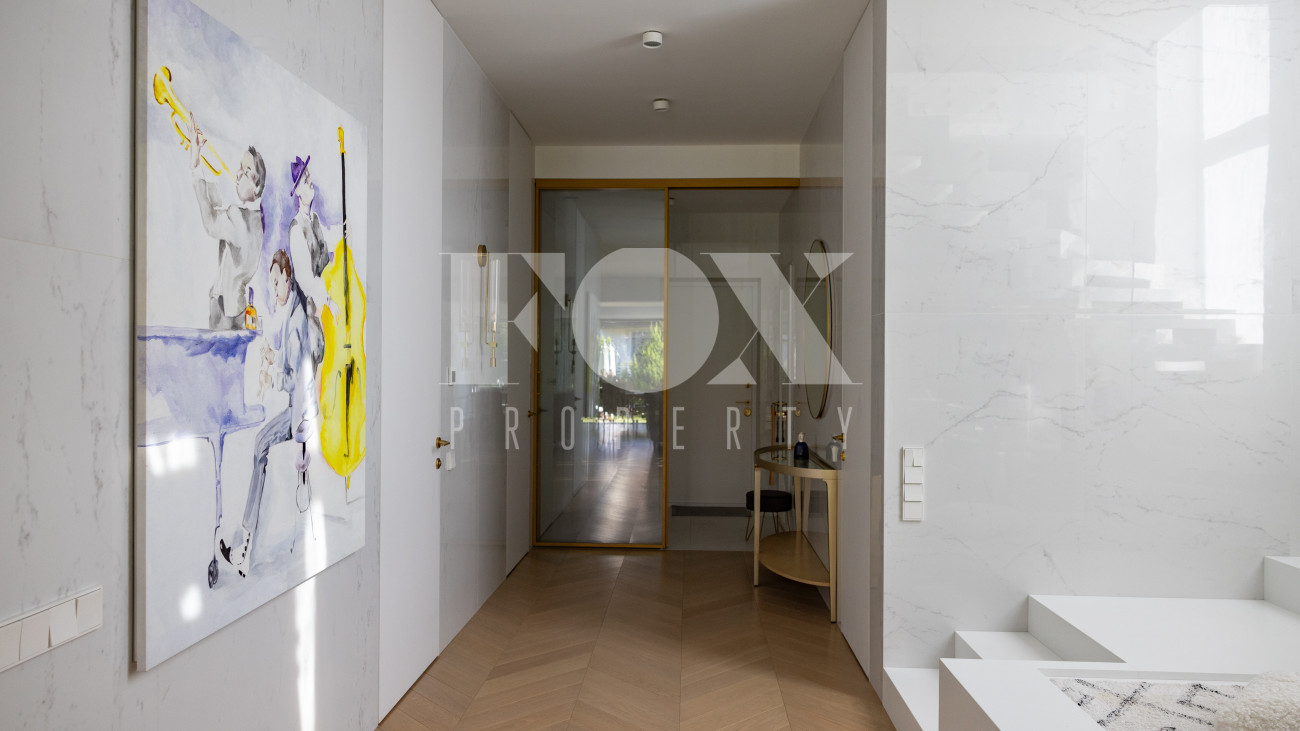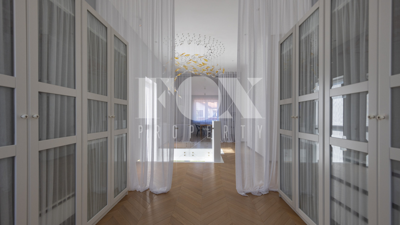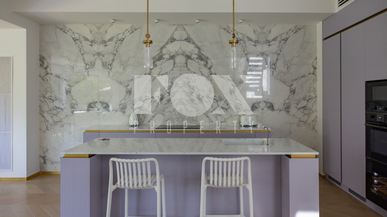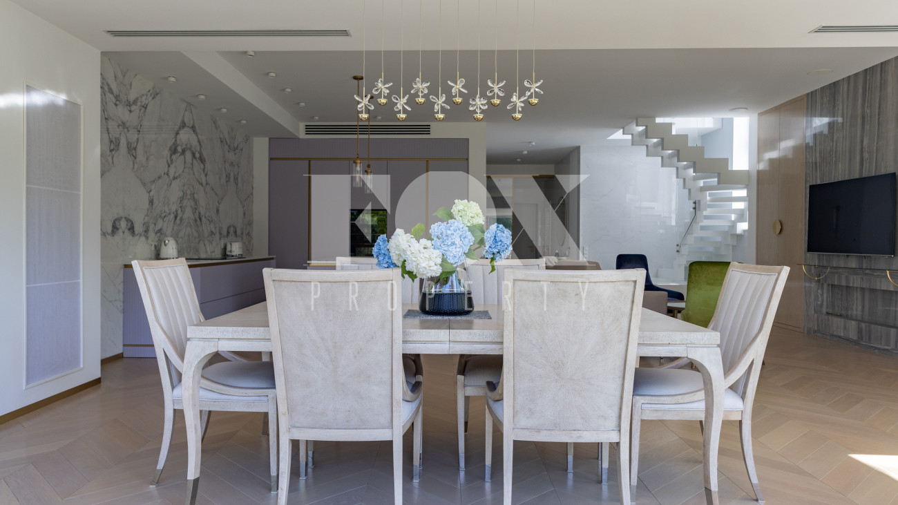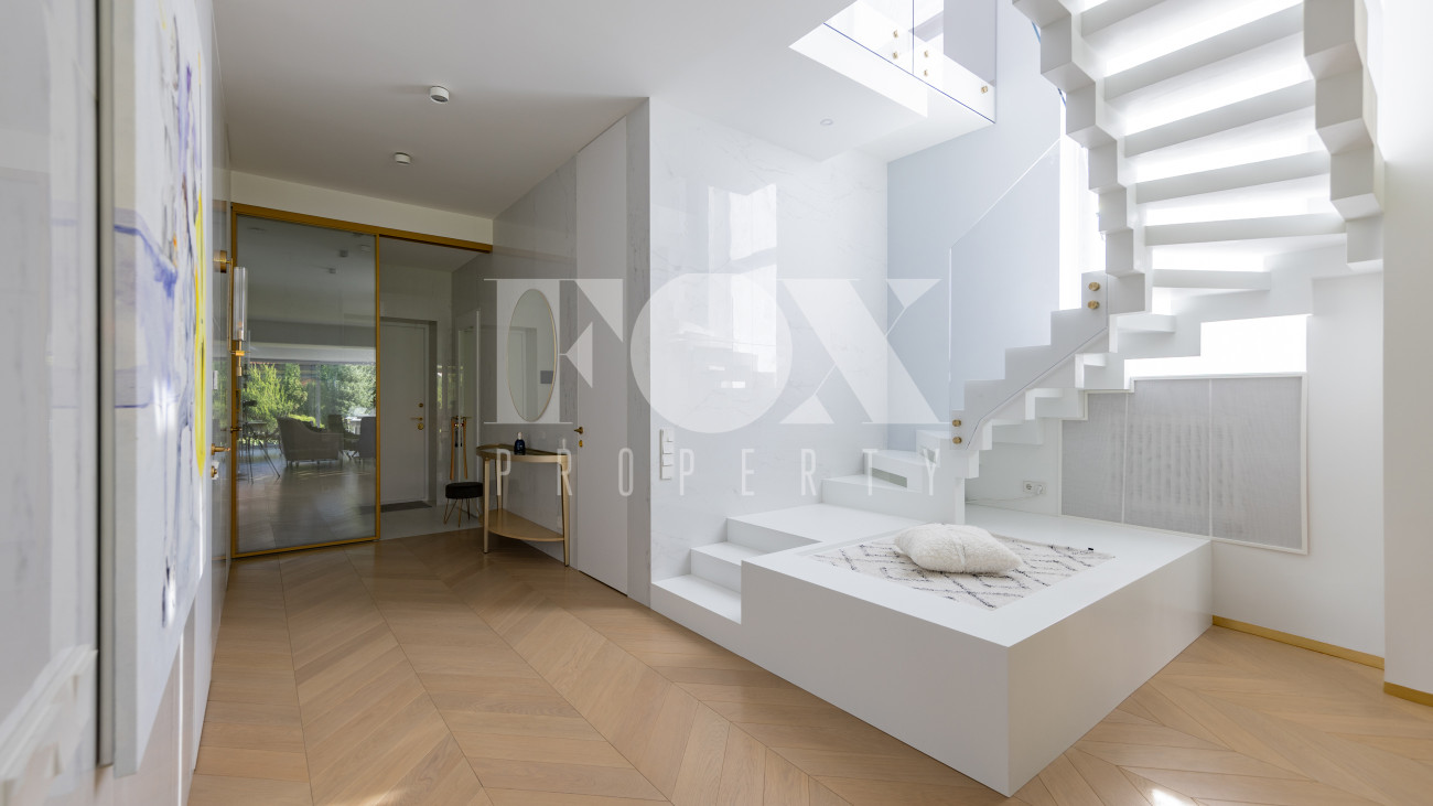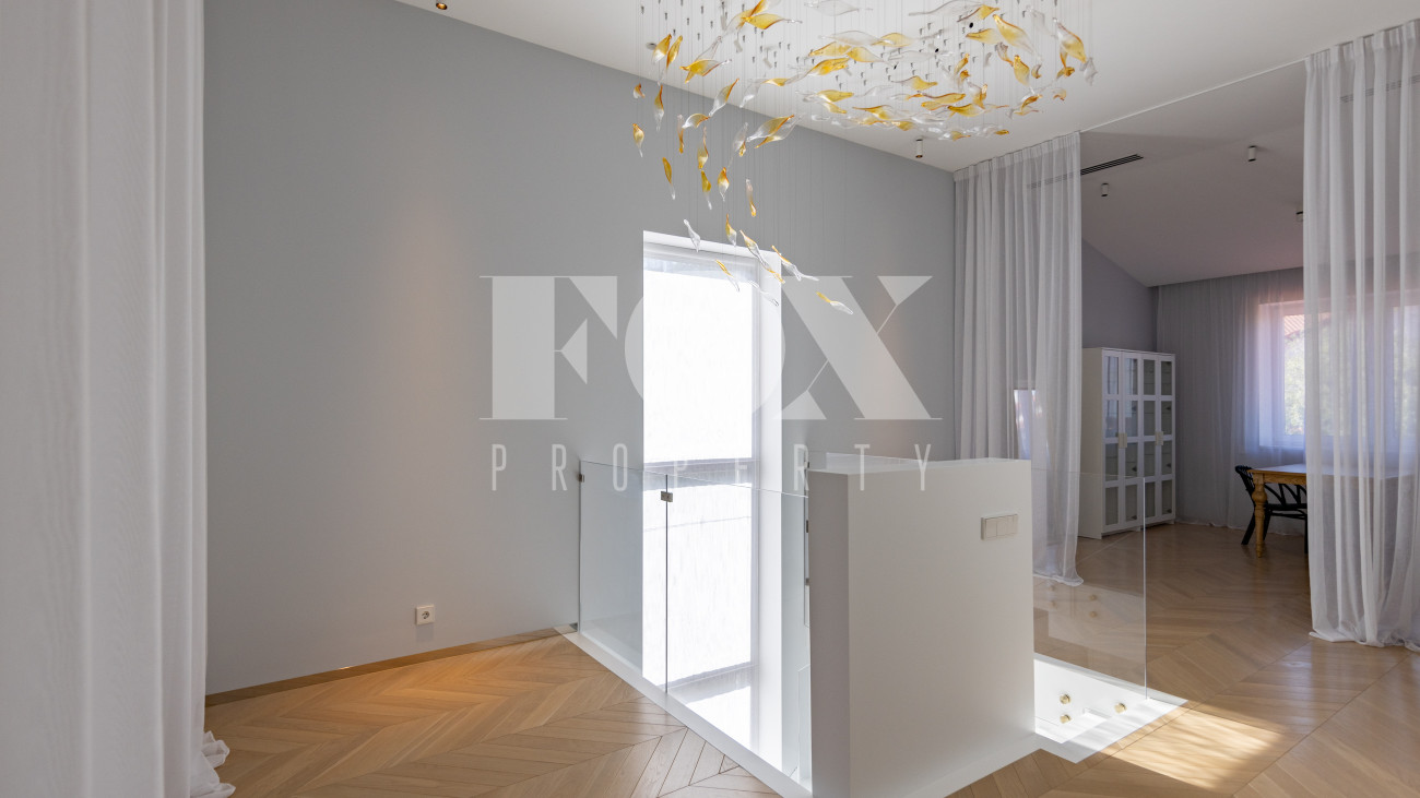Фасад, выполненный в европейском стиле, облицован кремовой штукатуркой и благородным красным клинкерным кирпичом, а также украшен элегантными рустовкой, пилястрами и лепниной. Современные интерьеры выдержаны в светлых тонах и гармонично сочетают фактуры камня и дерева. Комфортная мебель, встроенная бытовая техника, изящные люстры и тщательно подобранные предметы декора дополняют образ. Для идеального микроклимата установлена система кондиционирования.