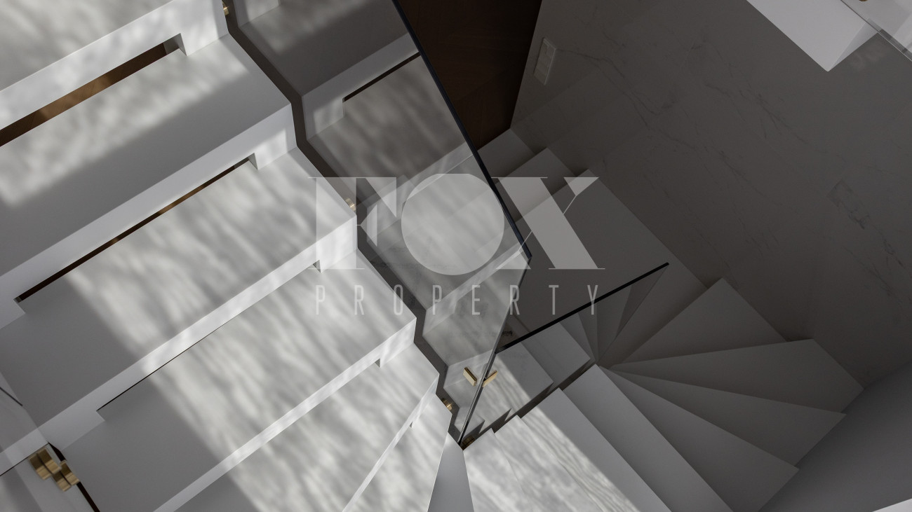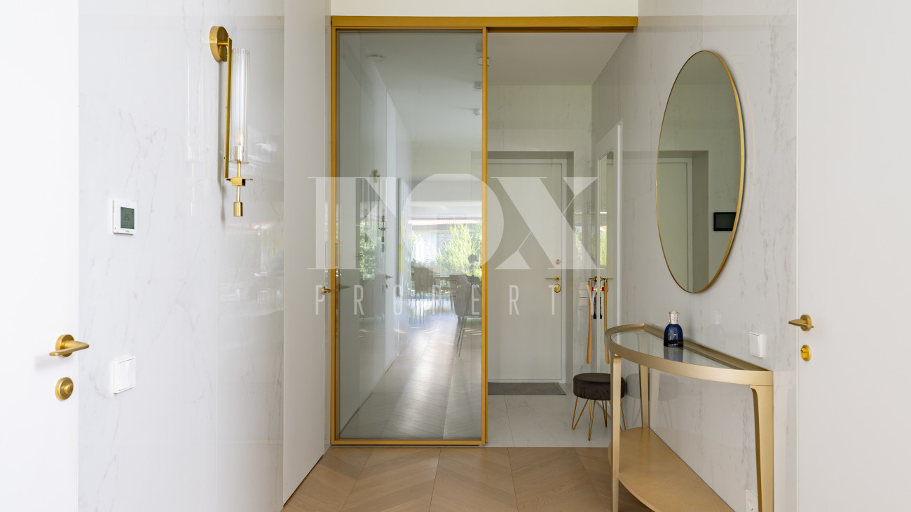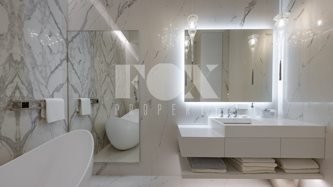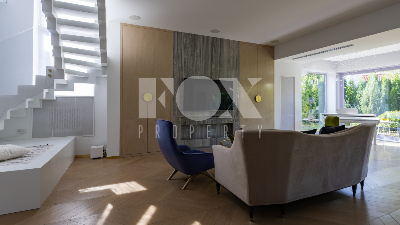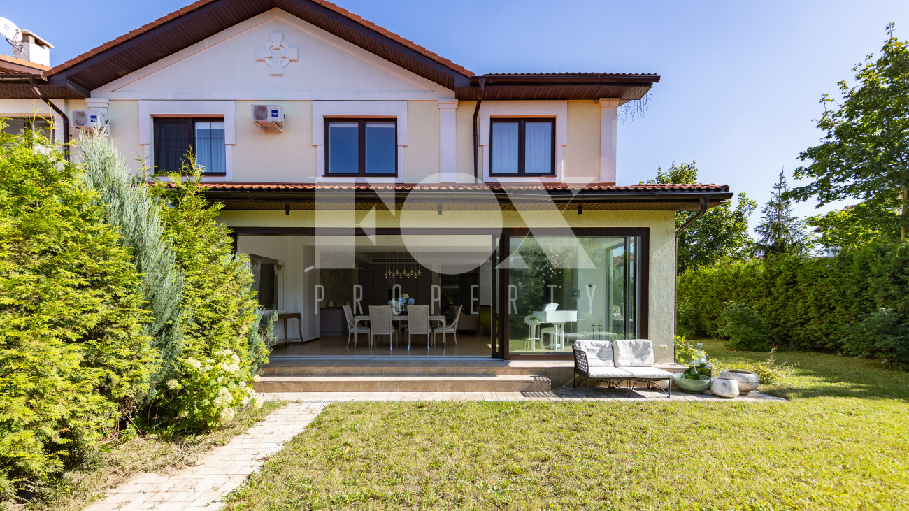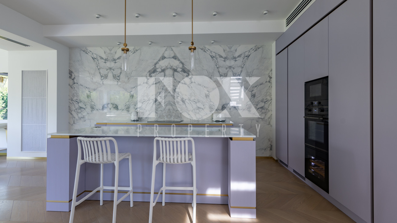 Фасад, выполненный в европейском стиле, облицован кремовой штукатуркой и благородным красным клинкерным кирпичом, а также украшен элегантными рустовкой, пилястрами и лепниной. Современные интерьеры выдержаны в светлых тонах и гармонично сочетают фактуры камня и дерева. Комфортная мебель, встроенная бытовая техника, изящные люстры и тщательно подобранные предметы декора дополняют образ. Для идеального микроклимата установлена система кондиционирования.