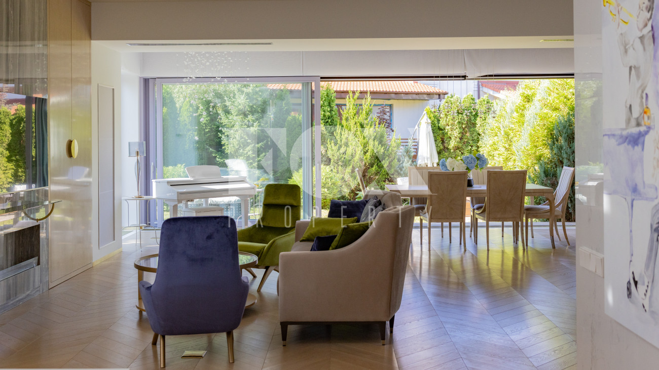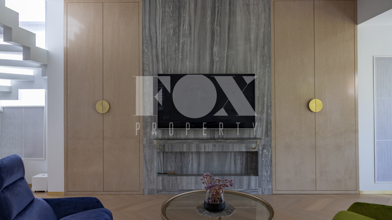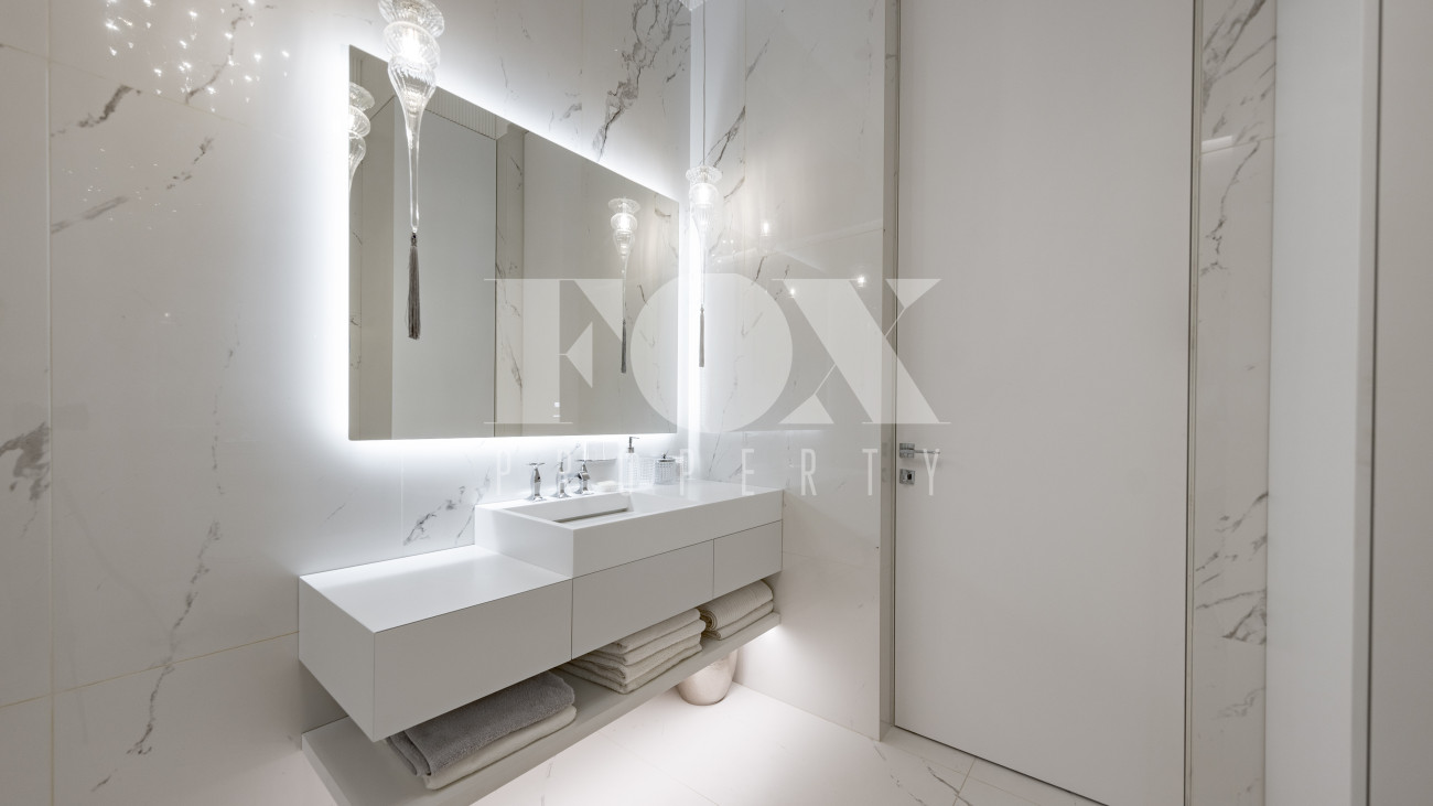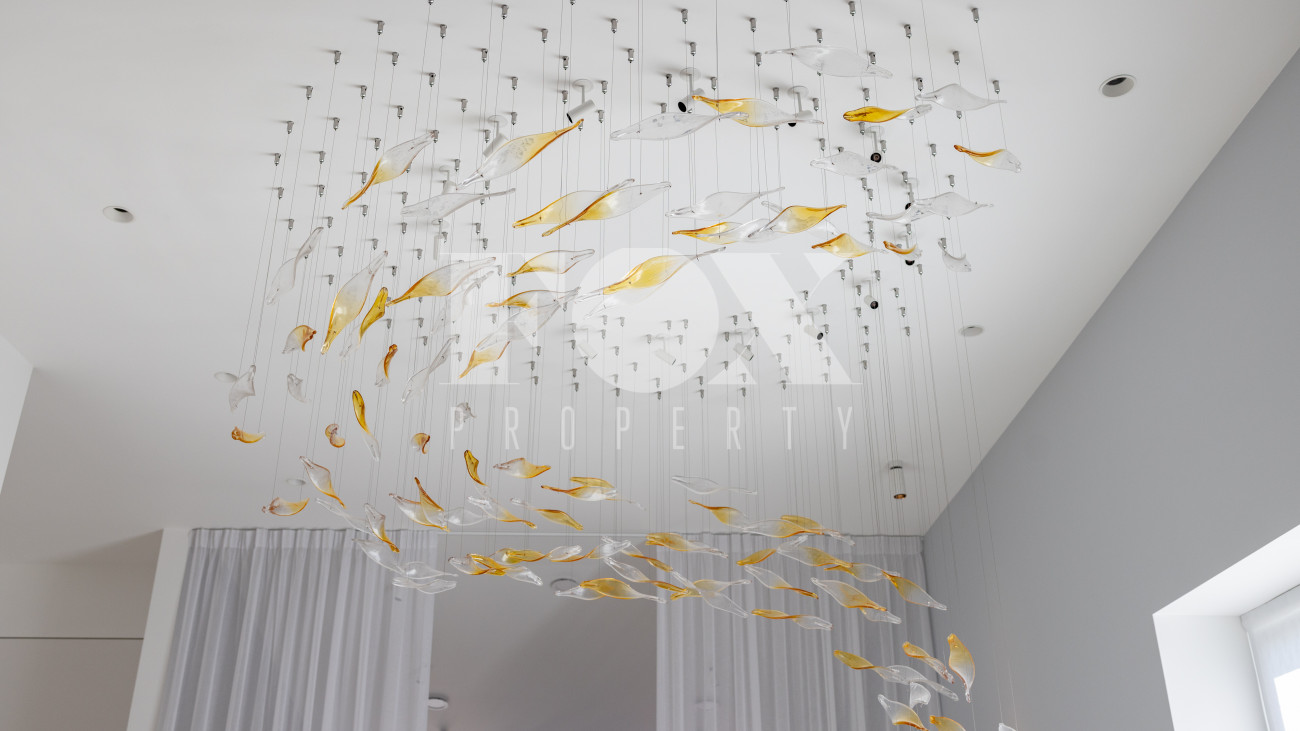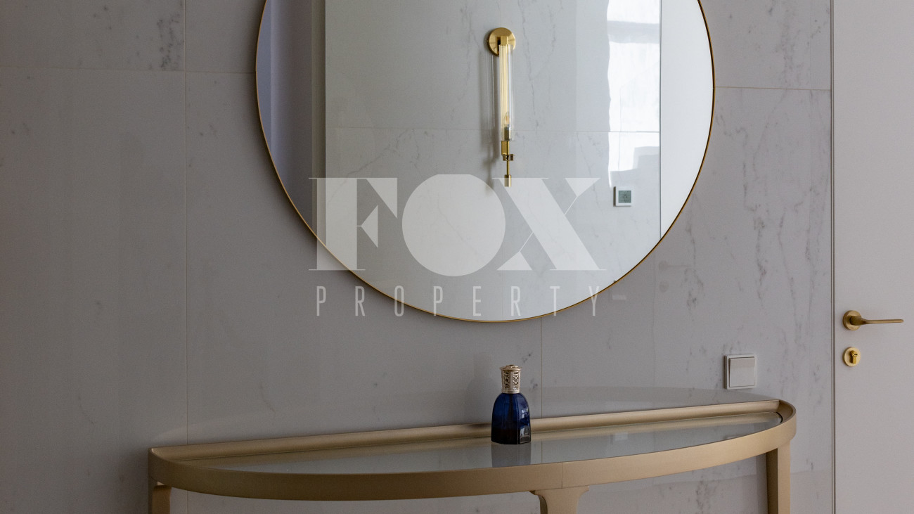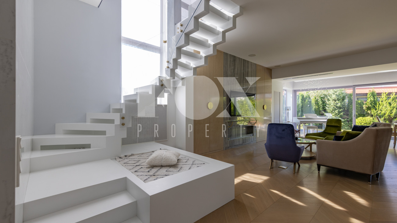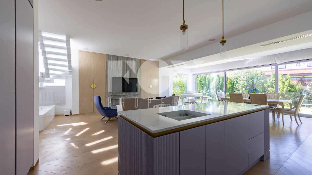 Фасад, выполненный в европейском стиле, облицован кремовой штукатуркой и благородным красным клинкерным кирпичом, а также украшен элегантными рустовкой, пилястрами и лепниной. Современные интерьеры выдержаны в светлых тонах и гармонично сочетают фактуры камня и дерева. Комфортная мебель, встроенная бытовая техника, изящные люстры и тщательно подобранные предметы декора дополняют образ. Для идеального микроклимата установлена система кондиционирования.