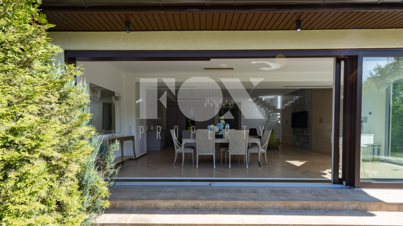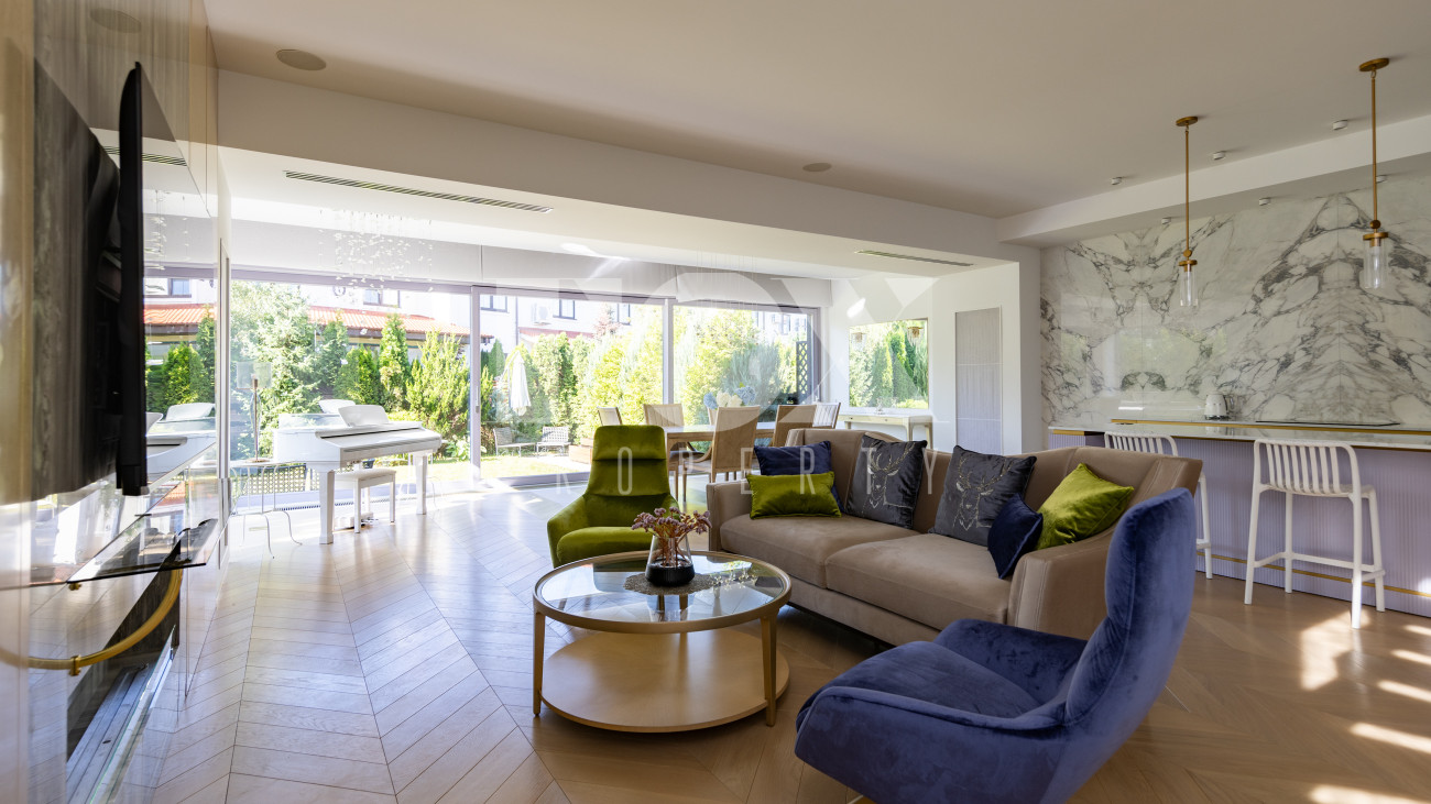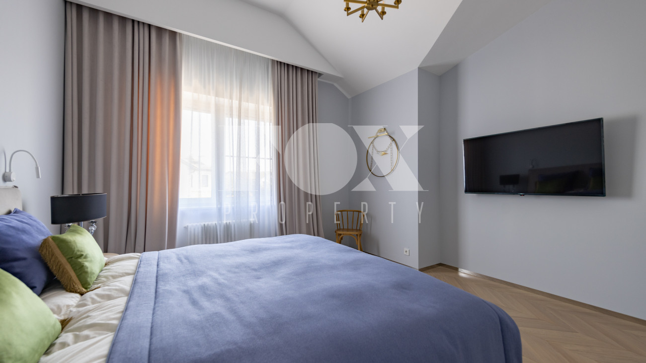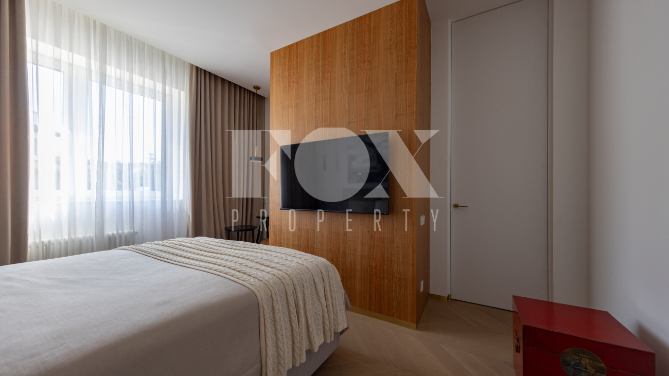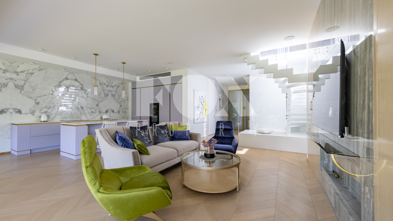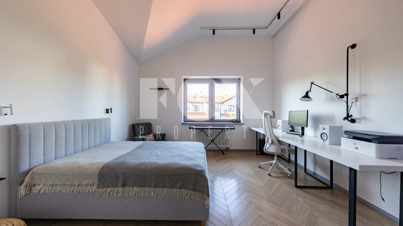 Фасад, выполненный в европейском стиле, облицован кремовой штукатуркой и благородным красным клинкерным кирпичом, а также украшен элегантными рустовкой, пилястрами и лепниной. Современные интерьеры выдержаны в светлых тонах и гармонично сочетают фактуры камня и дерева. Комфортная мебель, встроенная бытовая техника, изящные люстры и тщательно подобранные предметы декора дополняют образ. Для идеального микроклимата установлена система кондиционирования.