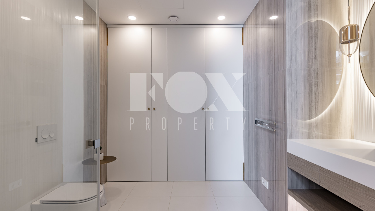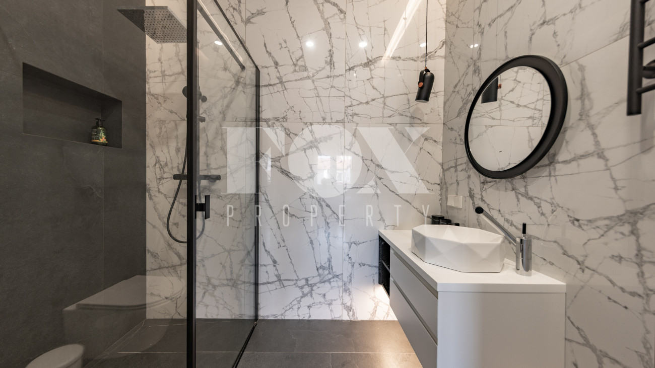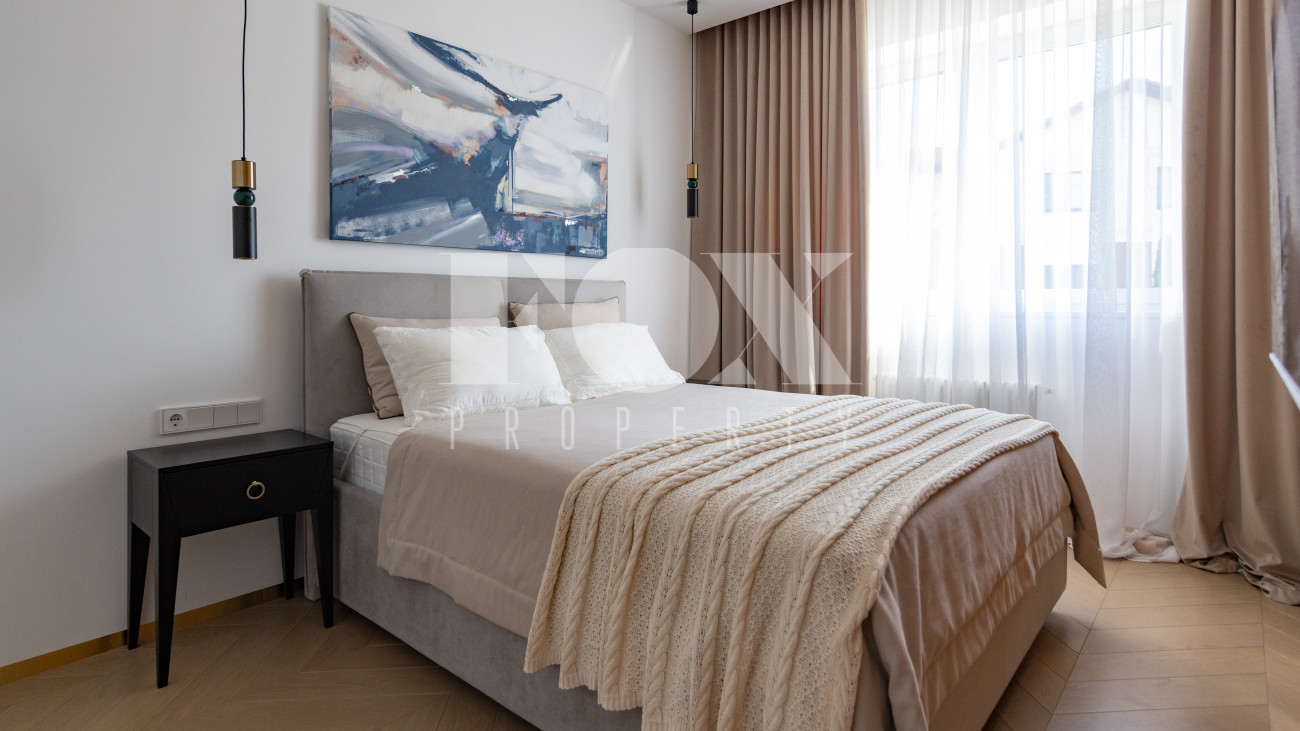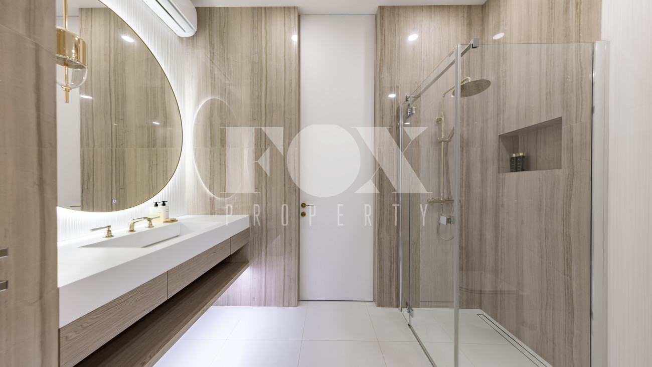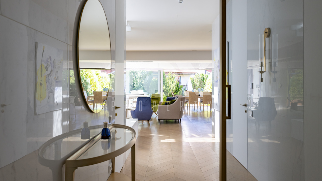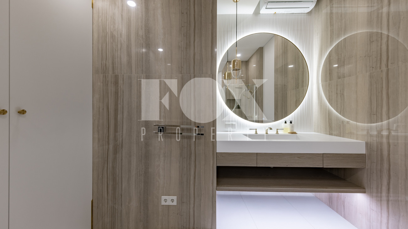 Фасад, выполненный в европейском стиле, облицован кремовой штукатуркой и благородным красным клинкерным кирпичом, а также украшен элегантными рустовкой, пилястрами и лепниной. Современные интерьеры выдержаны в светлых тонах и гармонично сочетают фактуры камня и дерева. Комфортная мебель, встроенная бытовая техника, изящные люстры и тщательно подобранные предметы декора дополняют образ. Для идеального микроклимата установлена система кондиционирования.