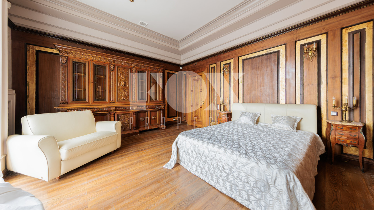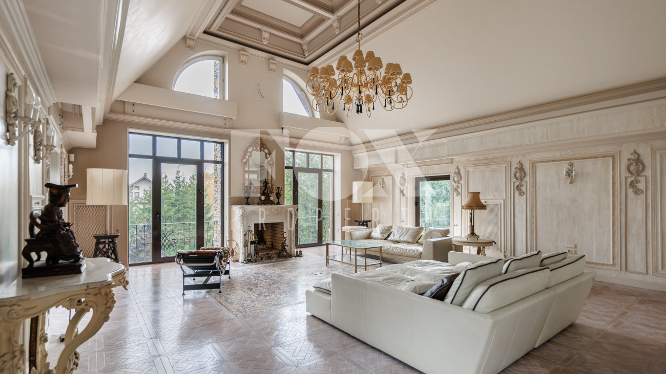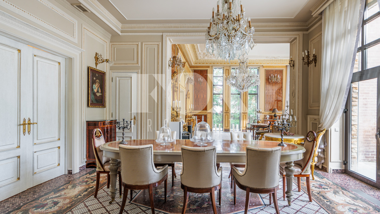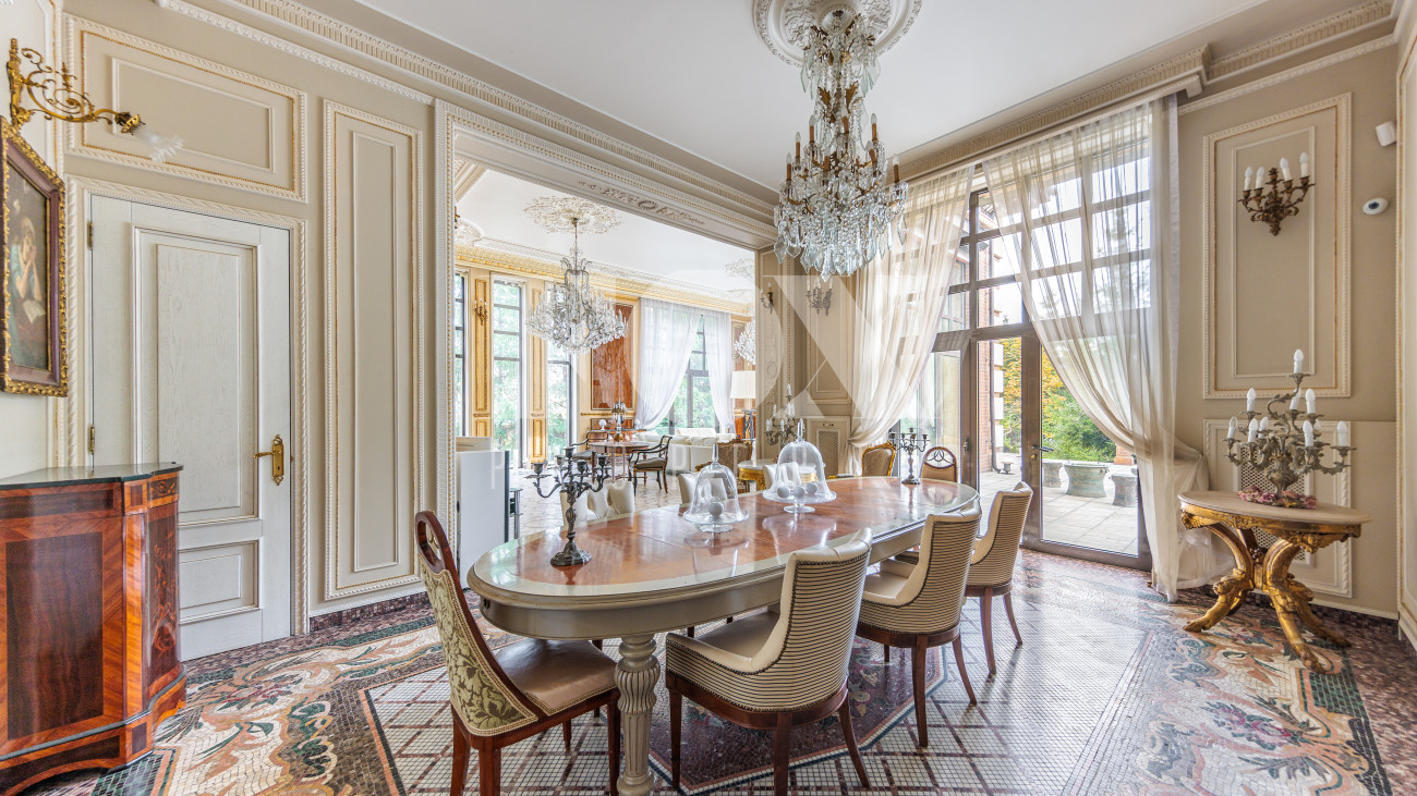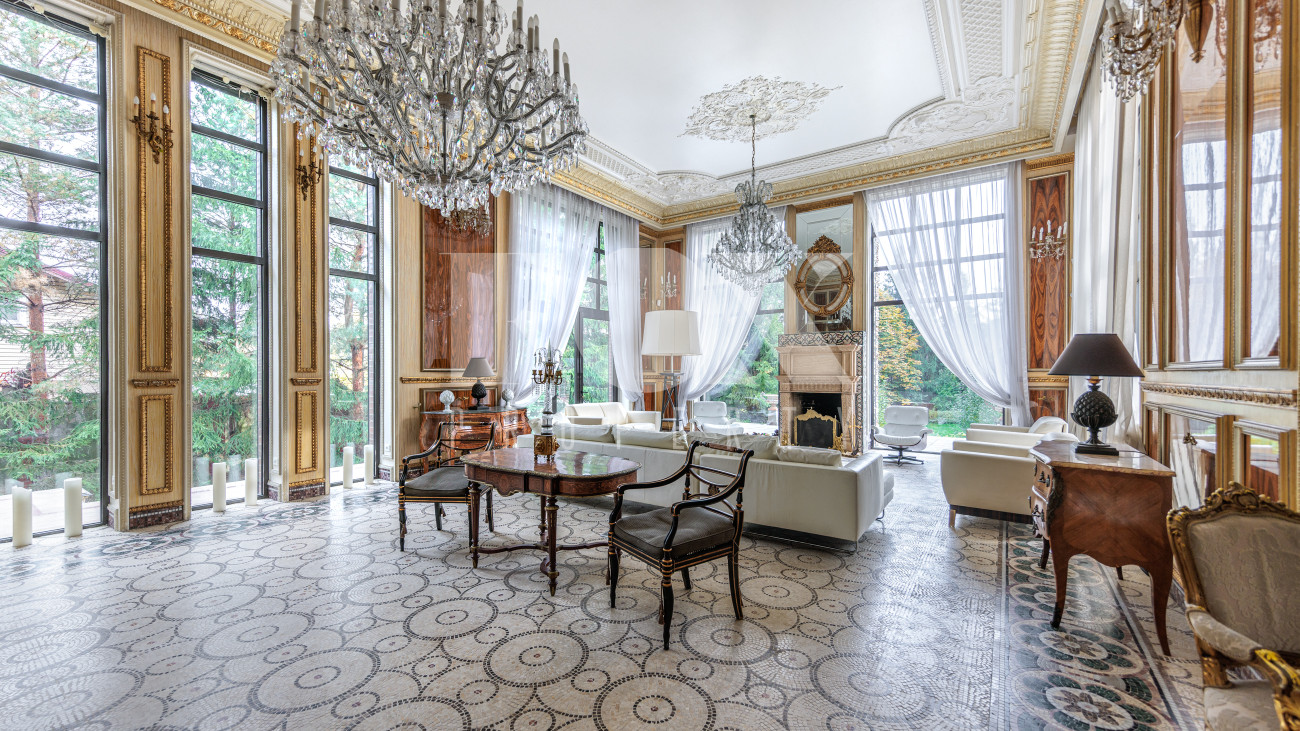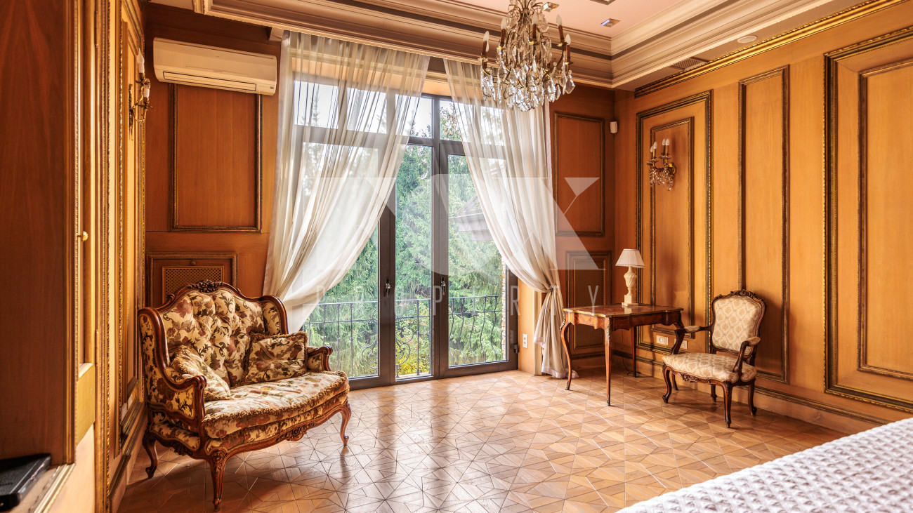 Дом площадью 860 кв.м + гараж с посещением для персонала на 2-м этаже площадью 140 кв.м Расположен на берегу Москвы-реки с великолепным видом на Лохин остров и заповедные ландшафты, на участке 35 соток, утопающем в соснах, фруктовых деревьях и зарослях гортензий. Интерьер дома погружает вас в аутентичную атмосферу мебели и предметов интерьера XVIII–XIX веков с элегантным мостиком к лучшим образцам итальянского дизайна в области мебели, создавая неповторимый ансамбль изысканности и уюта. Первый этаж дома включает просторную гостиную с камином, две кухни, два входа, бассейн, турецкую баню, отдельную комнату свободного назначения и лифт. На втором и третьем этажах расположены 7 комнат и 6 ванных комнат, а также 5 просторных гардеробных, которые могут быть использованы как спальни или для иных целей. Дом оборудован современной системой внутреннего видеонаблюдения, сигнализацией «Гольфстрим» и высокоскоростным оптоволоконным интернетом МГТС. На участке находится отдельный дом с гаражом на две машины, кухней и двумя спальнями, идеально подходящий для гостей или персонала.