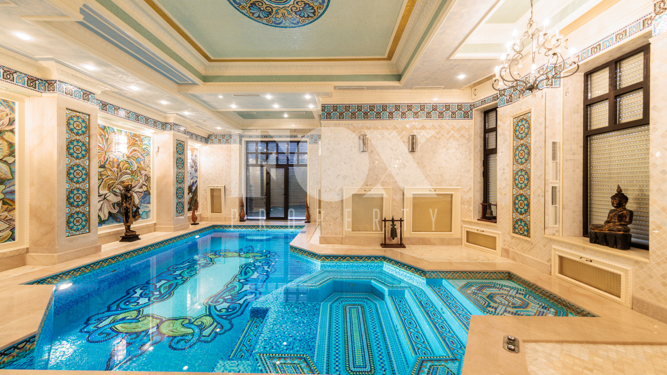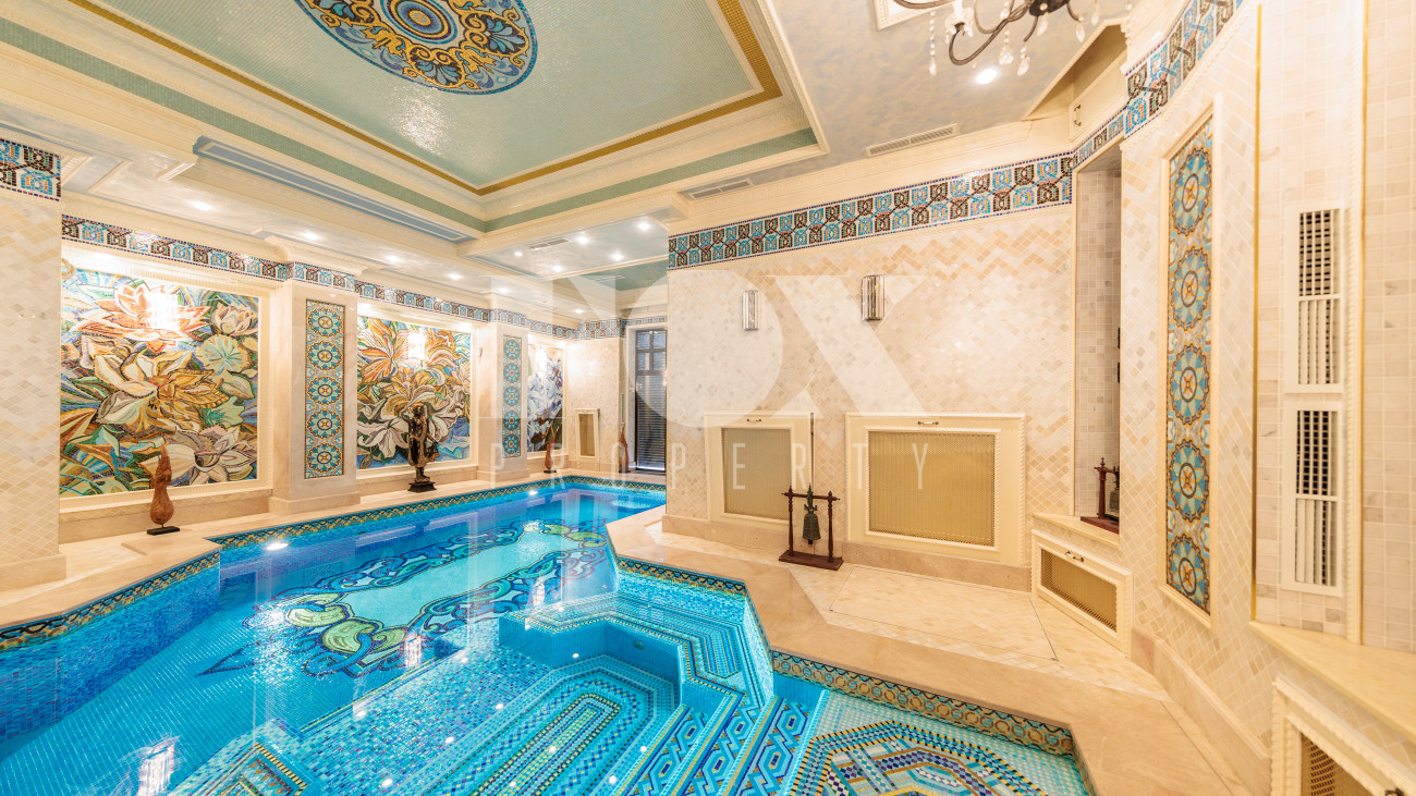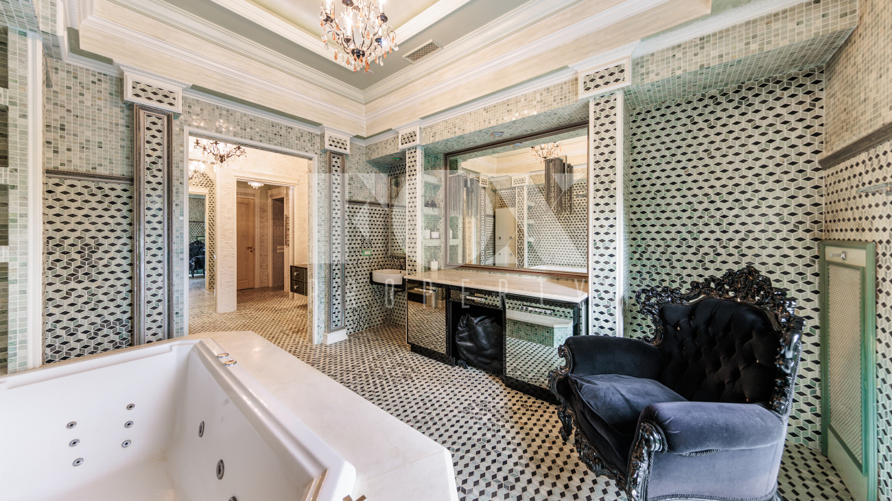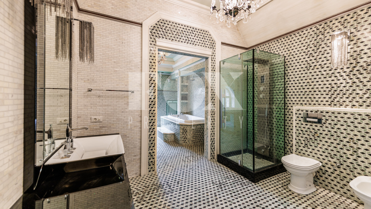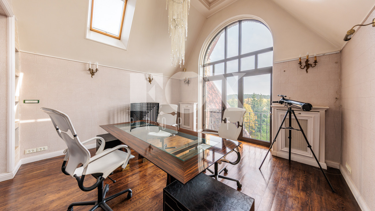 Дом площадью 860 кв.м + гараж с посещением для персонала на 2-м этаже площадью 140 кв.м Расположен на берегу Москвы-реки с великолепным видом на Лохин остров и заповедные ландшафты, на участке 35 соток, утопающем в соснах, фруктовых деревьях и зарослях гортензий. Интерьер дома погружает вас в аутентичную атмосферу мебели и предметов интерьера XVIII–XIX веков с элегантным мостиком к лучшим образцам итальянского дизайна в области мебели, создавая неповторимый ансамбль изысканности и уюта. Первый этаж дома включает просторную гостиную с камином, две кухни, два входа, бассейн, турецкую баню, отдельную комнату свободного назначения и лифт. На втором и третьем этажах расположены 7 комнат и 6 ванных комнат, а также 5 просторных гардеробных, которые могут быть использованы как спальни или для иных целей. Дом оборудован современной системой внутреннего видеонаблюдения, сигнализацией «Гольфстрим» и высокоскоростным оптоволоконным интернетом МГТС. На участке находится отдельный дом с гаражом на две машины, кухней и двумя спальнями, идеально подходящий для гостей или персонала.