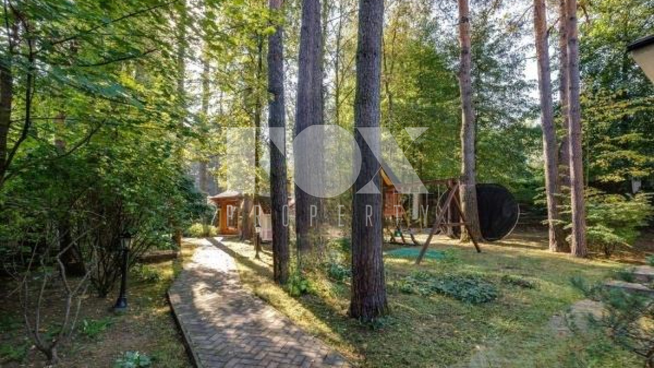 На участке проведены ландшафтные работы, сохранены все лесные деревья, вымощены дорожки, установлено освещение, оборудована детская зона, установлена беседка с зоной барбекю. К дому примыкает гараж на 2 м/м, отдельно расположен дом для персонала (кухня, спальня, с/у).
