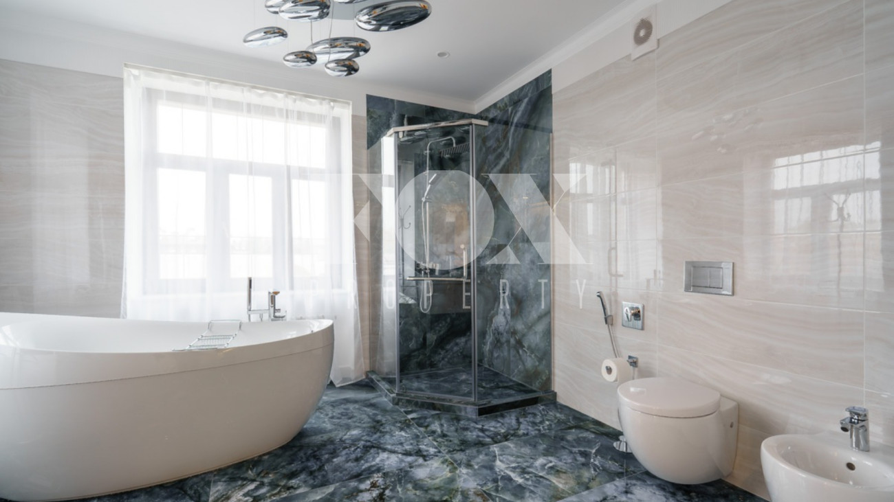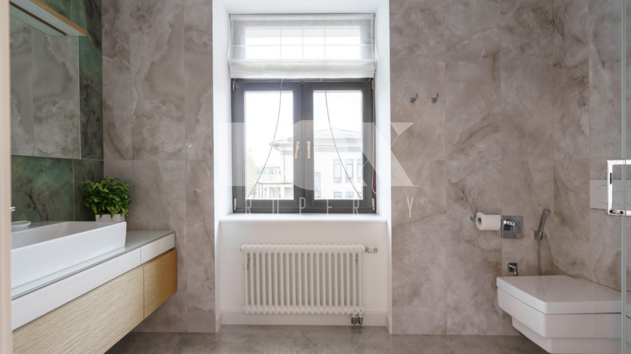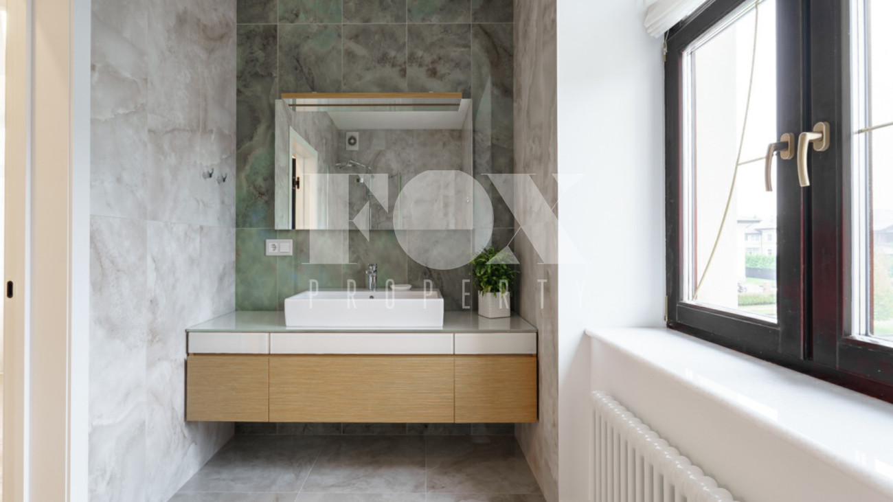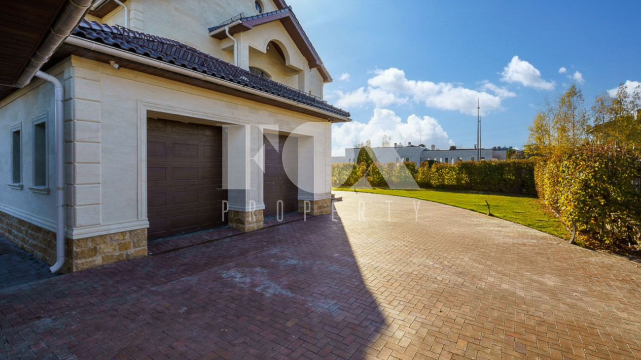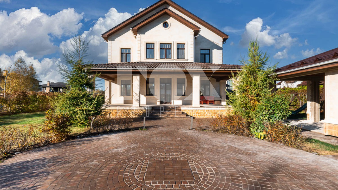 Загородный дом площадью 450 м² построен на полевом участке 18,3 сотки в охраняемом КП "Монтевиль". Внутри спланировали 3 спальни со своими гардеробными и санузлами, кабинет, просторную кухню- столовую, гостиную с камином и выходом на крытую террасу. В контуре дома предусмотрены гараж на 2 машины и котельная с отдельным входом. Рядом расположен навес на 2 машины и отдельно стоящая баня с купелью и комнатой отдыха.