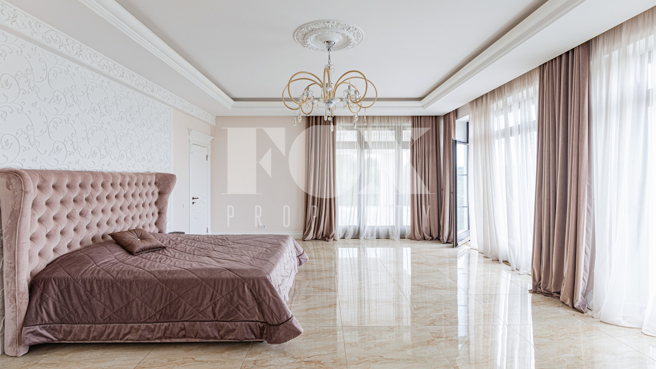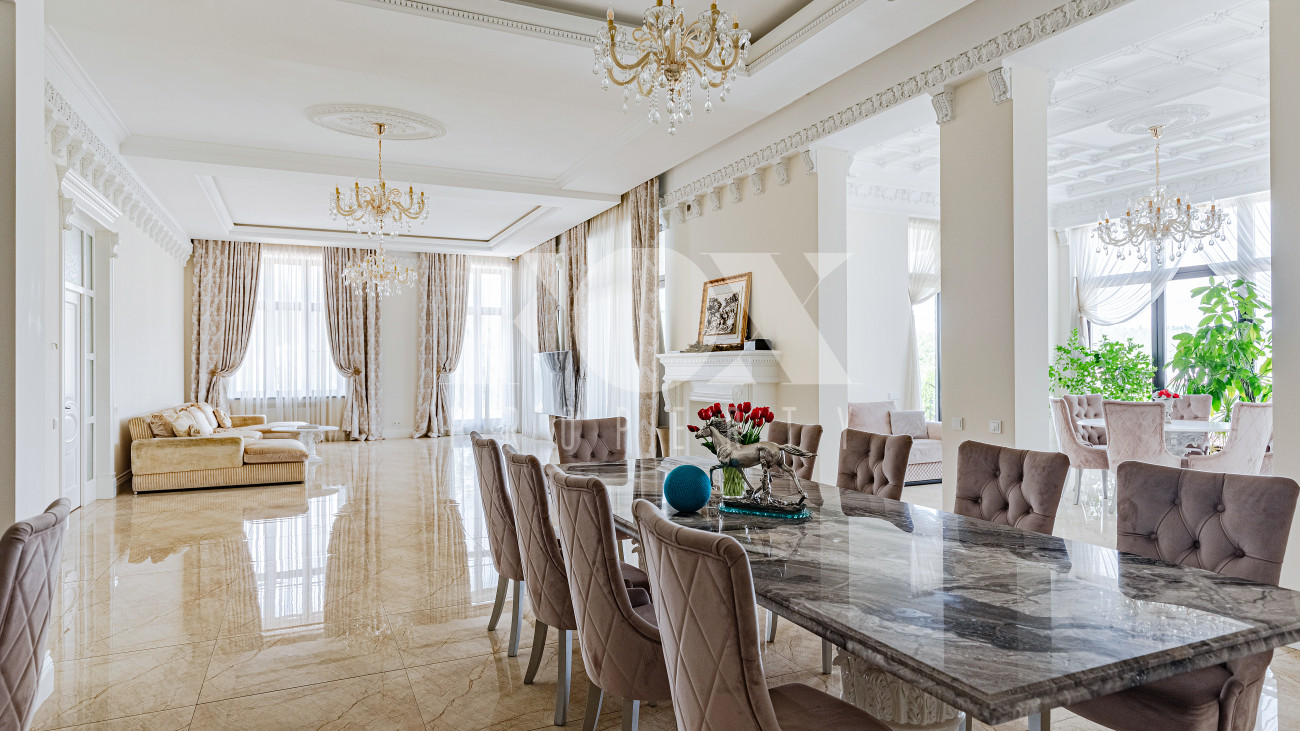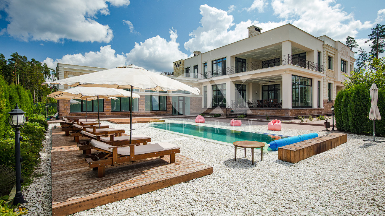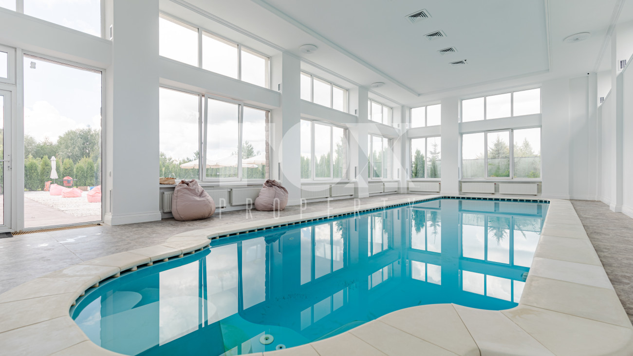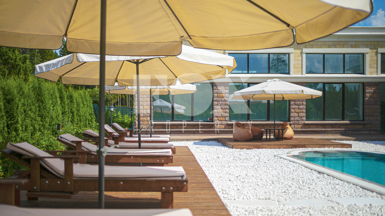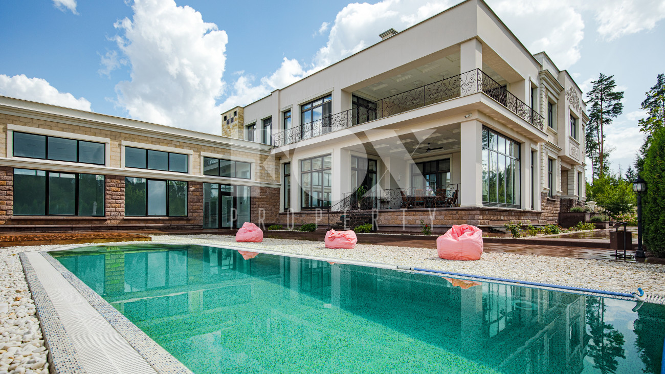 Много спален, огромные террасы, 2 бассейна: крытый и уличный с подогревом, шезлонгами и зоной отдыха! Есть лифт, который может доставить вас на эксплуатируемую кровлю, с которой открываются еще более потрясающие виды на природу! Встроенный пылесос. Все полы с подогревом. Внутреннее оформление выполнено в спокойной классике. Грамотная планировка. Предусмотрен встроенный гараж для 4-х автомобилей, над которым располагается 4-комнатная квартира для персонала с отдельным входом. Удобный секретный выезд с участка на Новорижское шоссе только для собственников усадьбы!