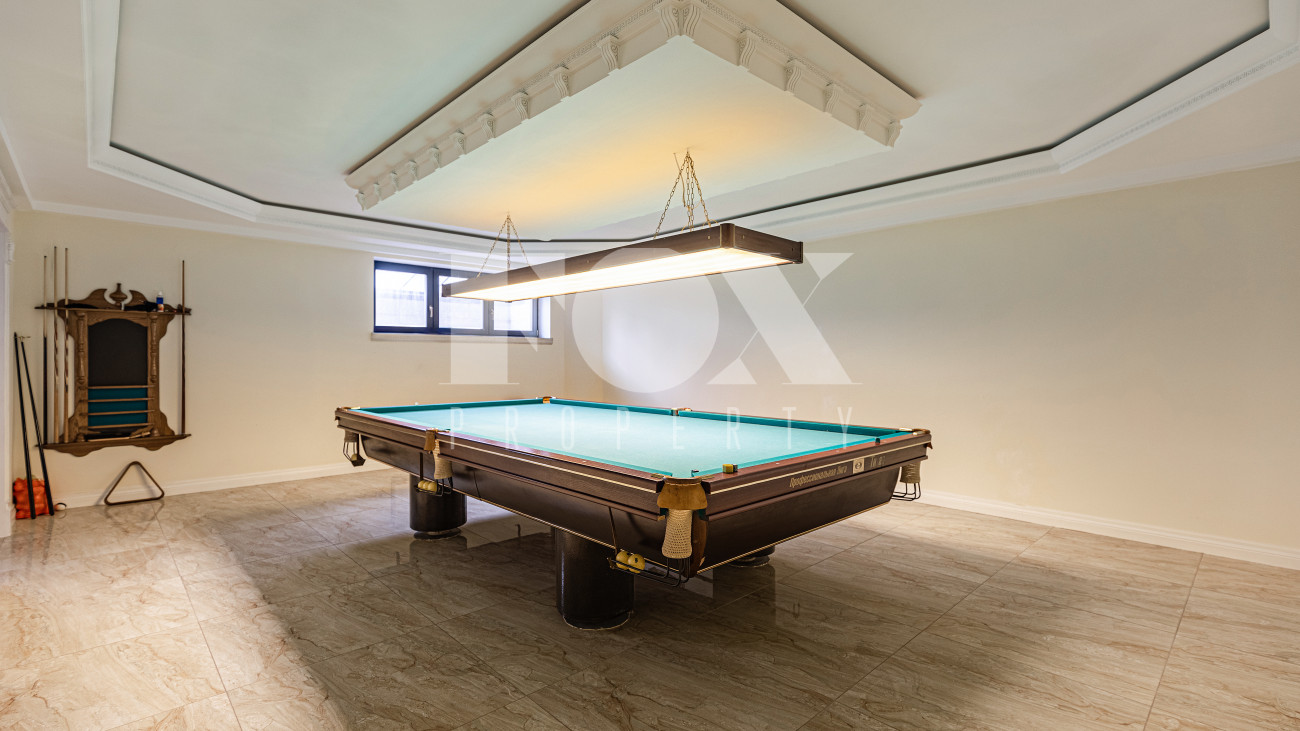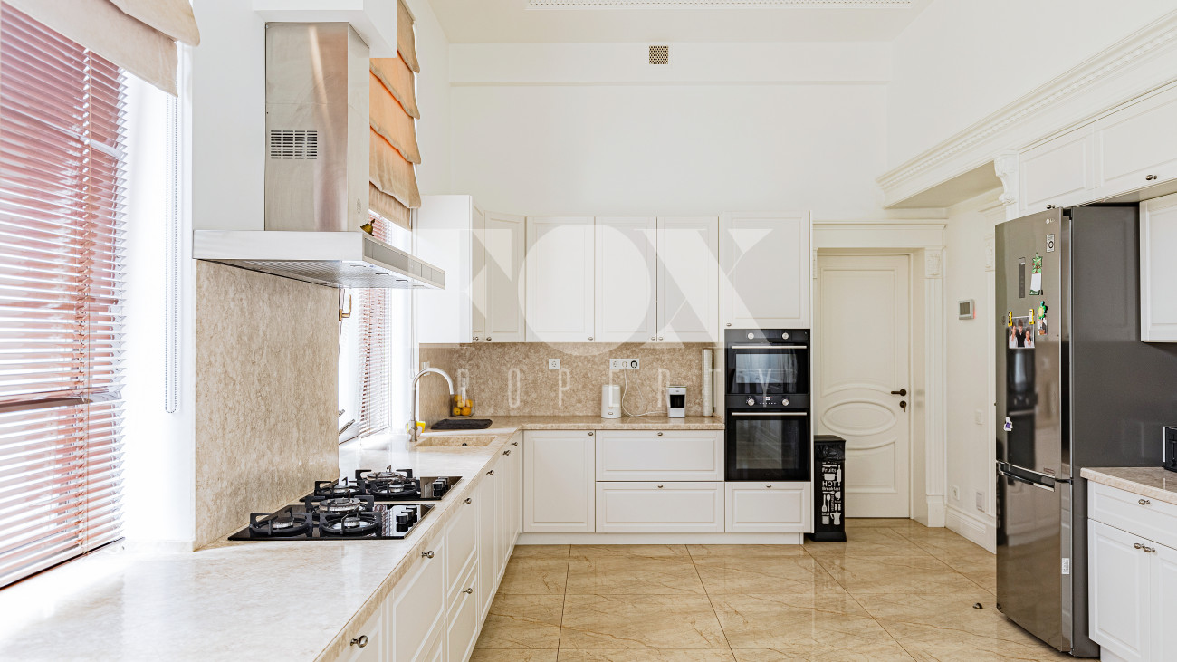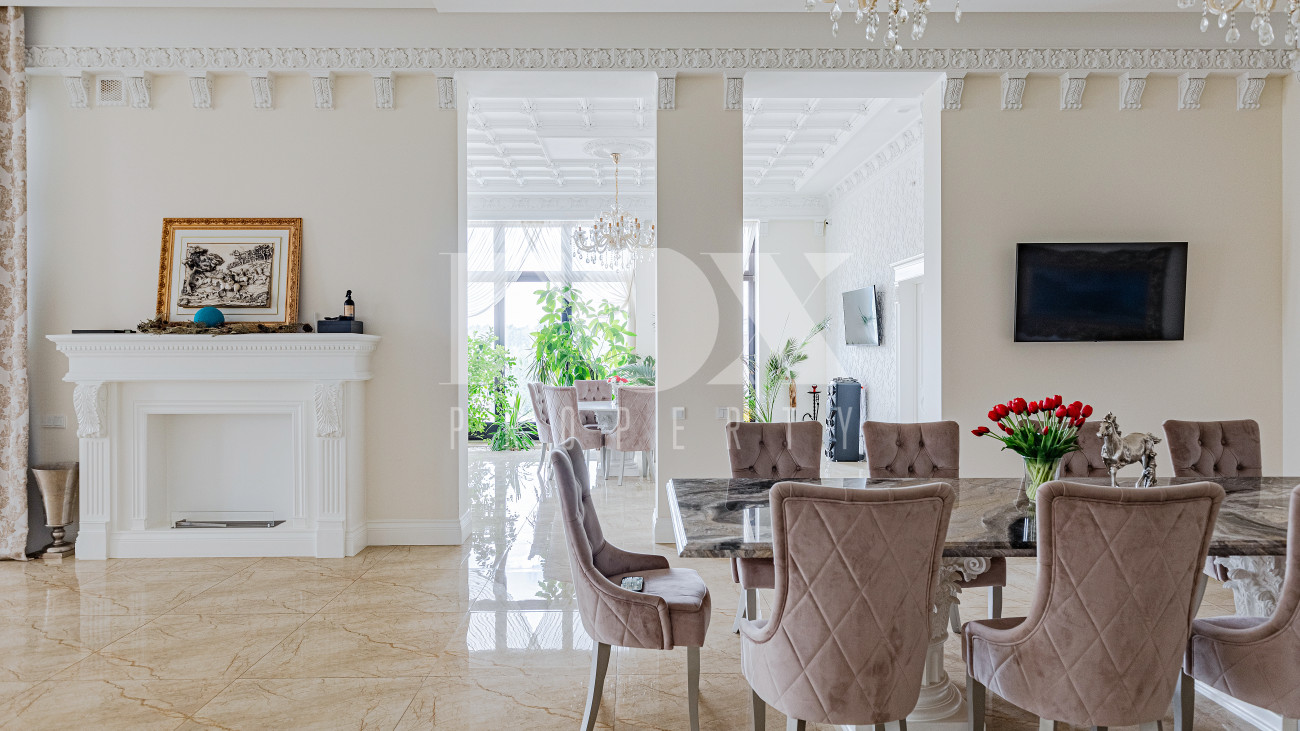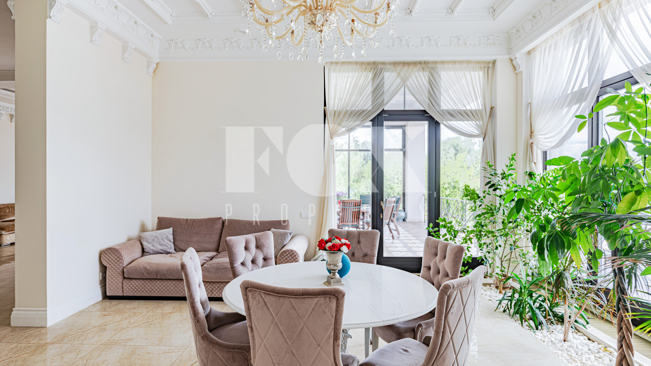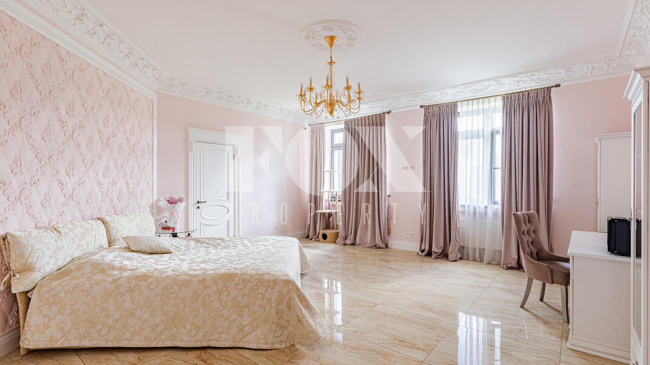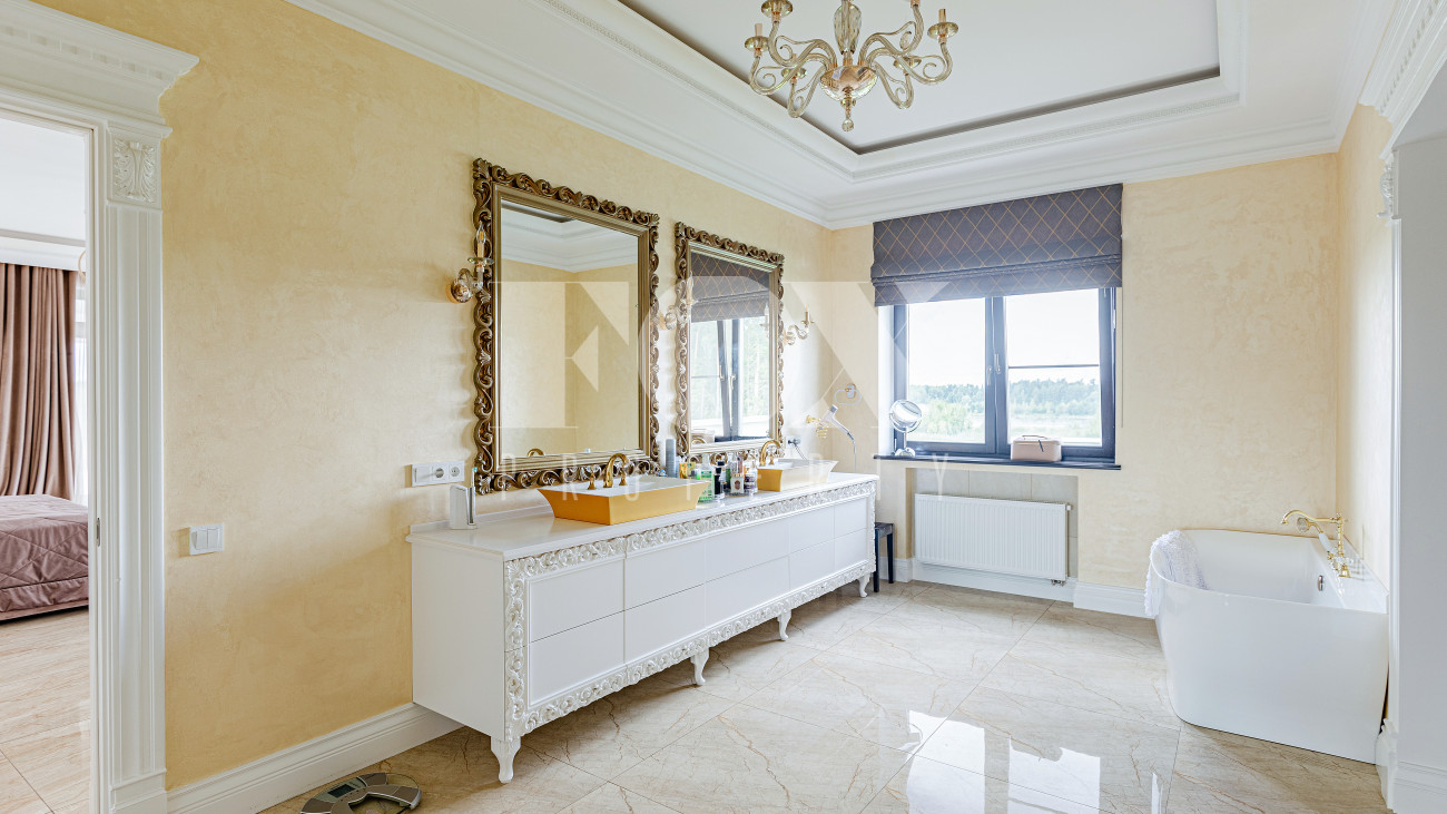 Много спален, огромные террасы, 2 бассейна: крытый и уличный с подогревом, шезлонгами и зоной отдыха! Есть лифт, который может доставить вас на эксплуатируемую кровлю, с которой открываются еще более потрясающие виды на природу! Встроенный пылесос. Все полы с подогревом. Внутреннее оформление выполнено в спокойной классике. Грамотная планировка. Предусмотрен встроенный гараж для 4-х автомобилей, над которым располагается 4-комнатная квартира для персонала с отдельным входом. Удобный секретный выезд с участка на Новорижское шоссе только для собственников усадьбы!