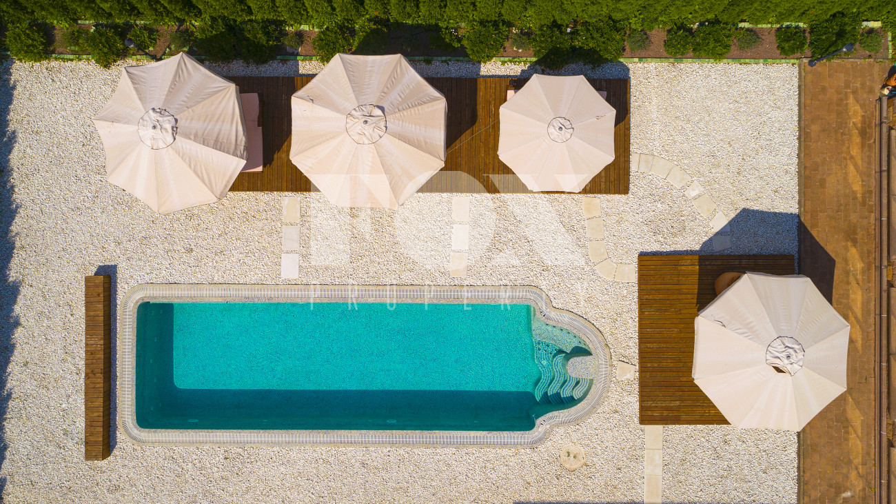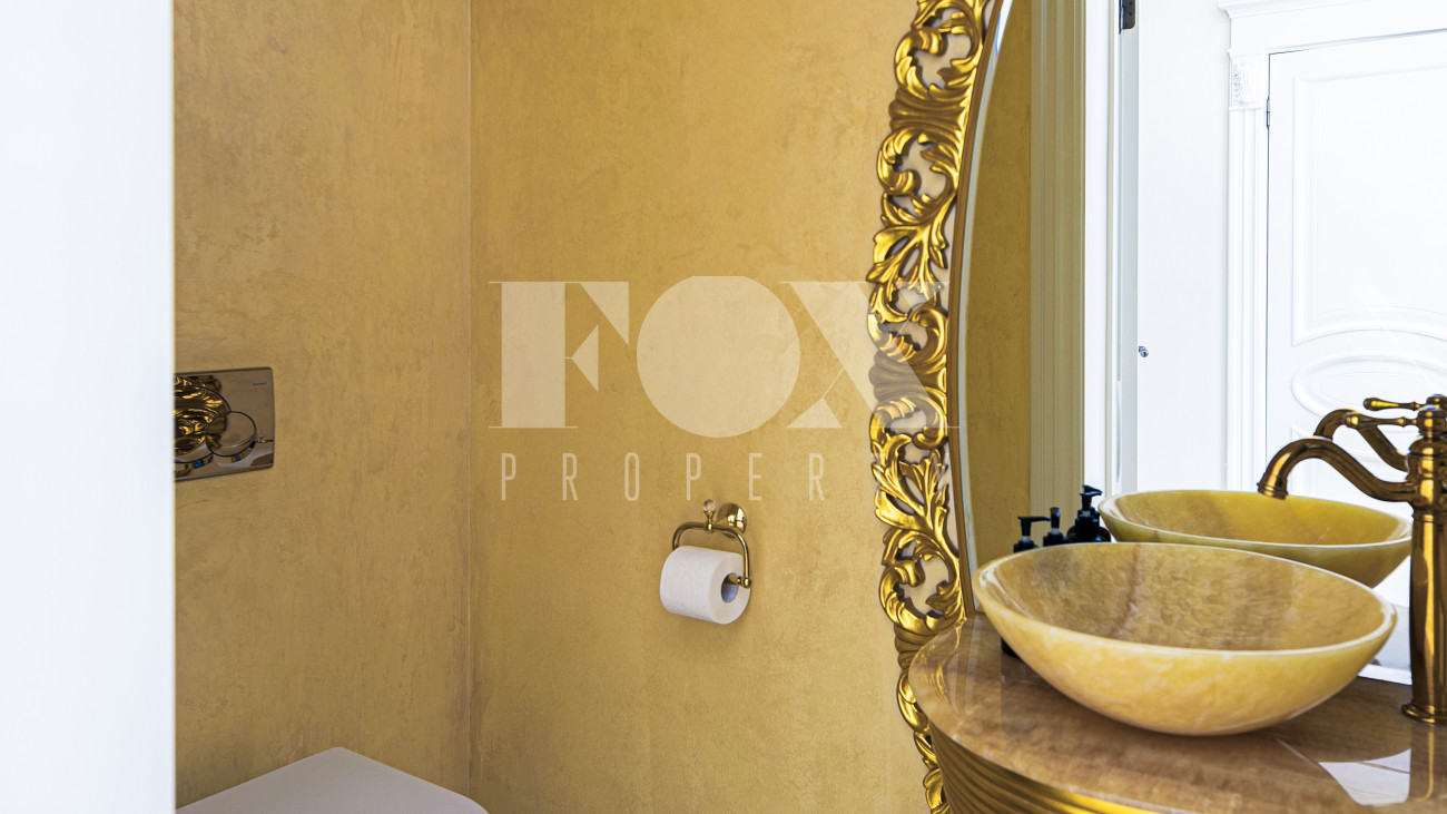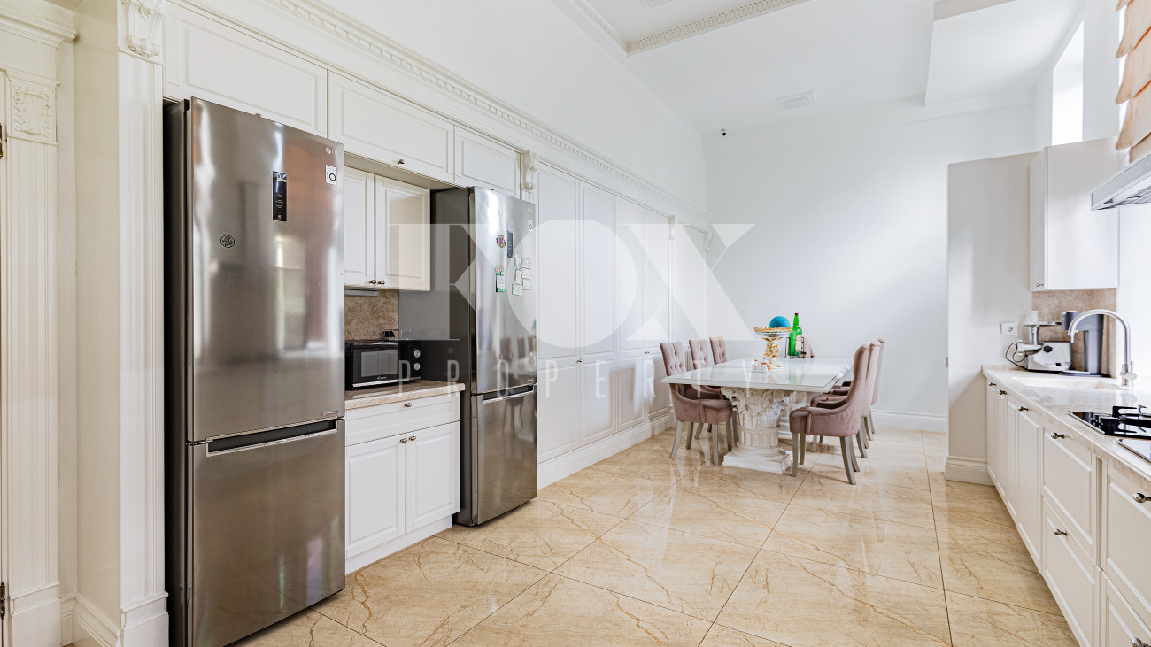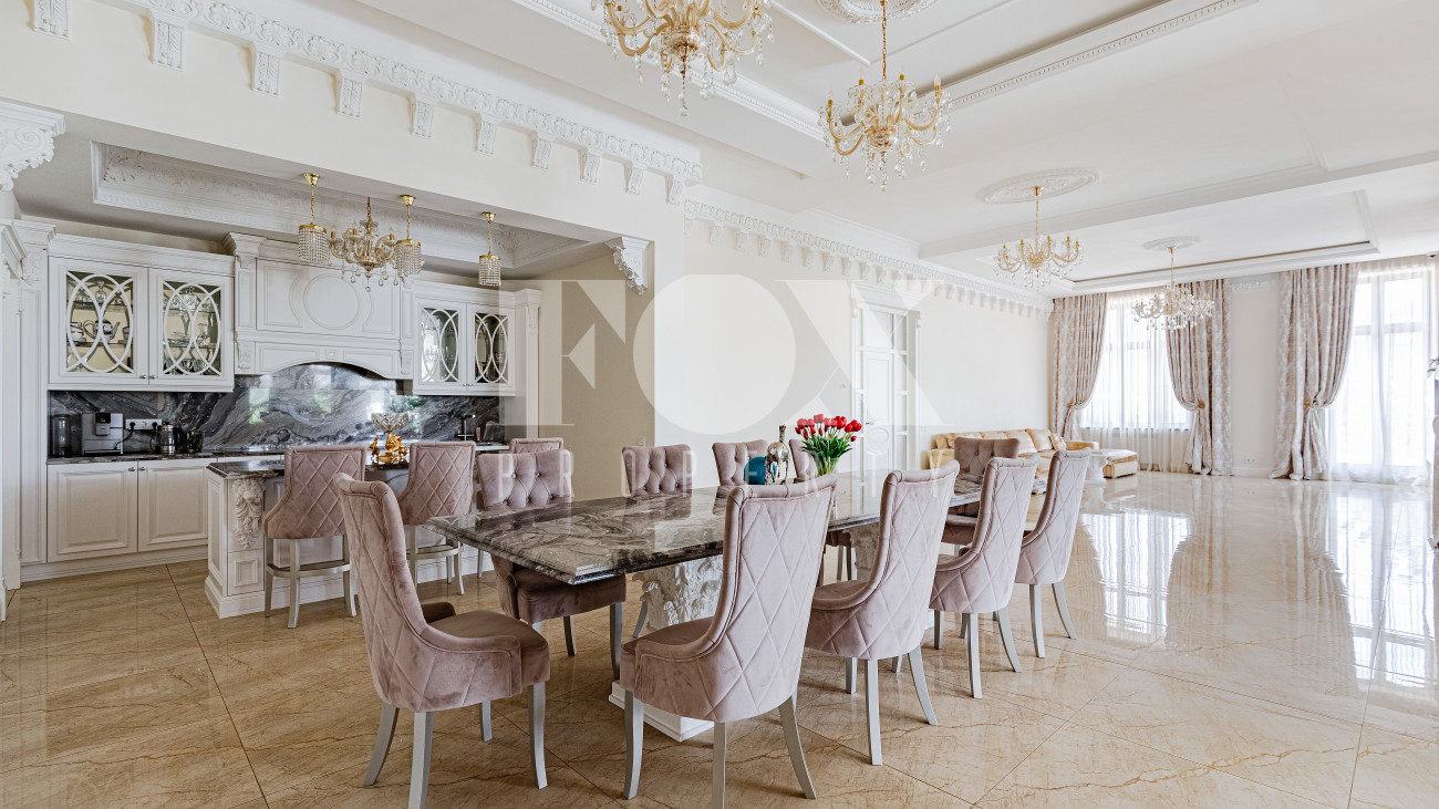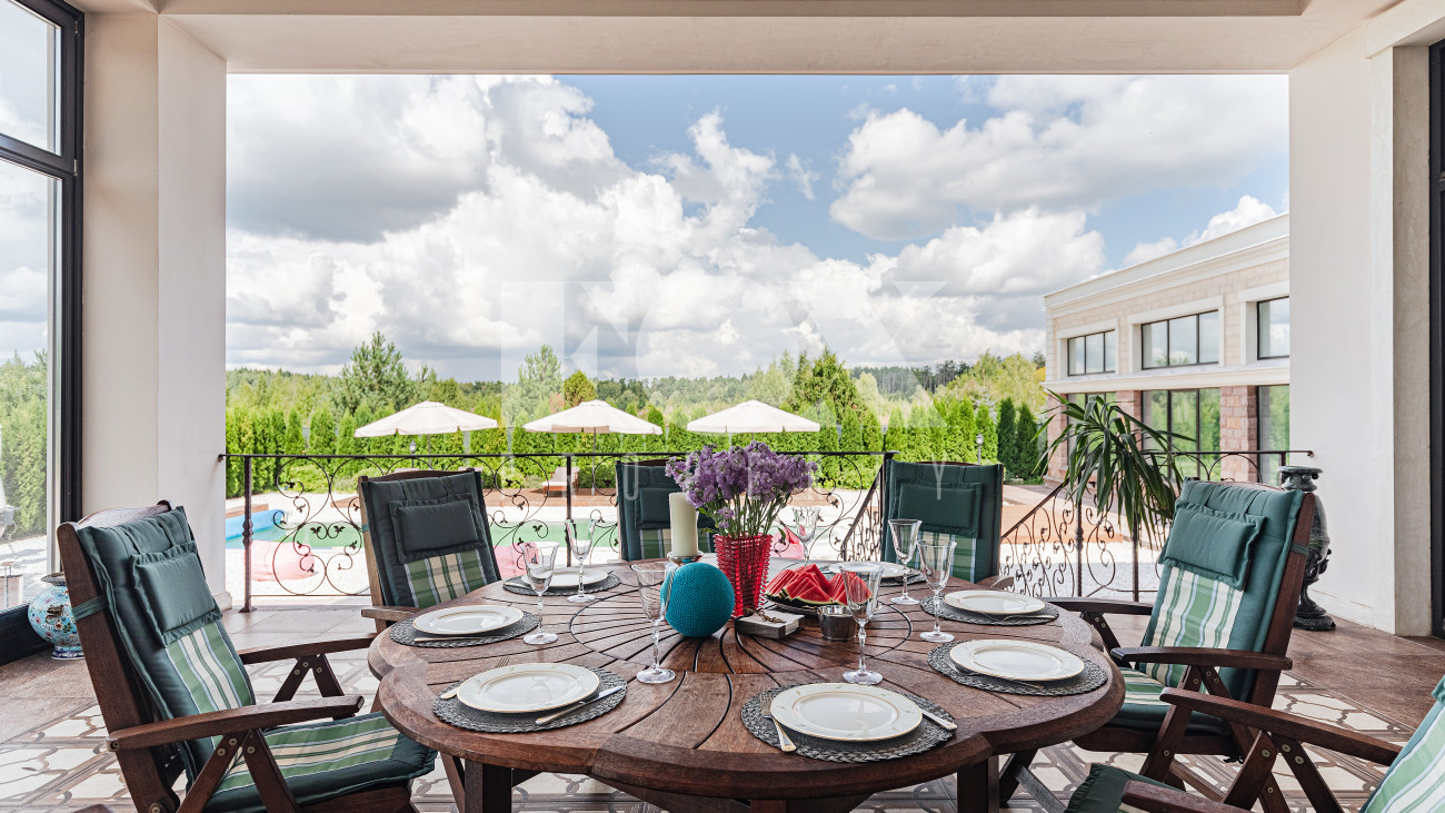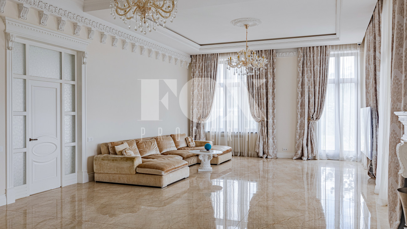 Много спален, огромные террасы, 2 бассейна: крытый и уличный с подогревом, шезлонгами и зоной отдыха! Есть лифт, который может доставить вас на эксплуатируемую кровлю, с которой открываются еще более потрясающие виды на природу! Встроенный пылесос. Все полы с подогревом. Внутреннее оформление выполнено в спокойной классике. Грамотная планировка. Предусмотрен встроенный гараж для 4-х автомобилей, над которым располагается 4-комнатная квартира для персонала с отдельным входом. Удобный секретный выезд с участка на Новорижское шоссе только для собственников усадьбы!