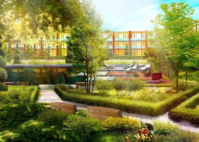 Около центрального парка планируется построить ресторан с летней верандой. Из панорамных окон ресторана будет открываться впечатляющий вид на спускающиеся террасами зеленые зоны, искусственные водоемы и мощеные дорожки, формирующие оригинальный геометрический орнамент. На специально отведенных площадках можно будет провести турнир по волейболу или позагорать, с комфортом расположившись на шезлонгах и в гамаках.