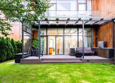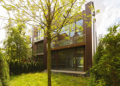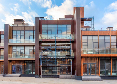 Фасады домов в поселке «Футуро парк» выполнены из долговечных композитных HPL панелей с покрытием «под дерево». Также установлены панорамные окна в пол с алюминиевым профилем.