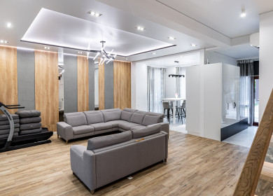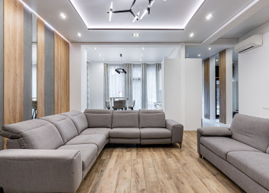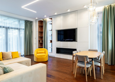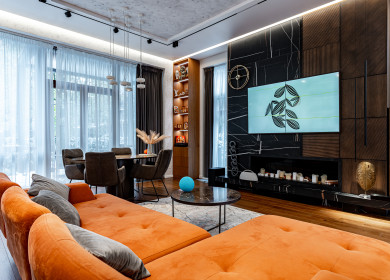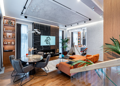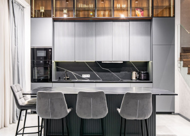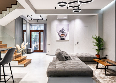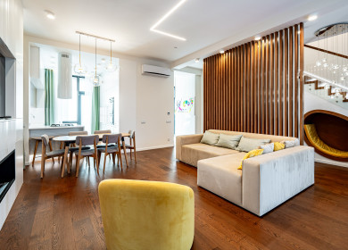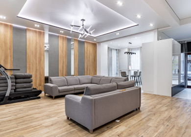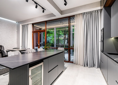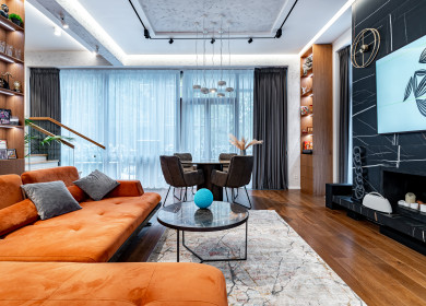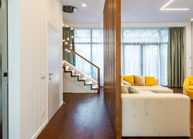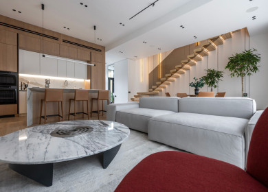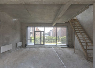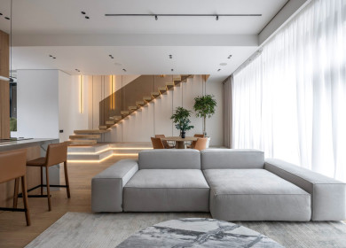 1-й тип: Секция 168,5 кв. м. Жилая площадь двухэтажного таунхауса составляет около 140 кв. м. Окна в пол, обращенные на противоположные стороны света, в сочетании с высокими (3,2-3,3 м) потолками зрительно увеличивают объем помещений. Эксплуатируемая кровля – это 50 кв. м. под открытым небом, где с комфортом смогут отдыхать все члены семьи.
