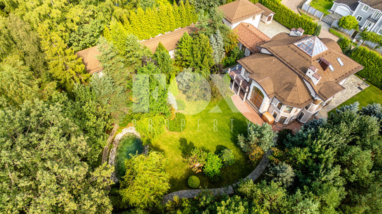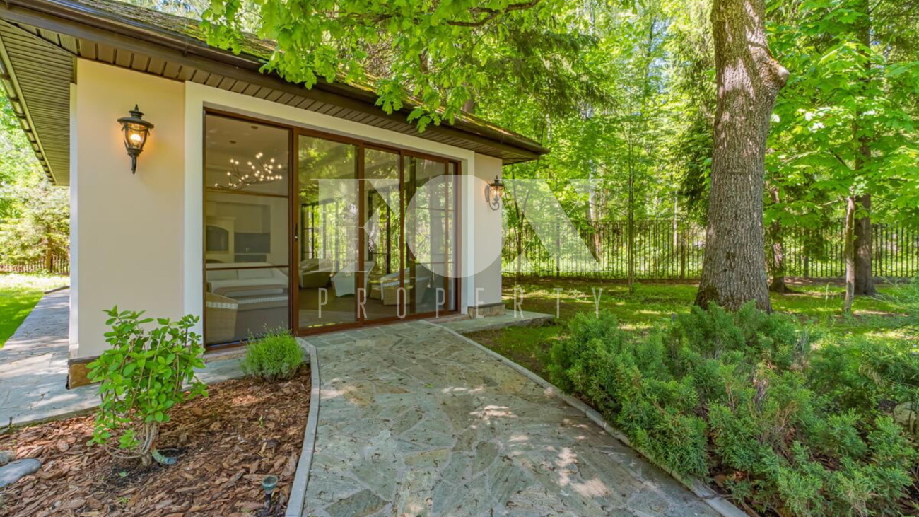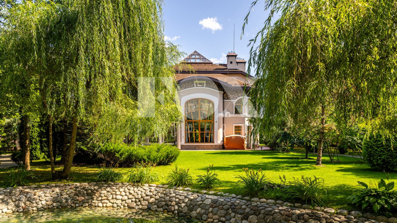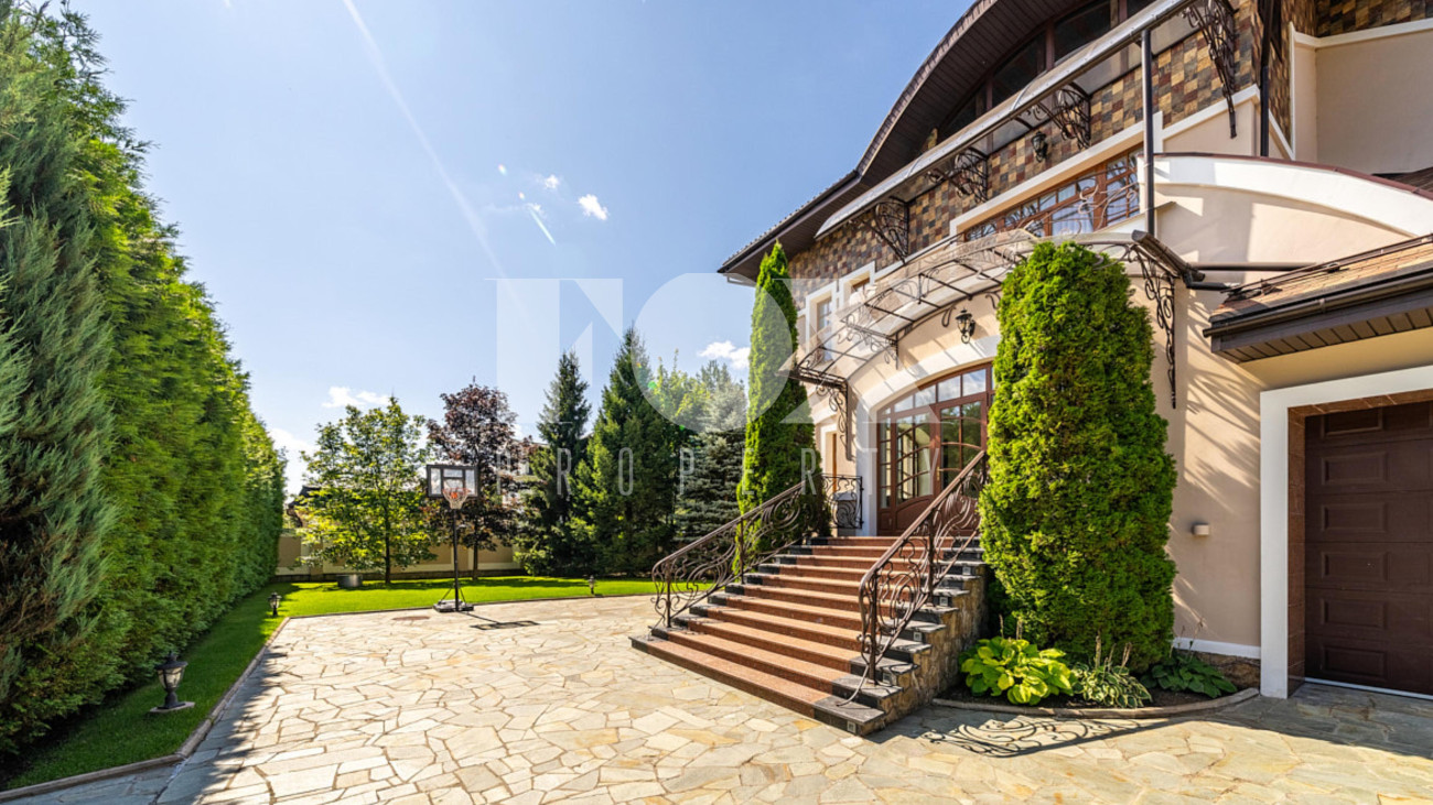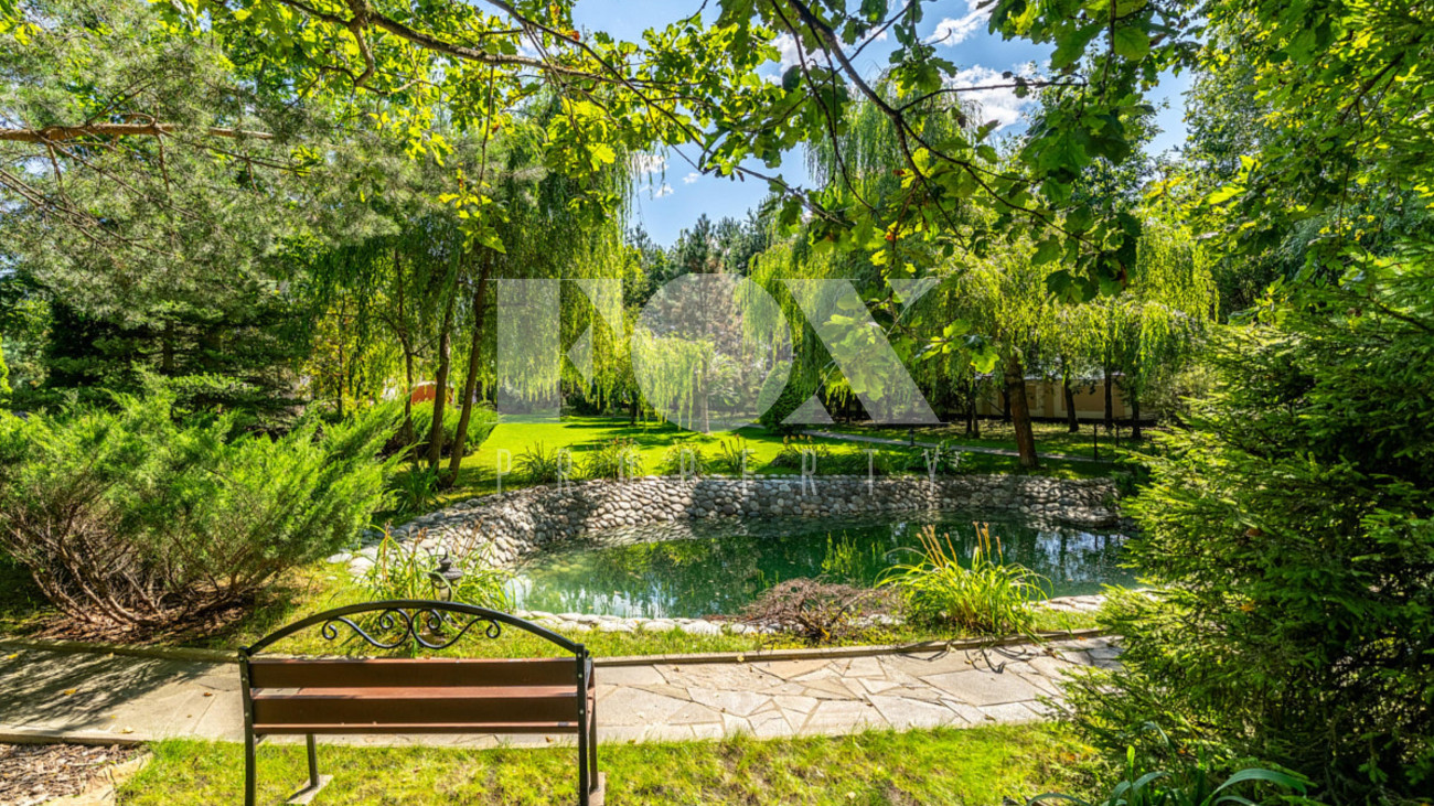 На участке выполнен ландшафтный дизайн, посажены: декоративные растения и кустарники, 5 видов сосен, кедр, пихты. Тротуары вымощены камнем и гранитом, установлено ландшафтное освещение. В центре участка находится декоративный пруд голубиной 3 метра с ручьем и водопадом.