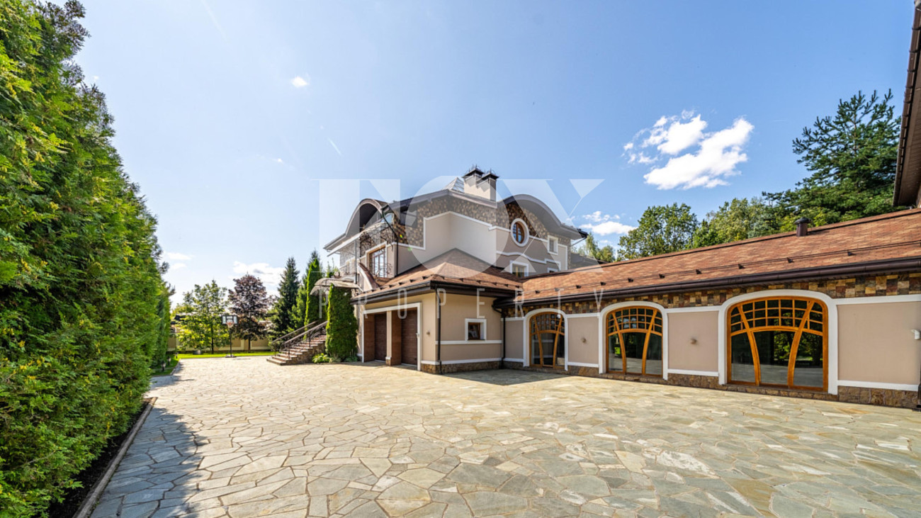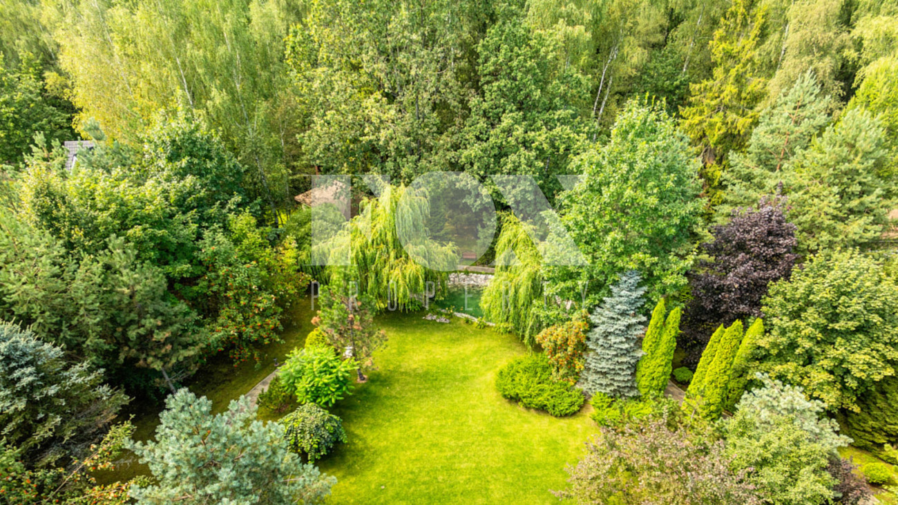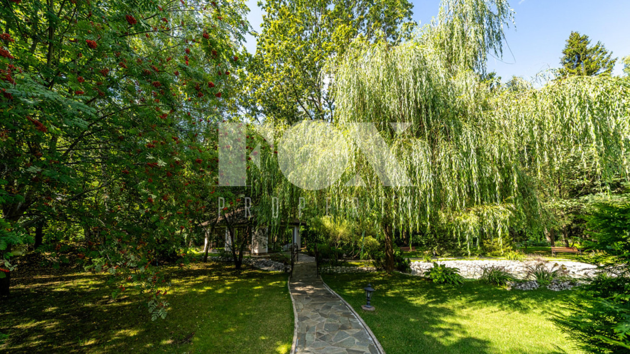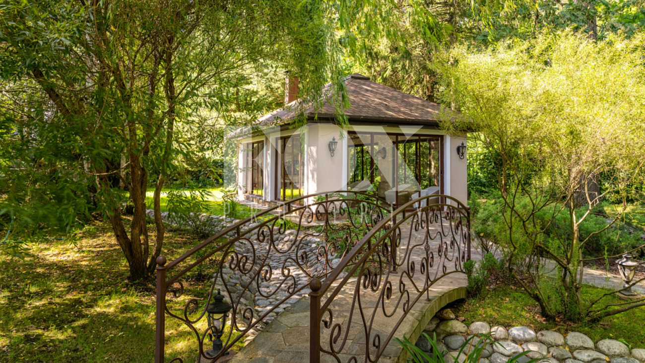 На участке выполнен ландшафтный дизайн, посажены: декоративные растения и кустарники, 5 видов сосен, кедр, пихты. Тротуары вымощены камнем и гранитом, установлено ландшафтное освещение. В центре участка находится декоративный пруд голубиной 3 метра с ручьем и водопадом.