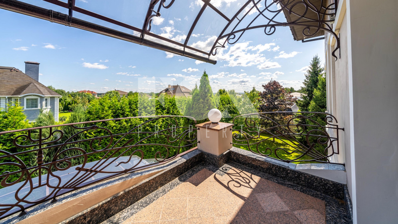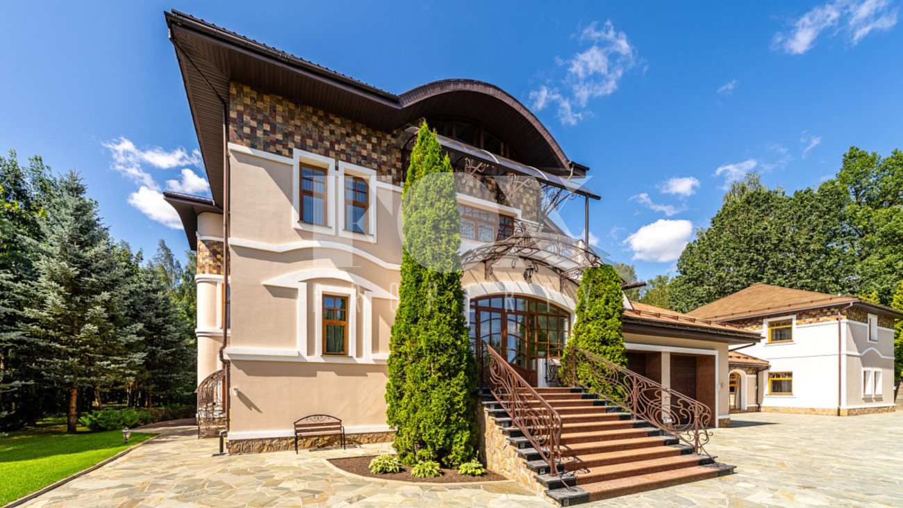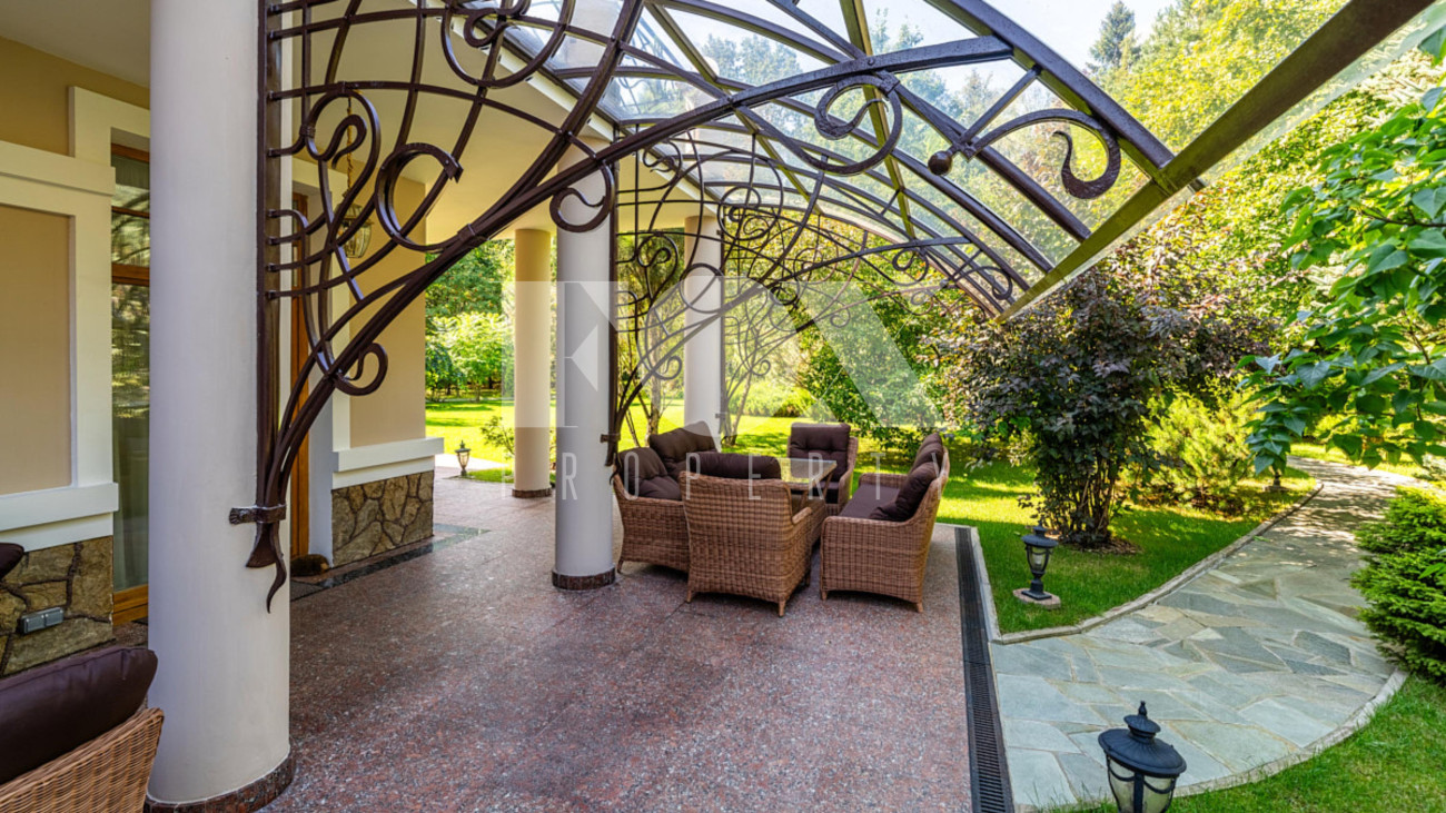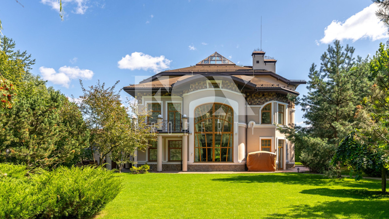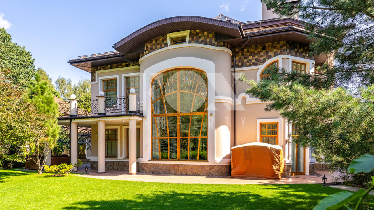 На участке выполнен ландшафтный дизайн, посажены: декоративные растения и кустарники, 5 видов сосен, кедр, пихты. Тротуары вымощены камнем и гранитом, установлено ландшафтное освещение. В центре участка находится декоративный пруд голубиной 3 метра с ручьем и водопадом.