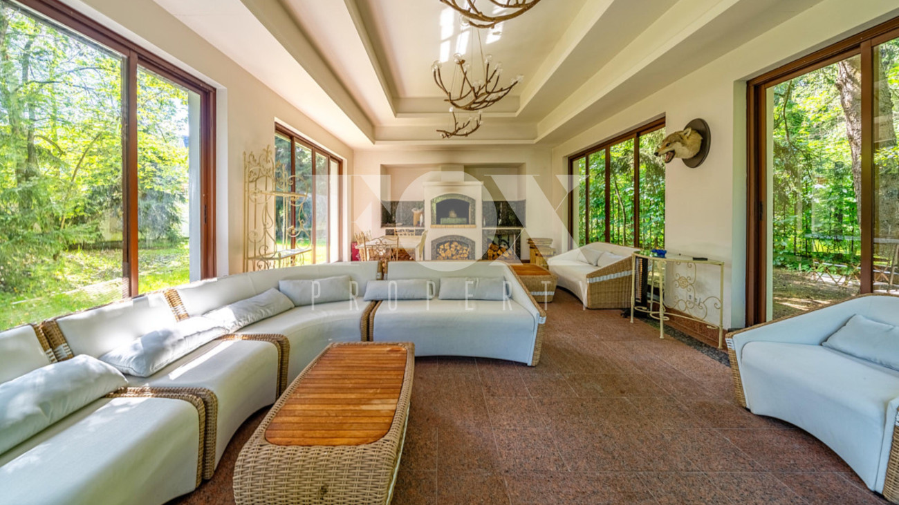 На участке помимо основного дома построены беседка с печью для приготовления блюд, дом для персонала, и гараж для мототехники.