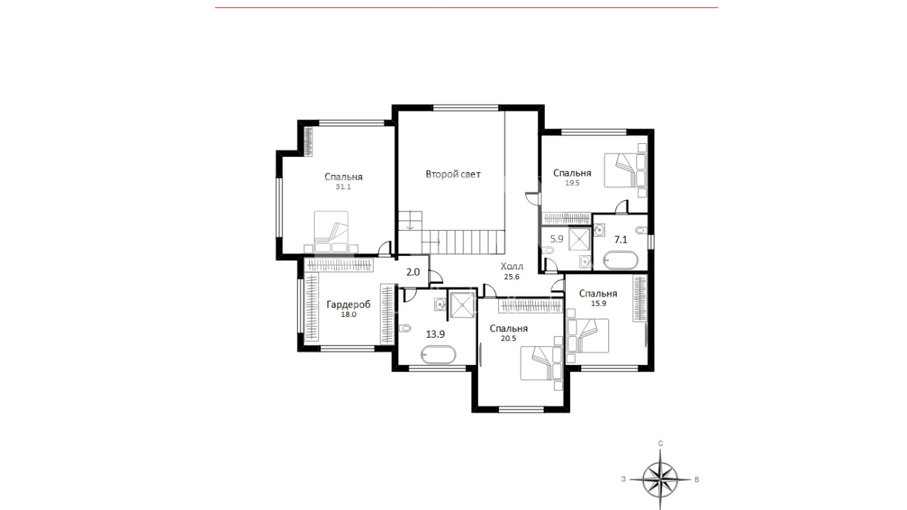 В доме предусмотрен просторный зал с высокими потолками 6,4 метра, спальни с потолками 3,2 метра.