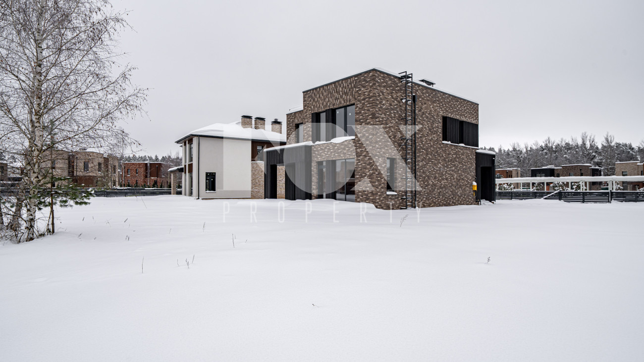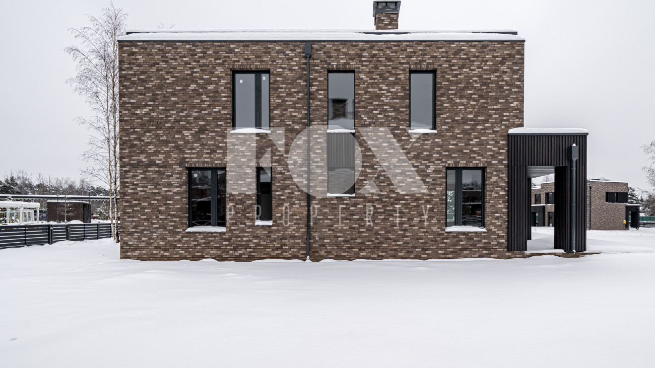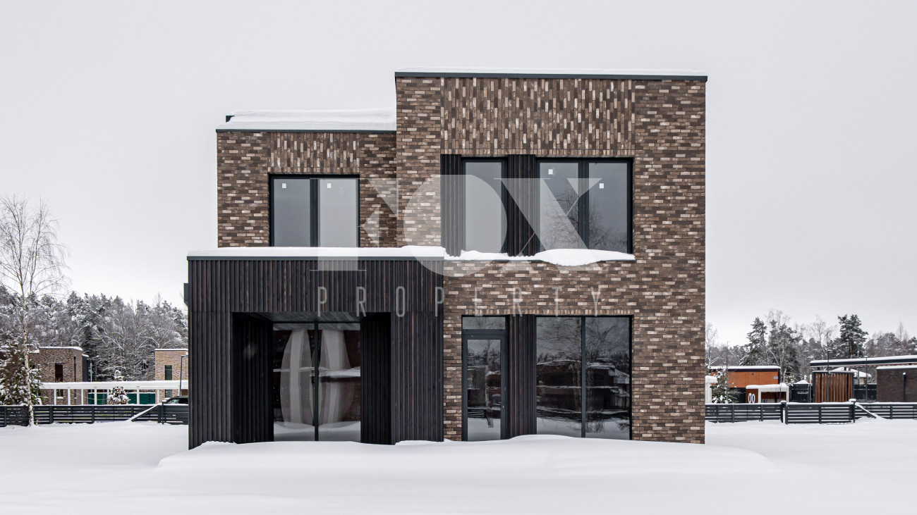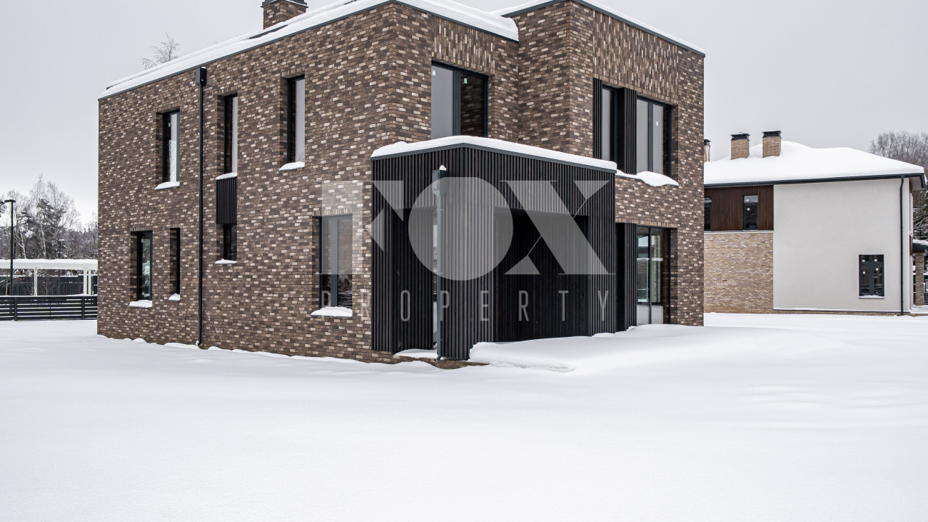 Архитектура дома выполнена в современном стиле с элементами скандинавского подхода – с чёткой геометрией объёмов и выверенными пропорциями. Фасад сочетает клинкерный кирпич и натуральную лиственницу, формируя спокойный, лаконичный образ. Большая площадь остекления усиливает связь дома с природным окружением и наполняет внутренние помещения естественным светом.