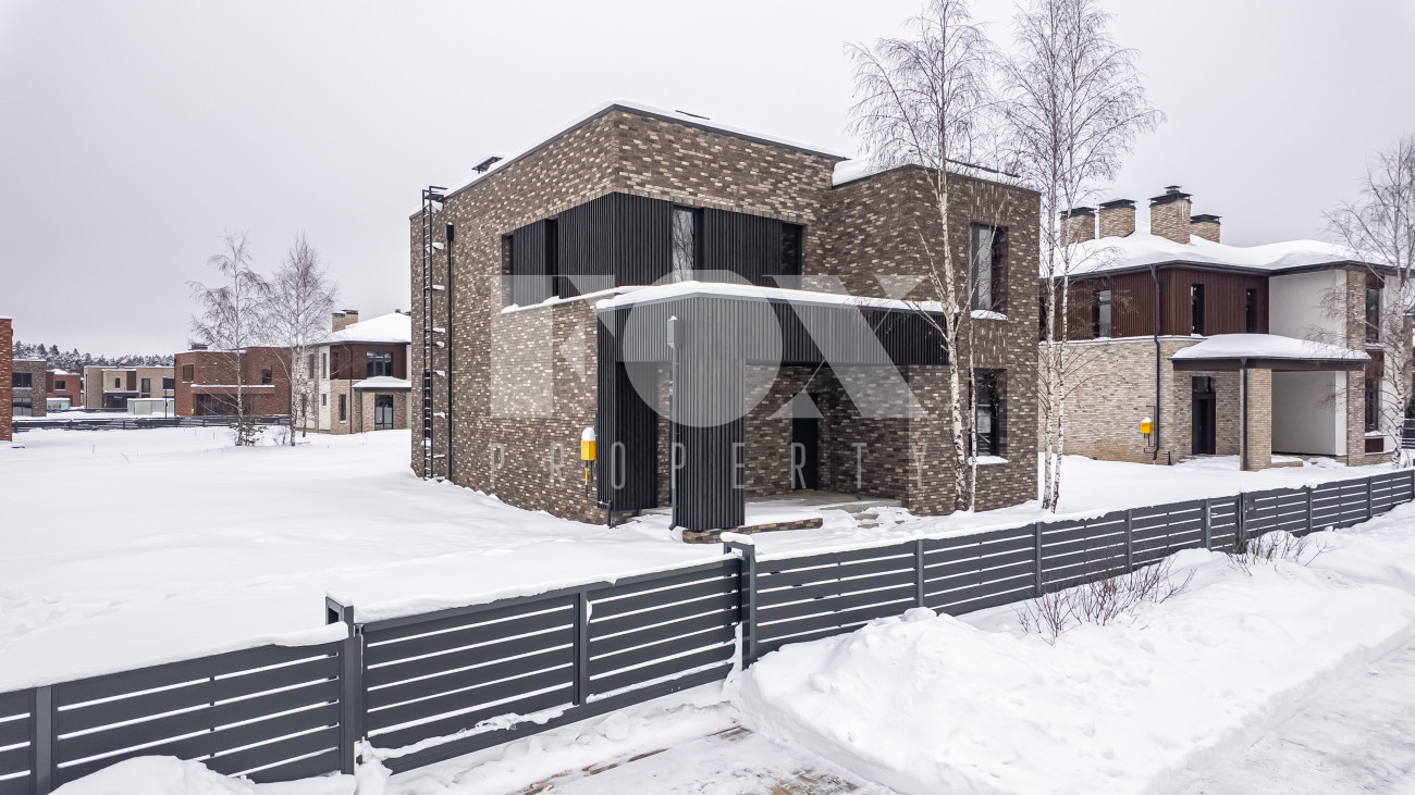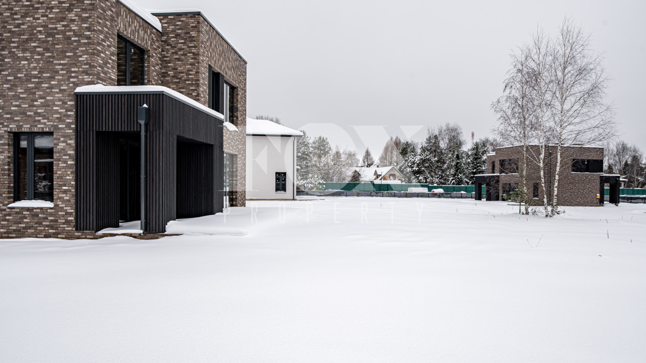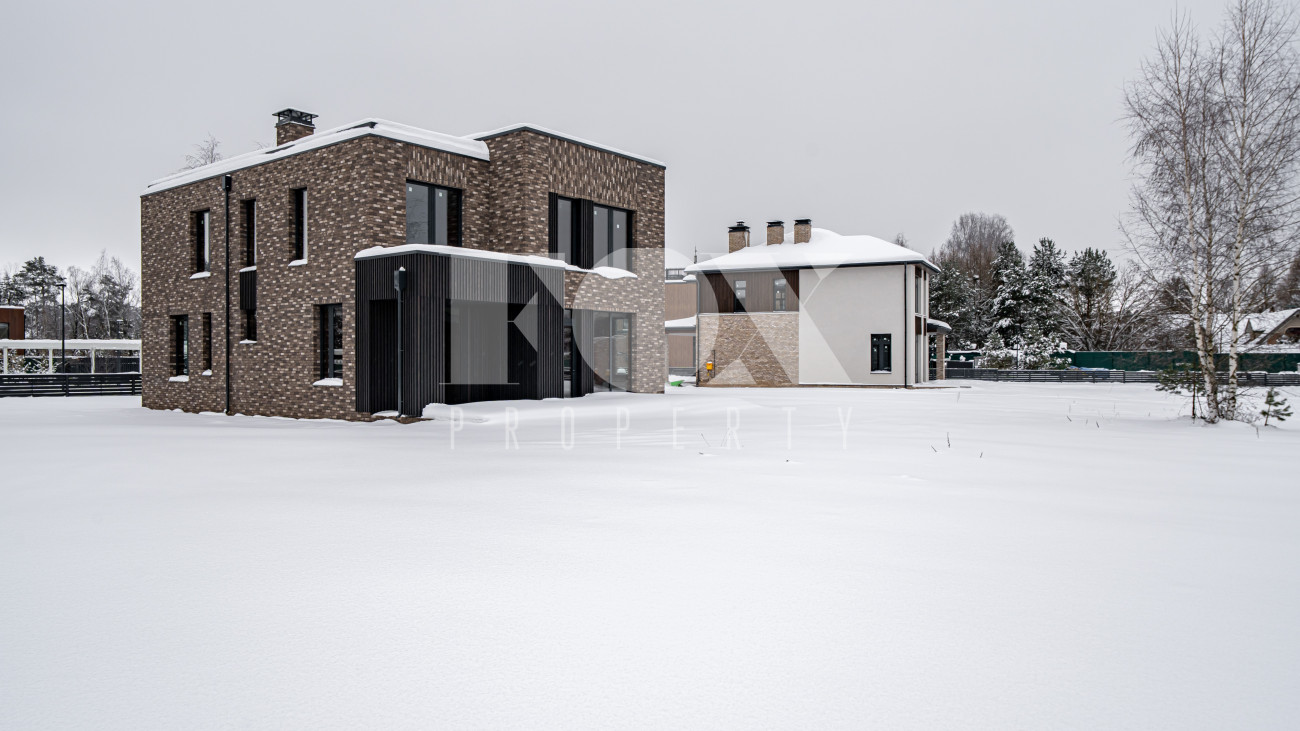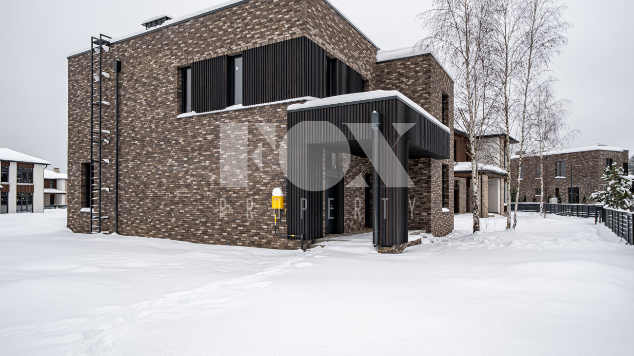 Архитектура дома выполнена в современном стиле с элементами скандинавского подхода – с чёткой геометрией объёмов и выверенными пропорциями. Фасад сочетает клинкерный кирпич и натуральную лиственницу, формируя спокойный, лаконичный образ. Большая площадь остекления усиливает связь дома с природным окружением и наполняет внутренние помещения естественным светом.