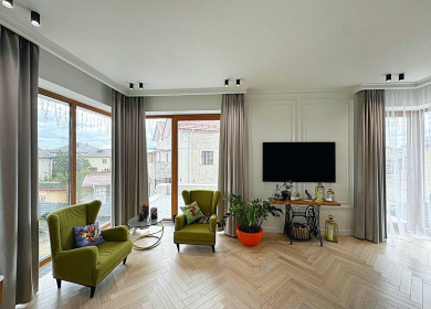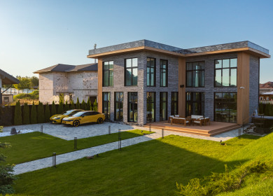 Современный дом в приватной части охраняемого коттеджного поселка. Минималистичная архитектура домов в сочетании с природными материалами: камень, эксклюзивная штукатурка, деревянные ламели из ценной породы дерева, терраса с видовыми планами на эксплуатируемой кровле, патио с выходом в приватную зона участка. Центральные коммуникации.