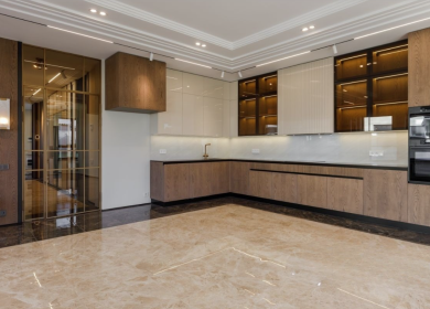 камень, со встроенной техникой: газовая варочная панель AEG, духовой шкаф Kupperbusch, посудомоечная машина Bosch, холодильник Maytag (США)). Люстры из Италии.