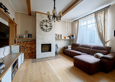 Отделка выполнена из дорогостоящих материалов, преимущественно импортных в стиле неоклассика. Полы: в гостиной и спальнях - массив половой доски (дуб), в кухне-столовой - мрамор с водяным подогревом, в санузлах и в цоколе - керамогранит с водяным подогревом, на мансарде - ламинат. Деревянная лестница (массив бука,) стандартной ширины, поручни - массив бука, балясины металлические, художественная ковка. Подвесные ГКЛ многоуровневые с различной подсветкой. Установлена сантехника ведущих немецких брэндов (Kohler, Tece, Duravit). Все коммуникации разведены, радиаторы дизайнерские трубчатые стальные хромированные, э/э марки Bticino (Италия) с возможностью интеграции в систему "Умный дом". Двери межкомнатные деревянные из массива дуба (Италия), входная группа с витражами. Подоконники - натуральный камень травертин, мрамор. Камин круглый со стеклянной дверцей гильотинного типа (Германия). В холле на потолке витраж с подсветкой.