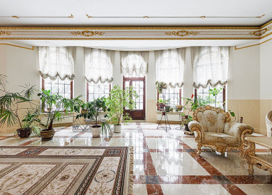 Качественная современная отделка дома выполнена в стиле эклектики с элементами ар-деко и лофта. Стены – обои, в отдельных зонах — частично на кухне, на лестничном проёме и в спальнях — немецкие обои с имитацией штукатурки, в детских спальнях стены оформлены под кирпич, в мастер- спальне и санузле на первом этаже стены украшены фресками Affresco (в санузле - со
