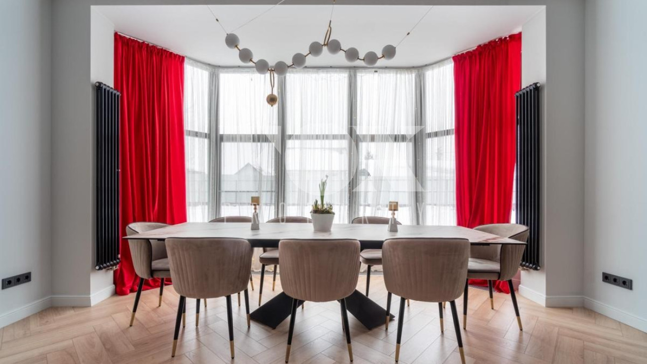 Также в гостиной - обеденная группа на 10-12 персон: элегантный стол с керамической столешницей и дизайнерскими велюровыми стульями