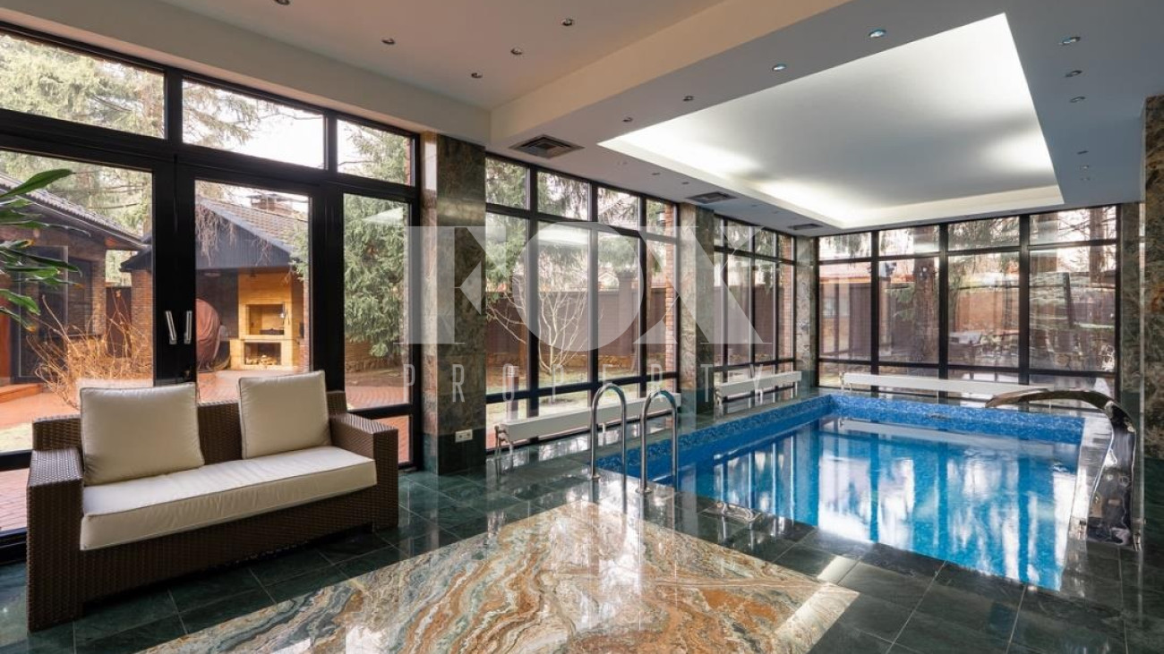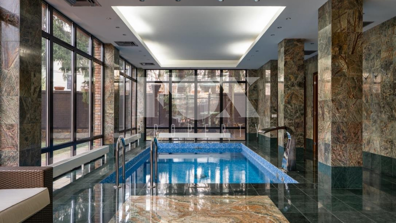 На первом этаже расположена зона бассейна с чашей размерами 6х3 метра, оборудованная противотоком, фонтаном и системой гидромассажа.