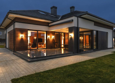 Зонирование дома распределено на 2 блока с собственными отдельными входными группами, отсутствует сквозной проход. Просторная гостиная с кухней и камином и выходом на террасы.
