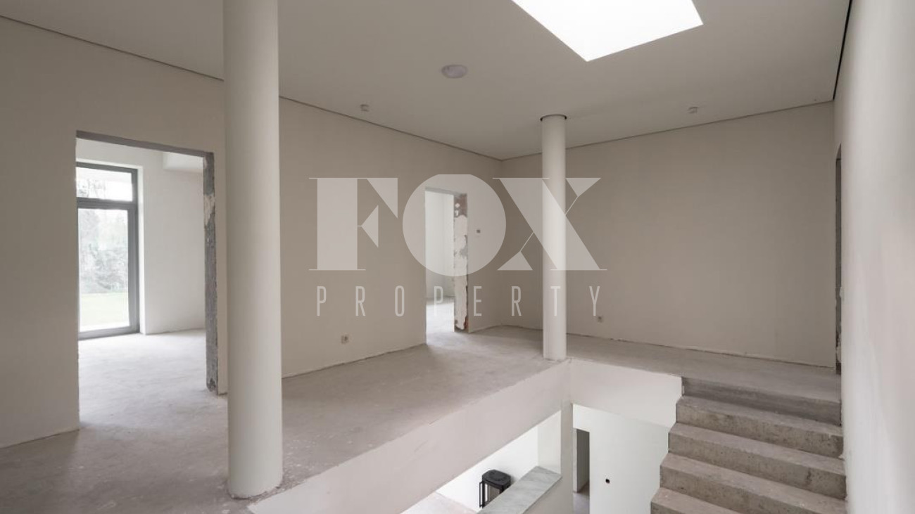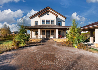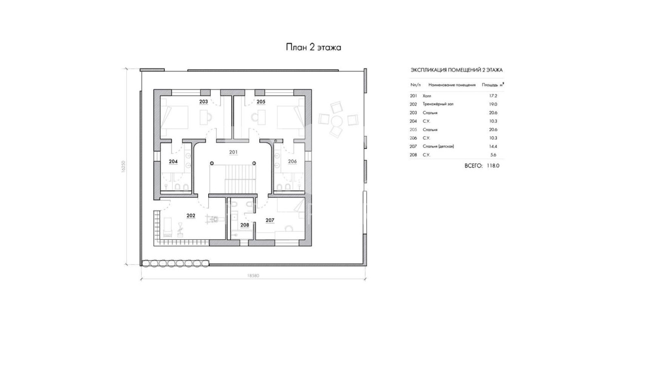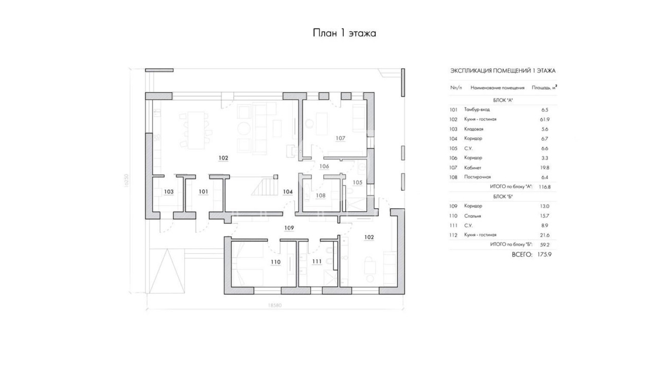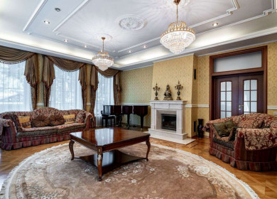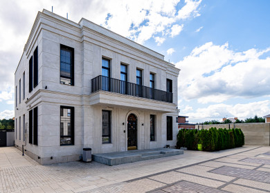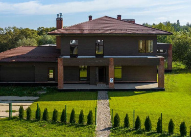 Общая площадь строений 600 кв. м (площадь дома 370 кв.м, с террасами - 485 кв.м, хозяйственные помещения - 115 кв.м). Площадь участка 40 сот.