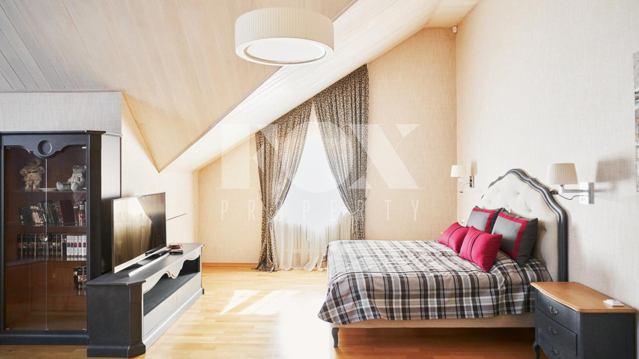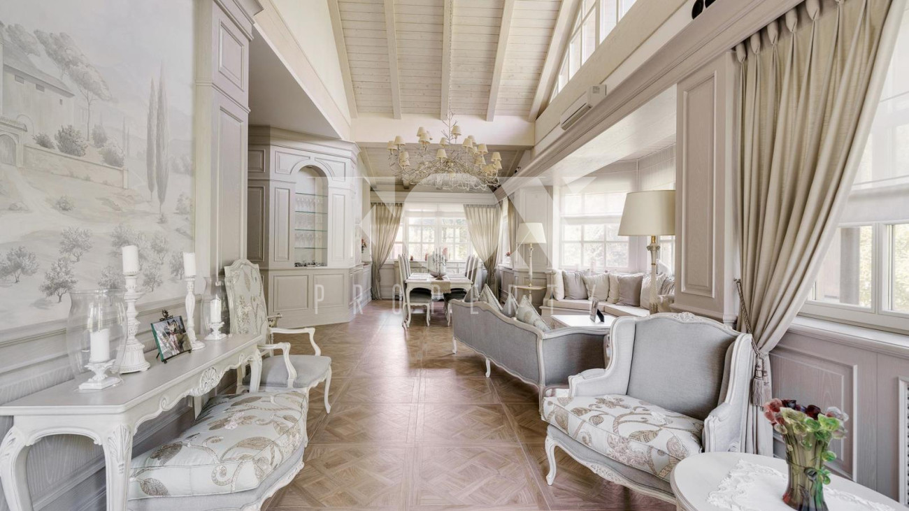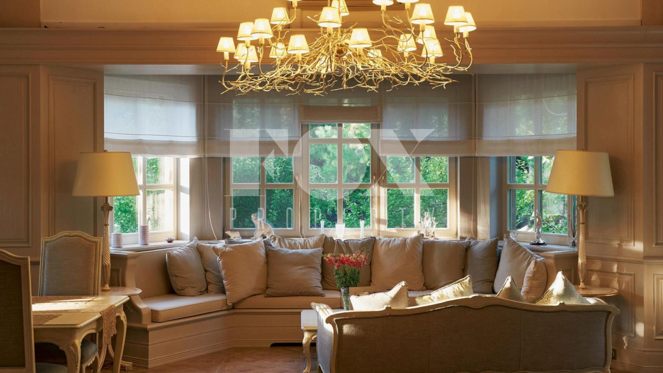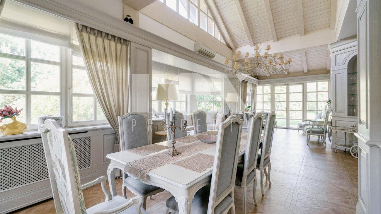 Расположенная на просторном участке 50 соток, загородная резиденция объединяет 4 архитектурных объекта в едином стиле швейцарского шале: трехуровневый жилой дом, двухуровневый SPA-комплекс, дом для персонала и гараж с постом охраны.