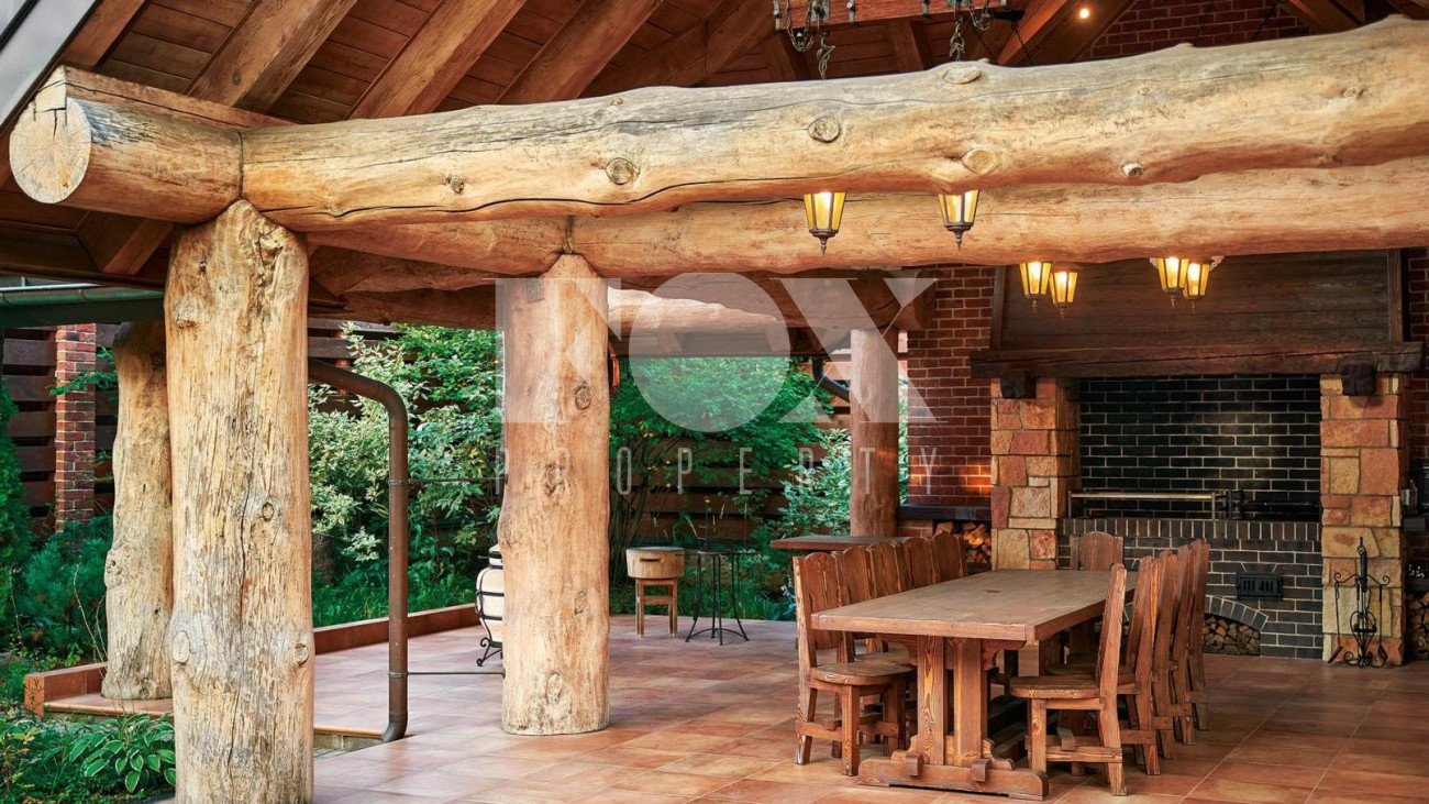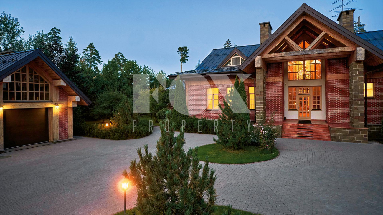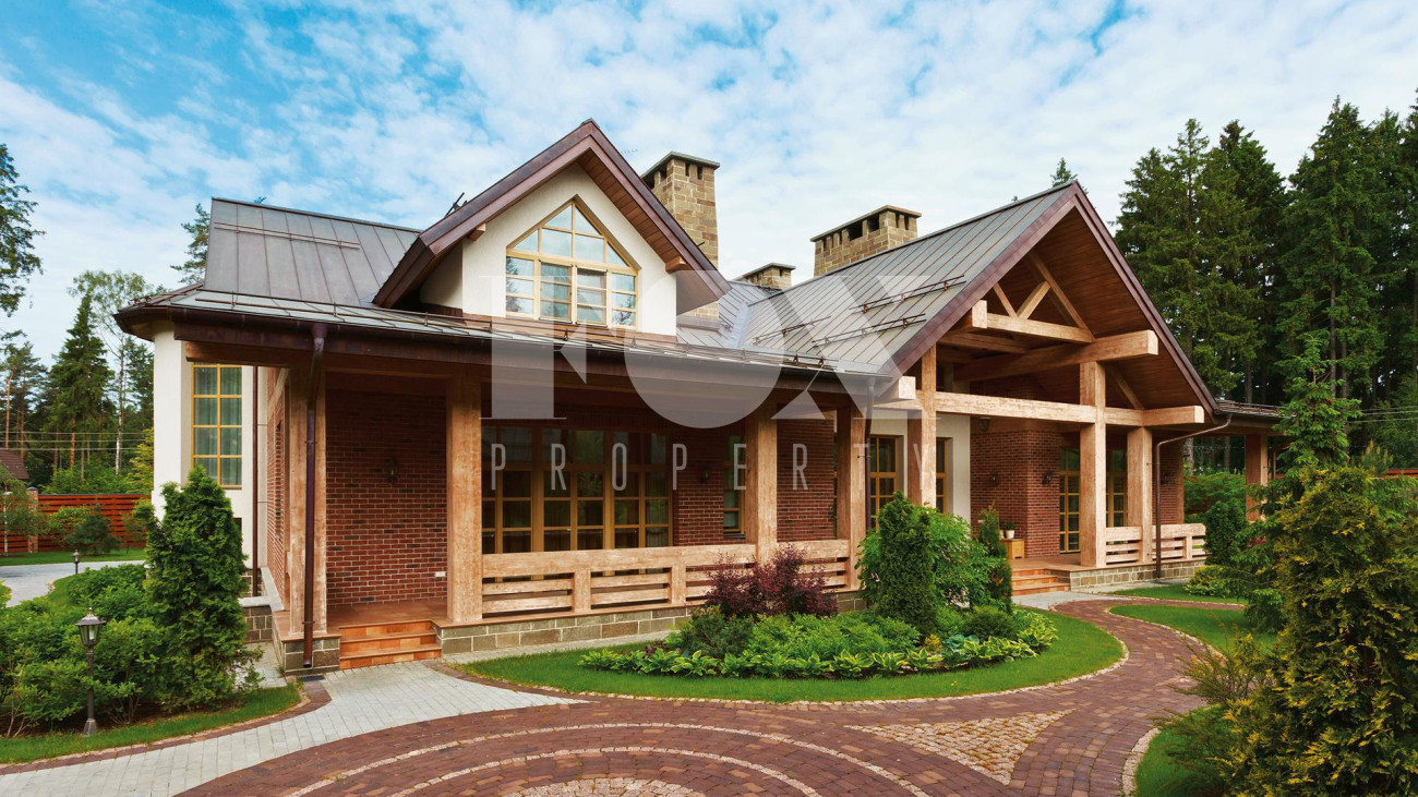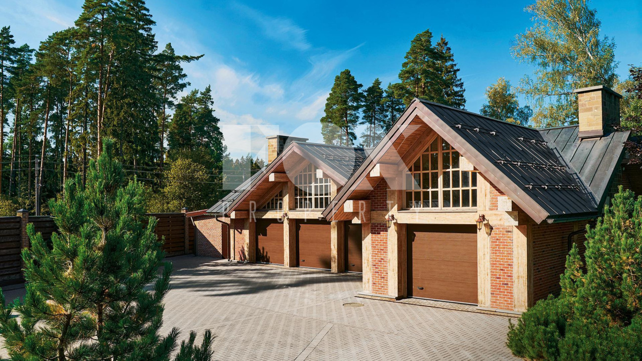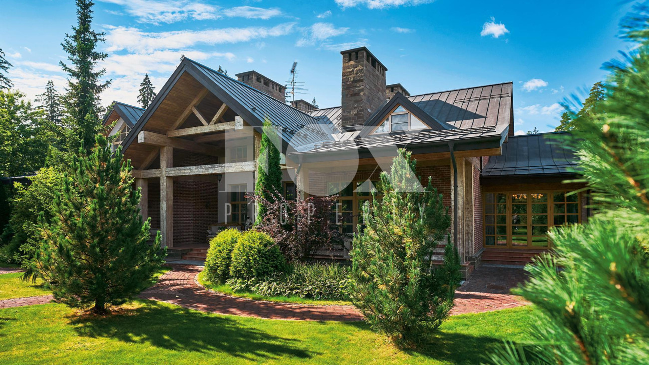 Широкие силуэты крыш с мощной системой стропил из хвойных пород деревьев органично сливаются с кронами вековых деревьев, создавая гармоничный ансамбль, где кирпичная кладка сочетается с бревнами ручной рубки.