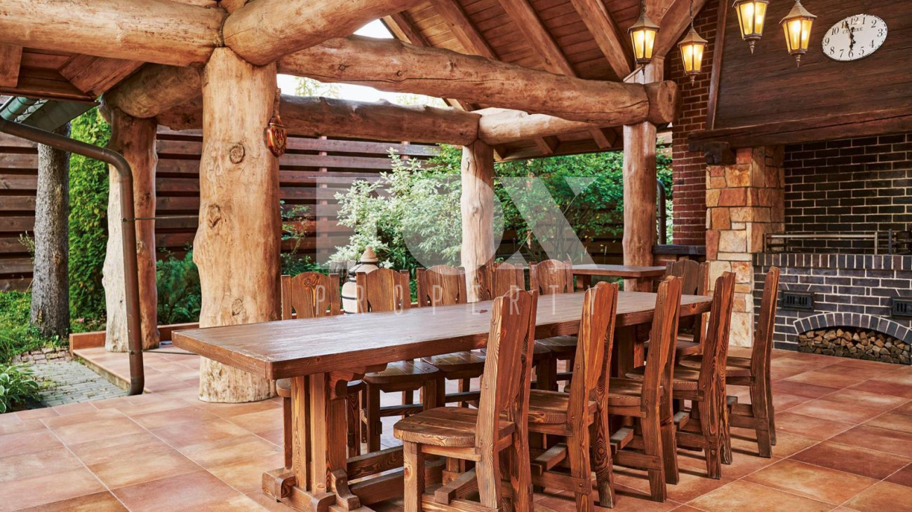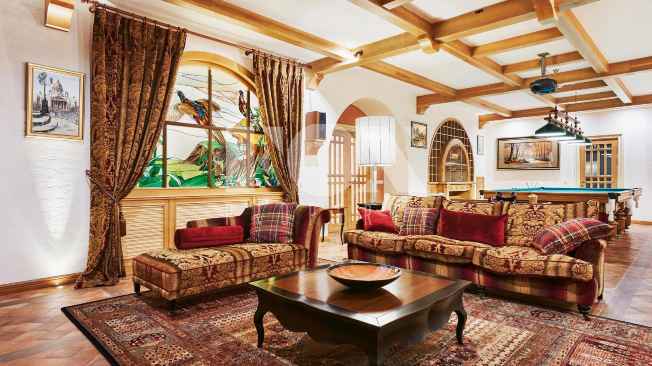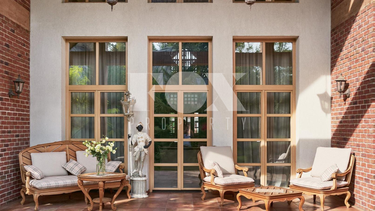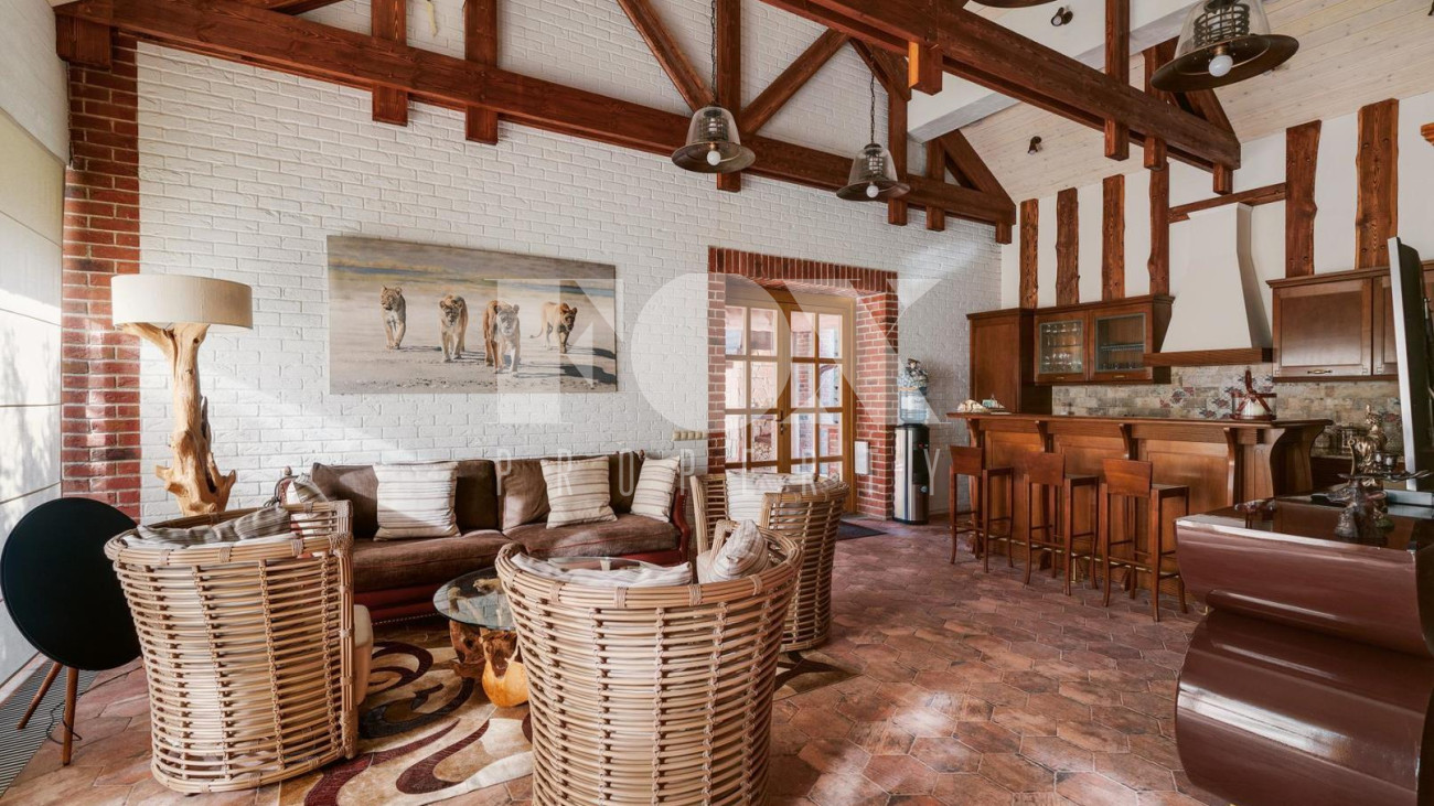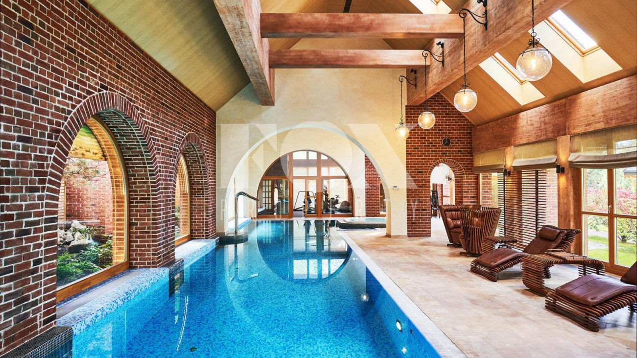 Широкие силуэты крыш с мощной системой стропил из хвойных пород деревьев органично сливаются с кронами вековых деревьев, создавая гармоничный ансамбль, где кирпичная кладка сочетается с бревнами ручной рубки.