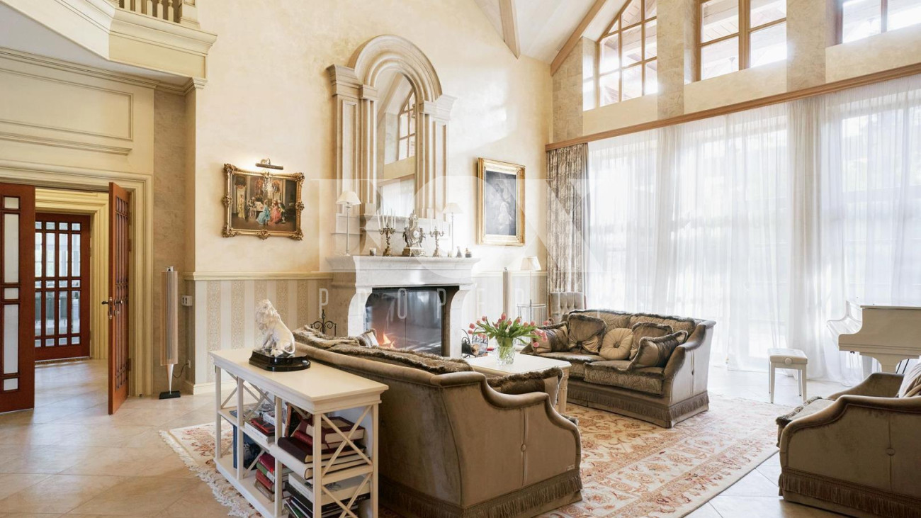 - Гостиная с диванами Bruno Zampa, витринами Angelo Cappellini и светильниками Zonca, где готический модерн сводов сочетается с элегантной классикой камина;
