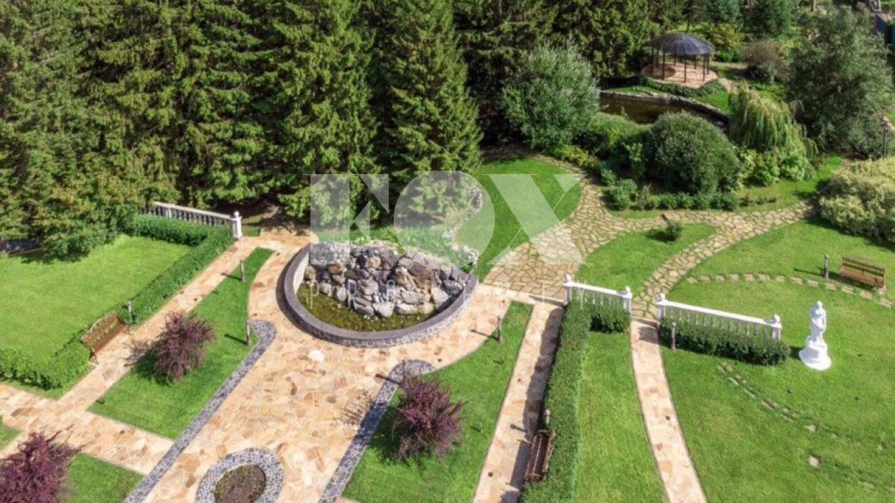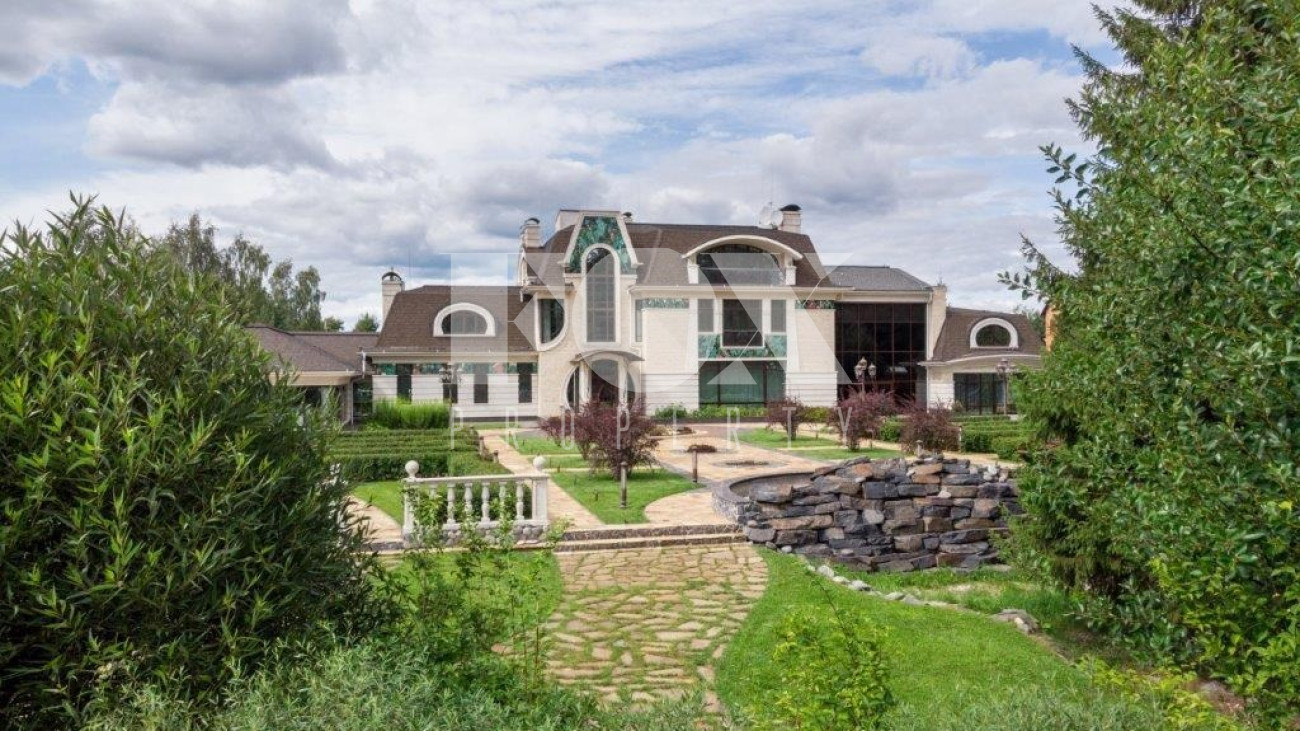 Площадь участка 1053 сот. На огороженной территории с освещенными дорожками расположены беседка, искусственное озеро, гараж на 2 машины и наземная огороженная парковка для 5 автомобилей.