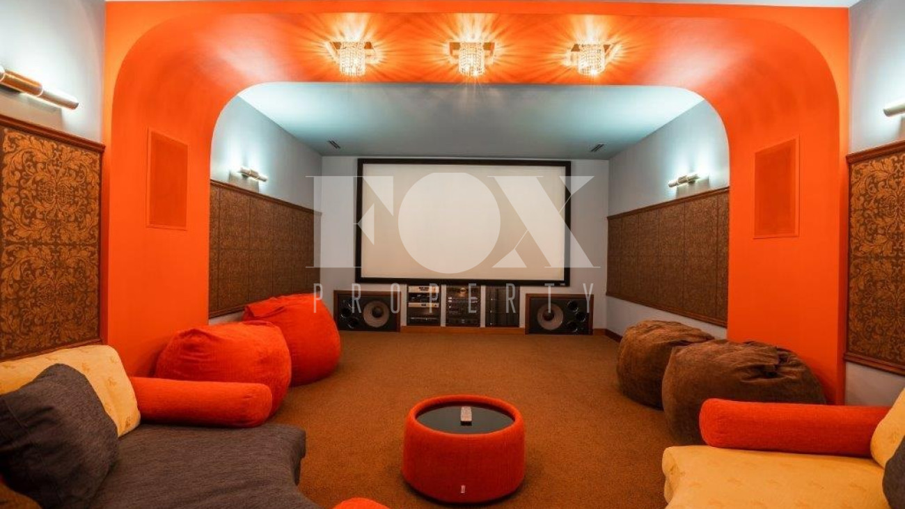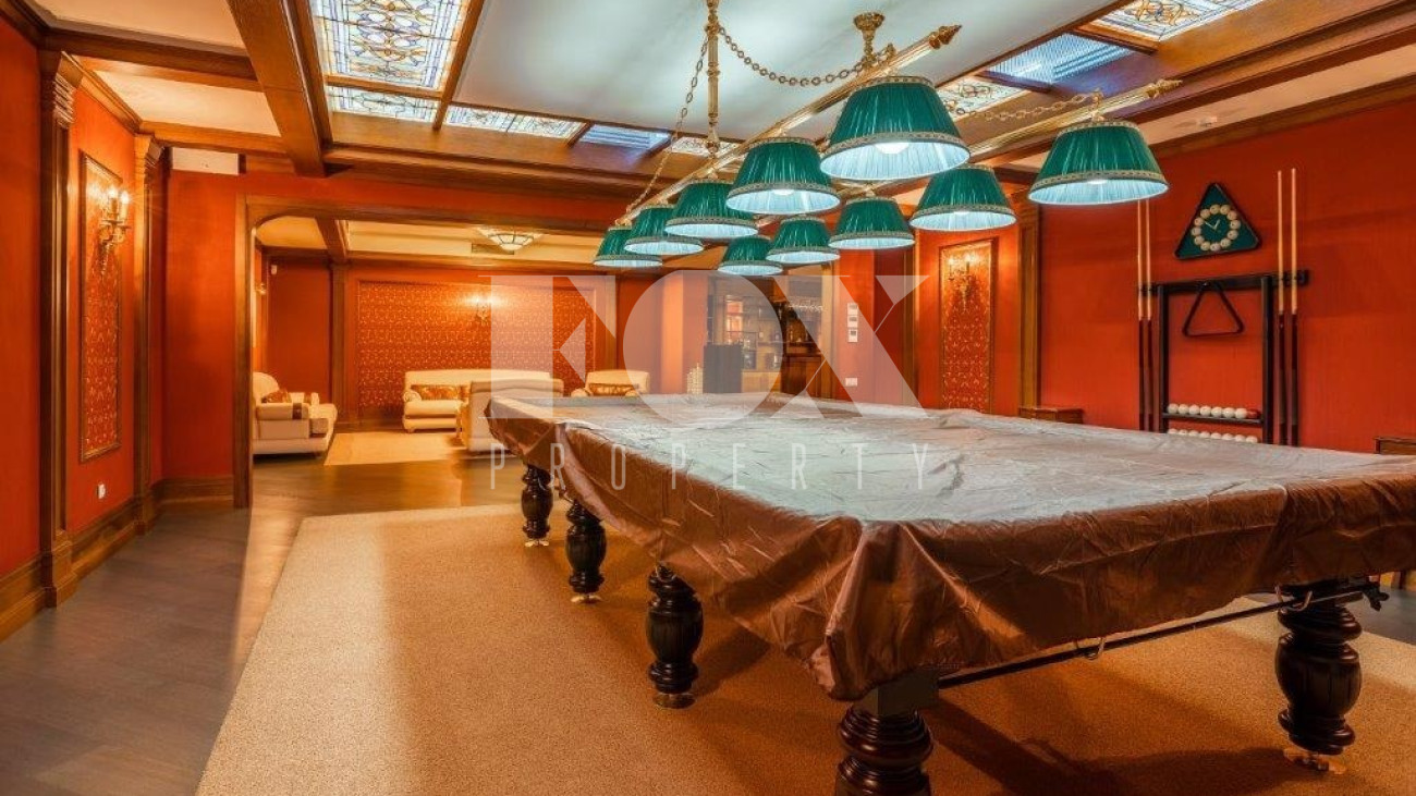 На цокольном этаже расположены технические службы, а также бильярдная комната и кинотеатр.