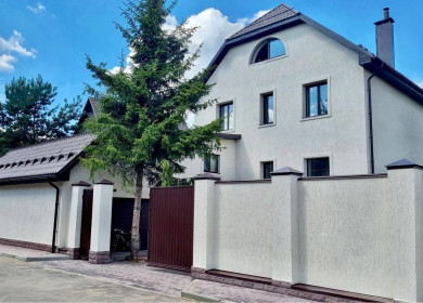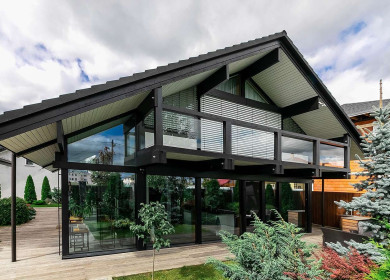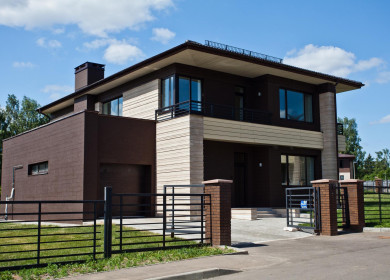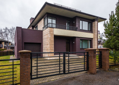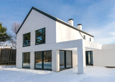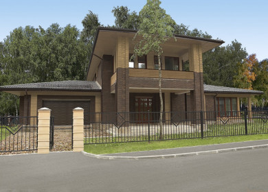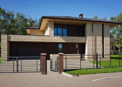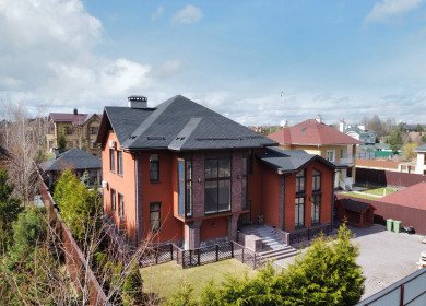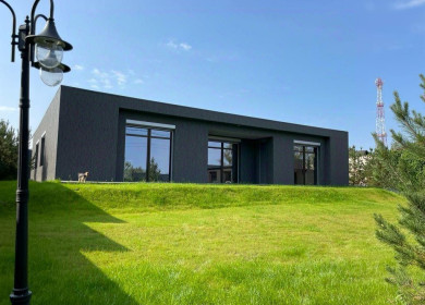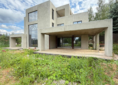 Конструктивная схема дома: фундамент — ленточный, выполненный из монолитного железобетона; наружные стены выполнены из керамического крупноформатного камня "RAUF"; внутренние стены и перегородки выполнены из кирпича, марки 100; полы 1-го этажа по утепленной монолитной ж/б плите; перекрытия (над 1-ым эт.)- ж/б плиты заводского изготовления, толщиной 220 мм; конструкция кровли — деревянная, утеплитель Rockwool "Лайт Баттс"; терраса кроется дощатым настилом из строганой доски, обработанной защитной пропиткой типа "Пинотекс", по лагам и бетонному ростверку на столбчатом фундаменте. Окна, двери — деревянные с двойным стеклопакетом. Покрытие кровли — цементно-песчаная черепица "BRAAS" Фасады — декоративная плитка из бетона, фрагменты — деревянная фасадная доска.