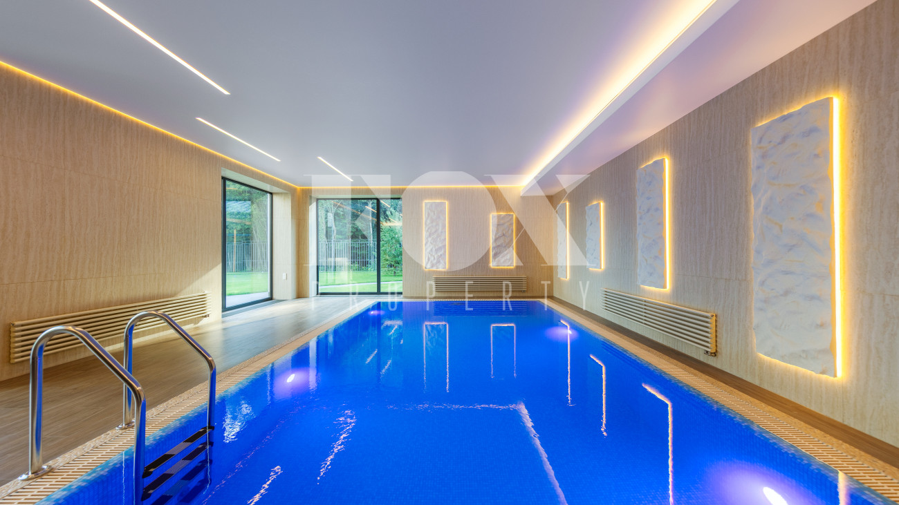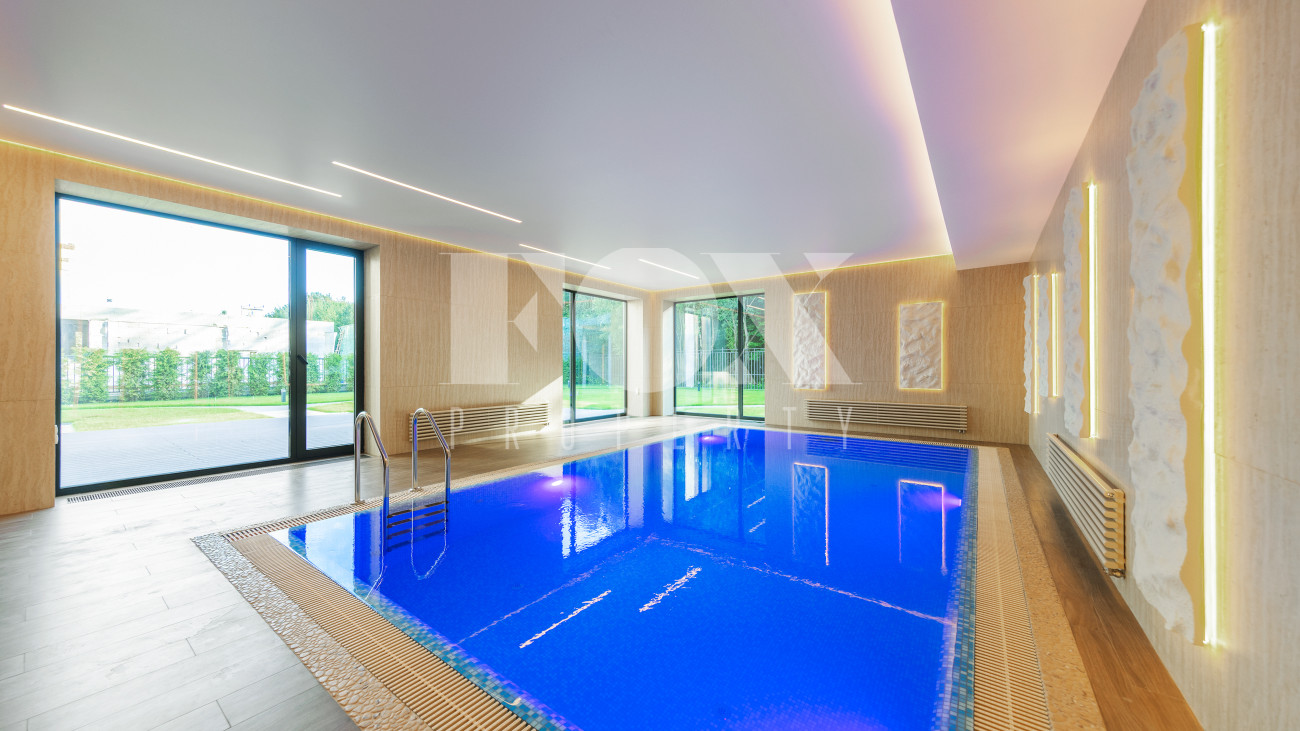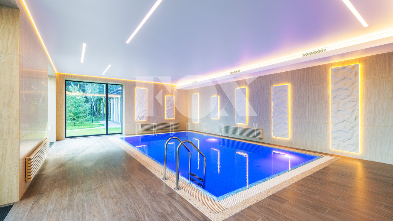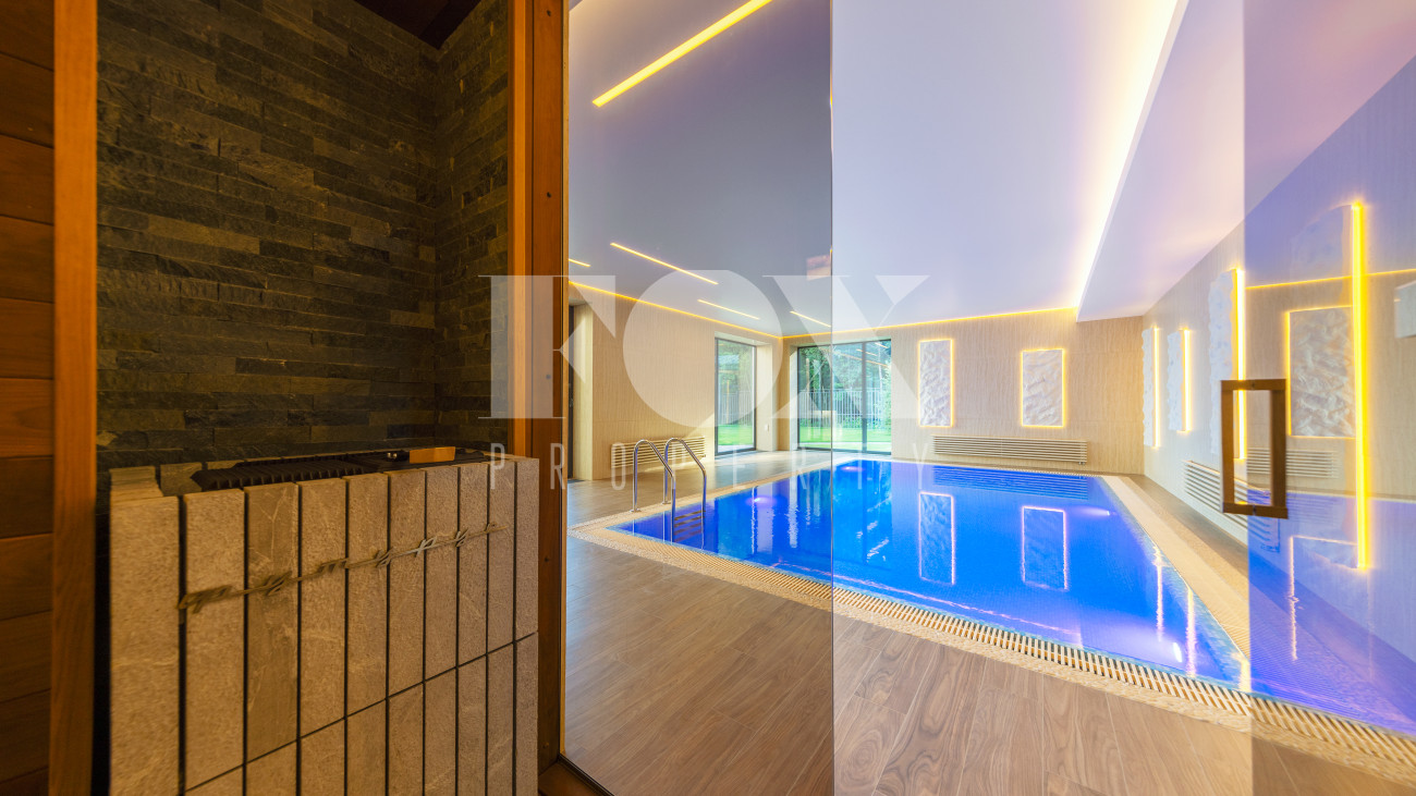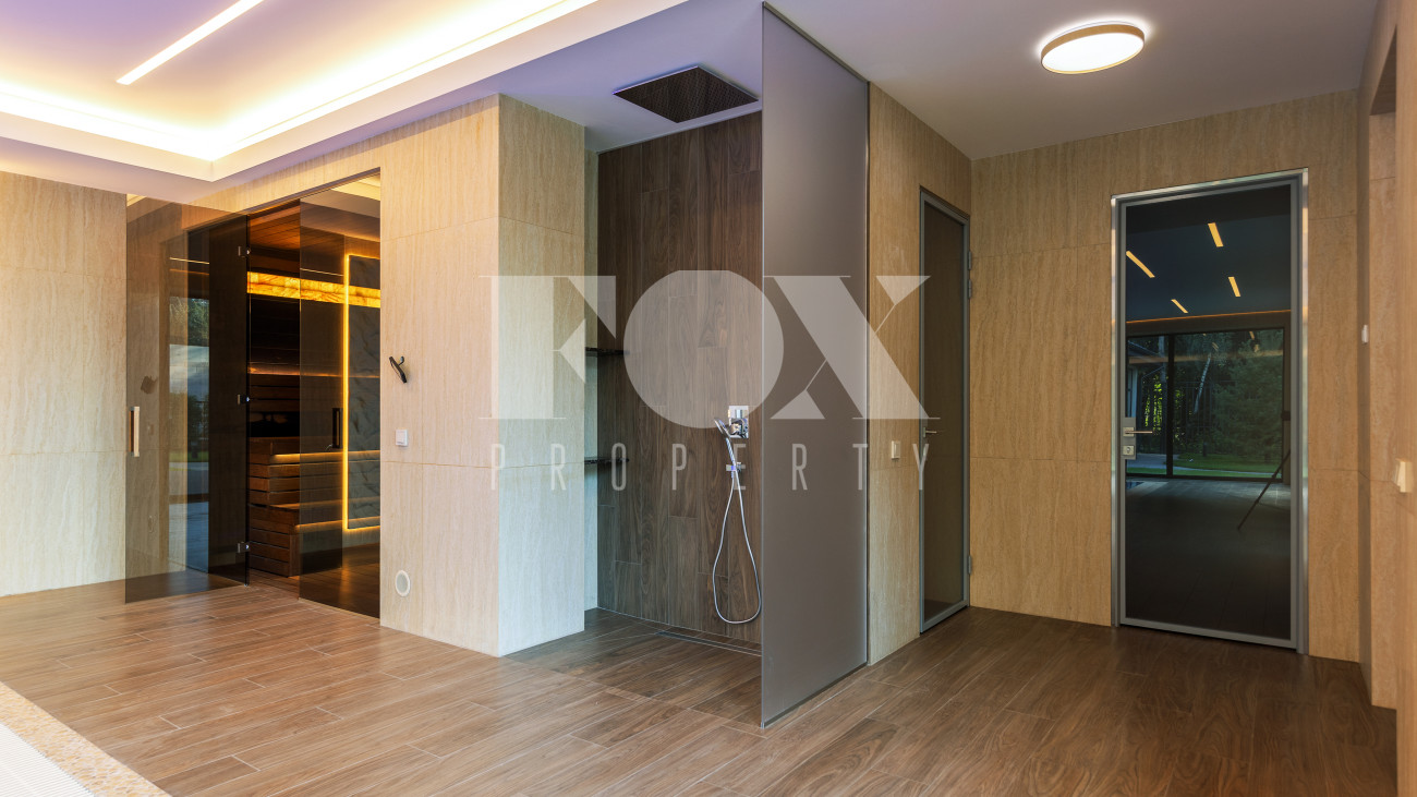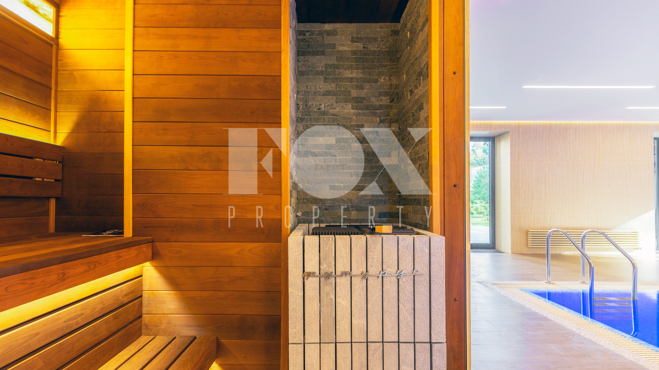 В доме имеется спа-зона, включающая в себя сауну и бассейн 7*4 с противотоком и подсветкой. Бассейн оснащен инновационной системой очистки NECON. Кристально чистая вода без хлора и химических запахов обеспечивает максимальную безопасность для всей семьи, а технология ионов меди и цинка сохраняет её прозрачность годами. Благодаря пролонгирующему эффекту и защите оборудования, бассейн требует минимального обслуживания.
