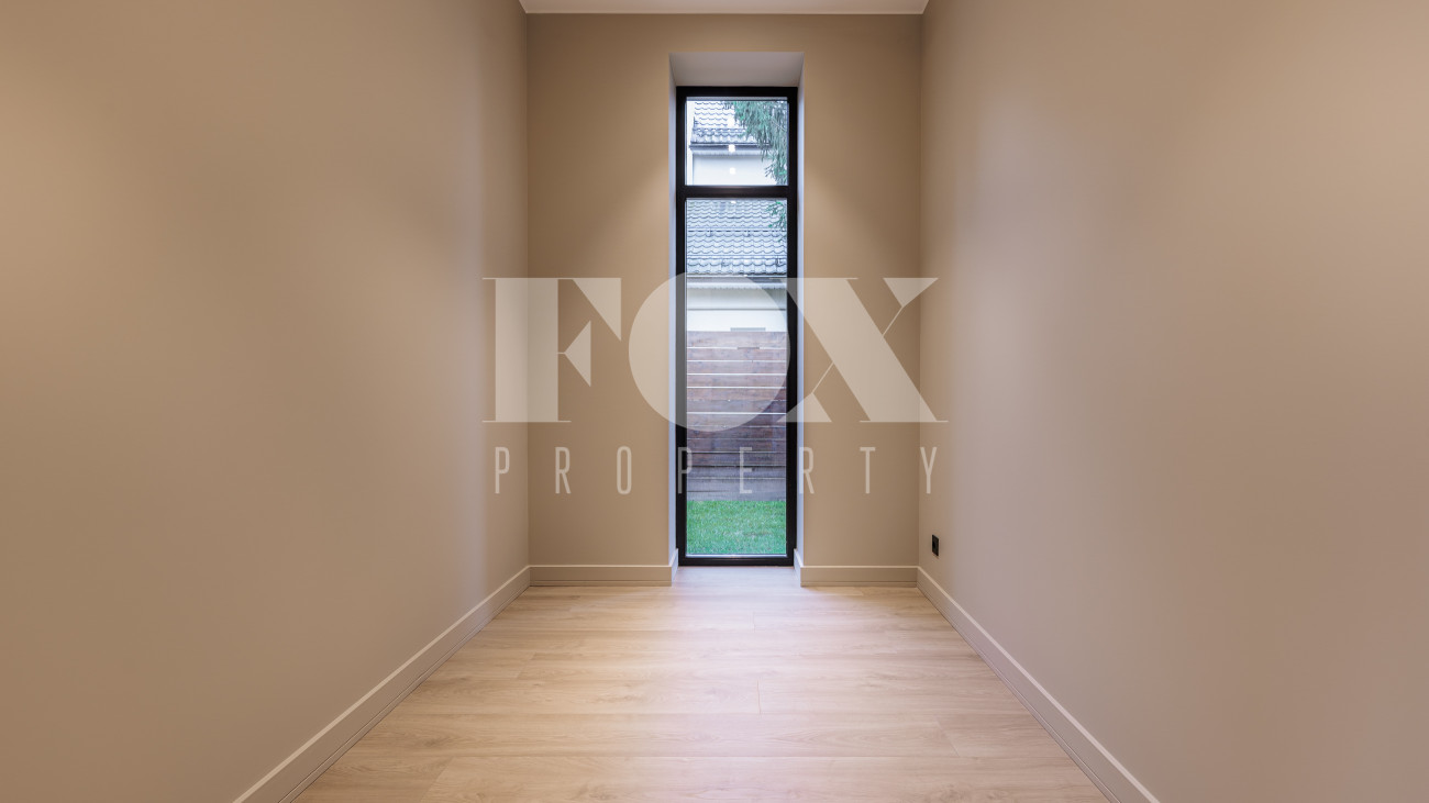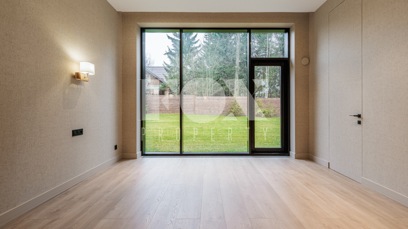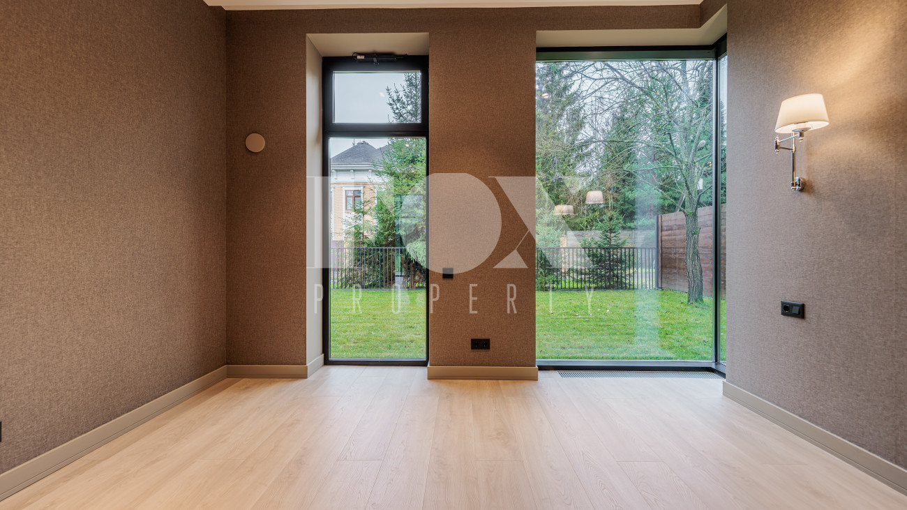 Алюминиевые окна Alutex высотой 3,6 метра, двойной энергоэффективный крупноформатный стеклопакет, площадь остекления фасада более 40%. В отделке использованы: межкомнатные двери высотой 3 метра (шпон дуба), плитка Porselanosa, Французские моющиеся краски Argile, текстильные широкоформатные обои в спальнях.