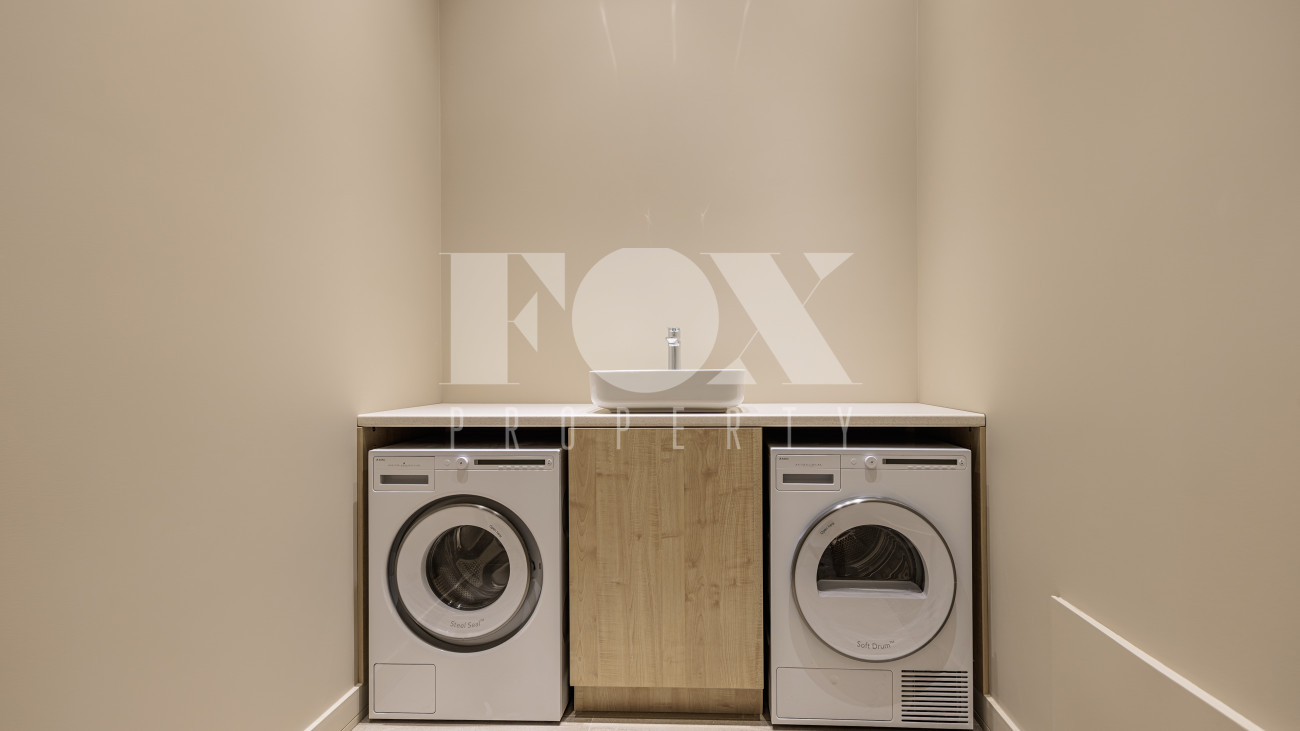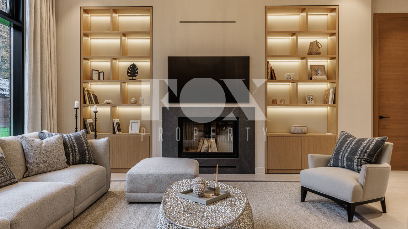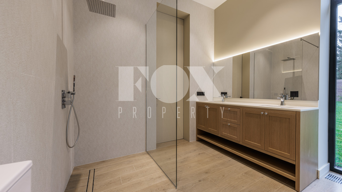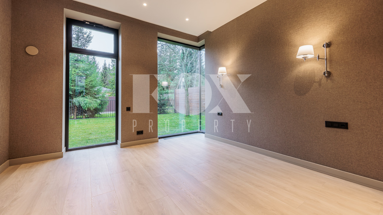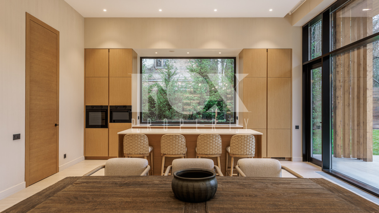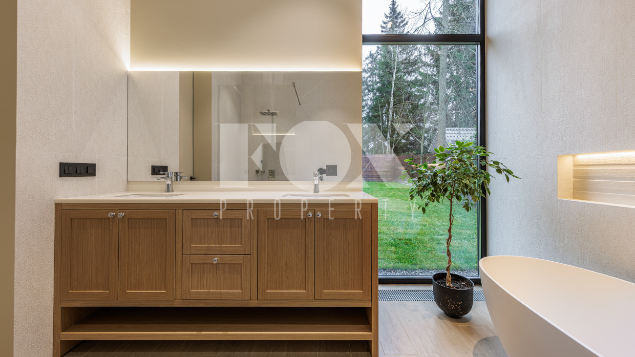 Встроенная кухня с островом и стеллажи из шпона дуба. Установлена шведская техника Acko и плита со встроенной вытяжкой Nikola Tesla. Теплые водяные полы Rehau во всех помещениях, внутрипольные конвекторы во всех комнатах, котел Vaillant и бойлер на 300 литров. Сделан дренаж участка и ливневая канализация, выполнена подсветка деревьев, уложен спортивный газон. Выполнена архитектурная подсветка фасада и территории участка. Все центральные коммуникации (газ, свет, вода, канализация, оптоволоконный интернет)