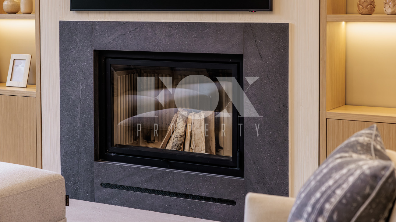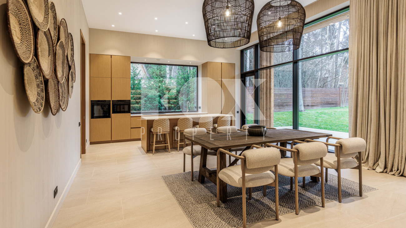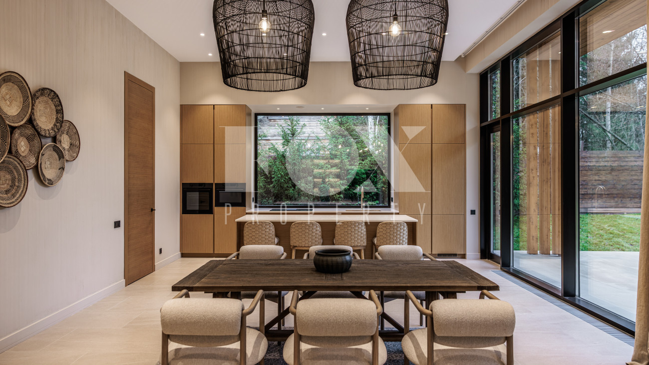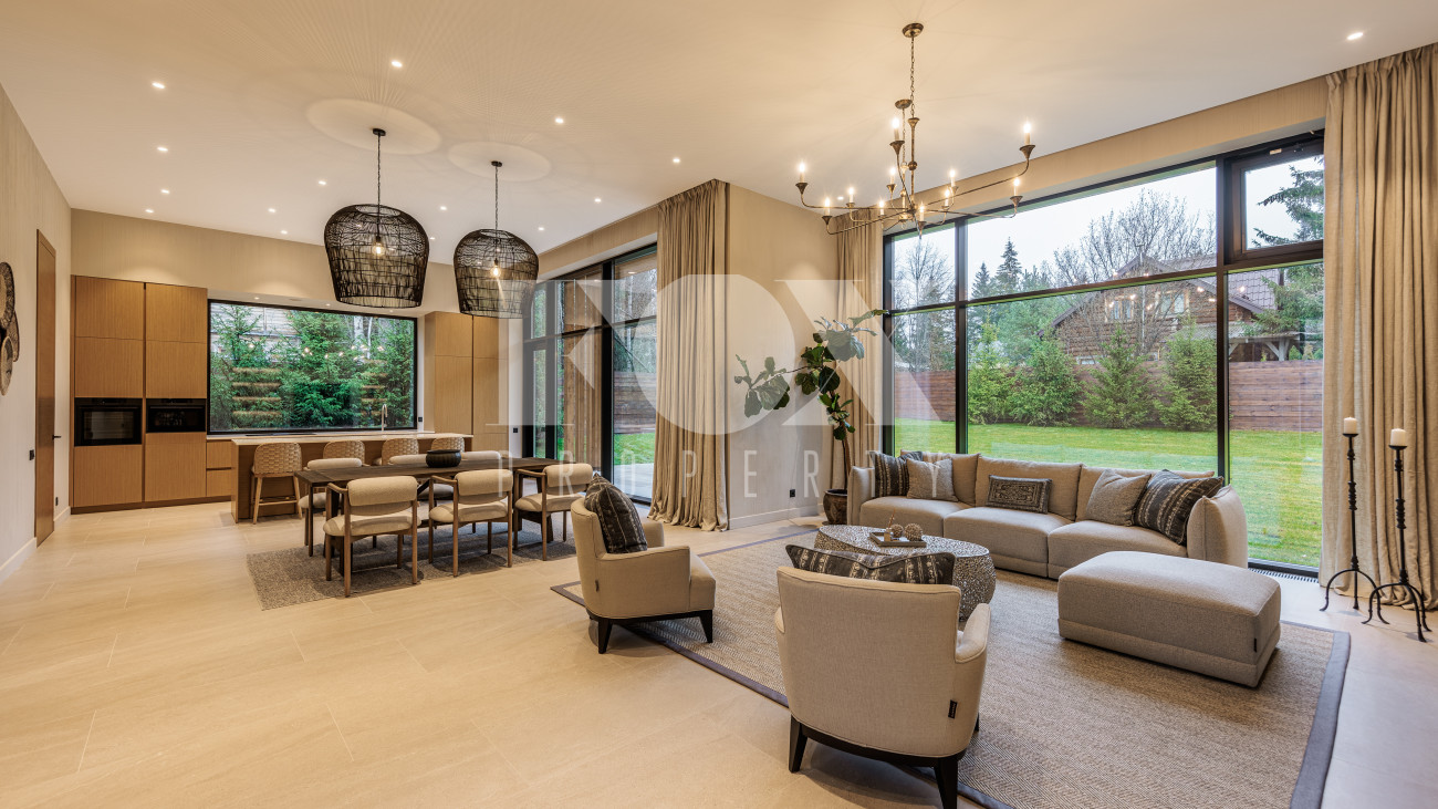 Главная часть дома: кухня-гостиная - общей площадью 80 м2 (потолок 4 метра) включает в себя диванную зону с дровяным камином, встроенную кухню с островом и обеденной зоной и выходом на крытую террасу 27 м2.
