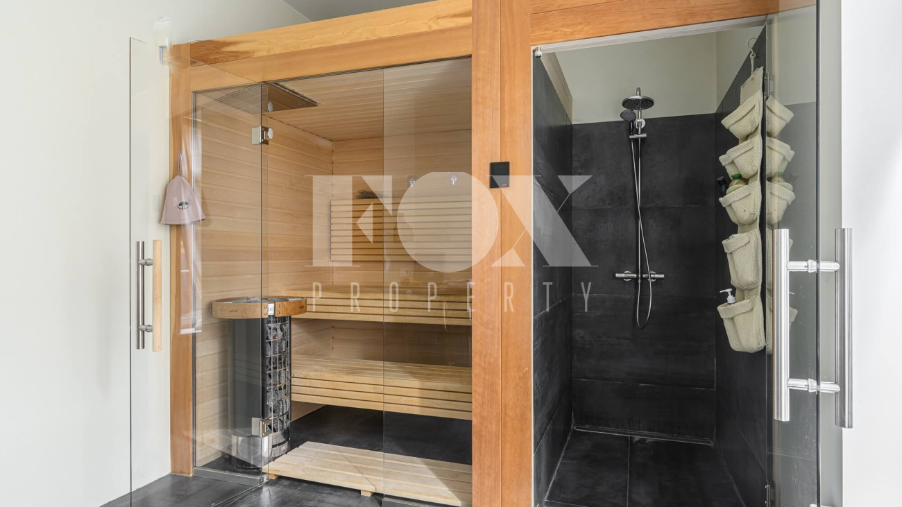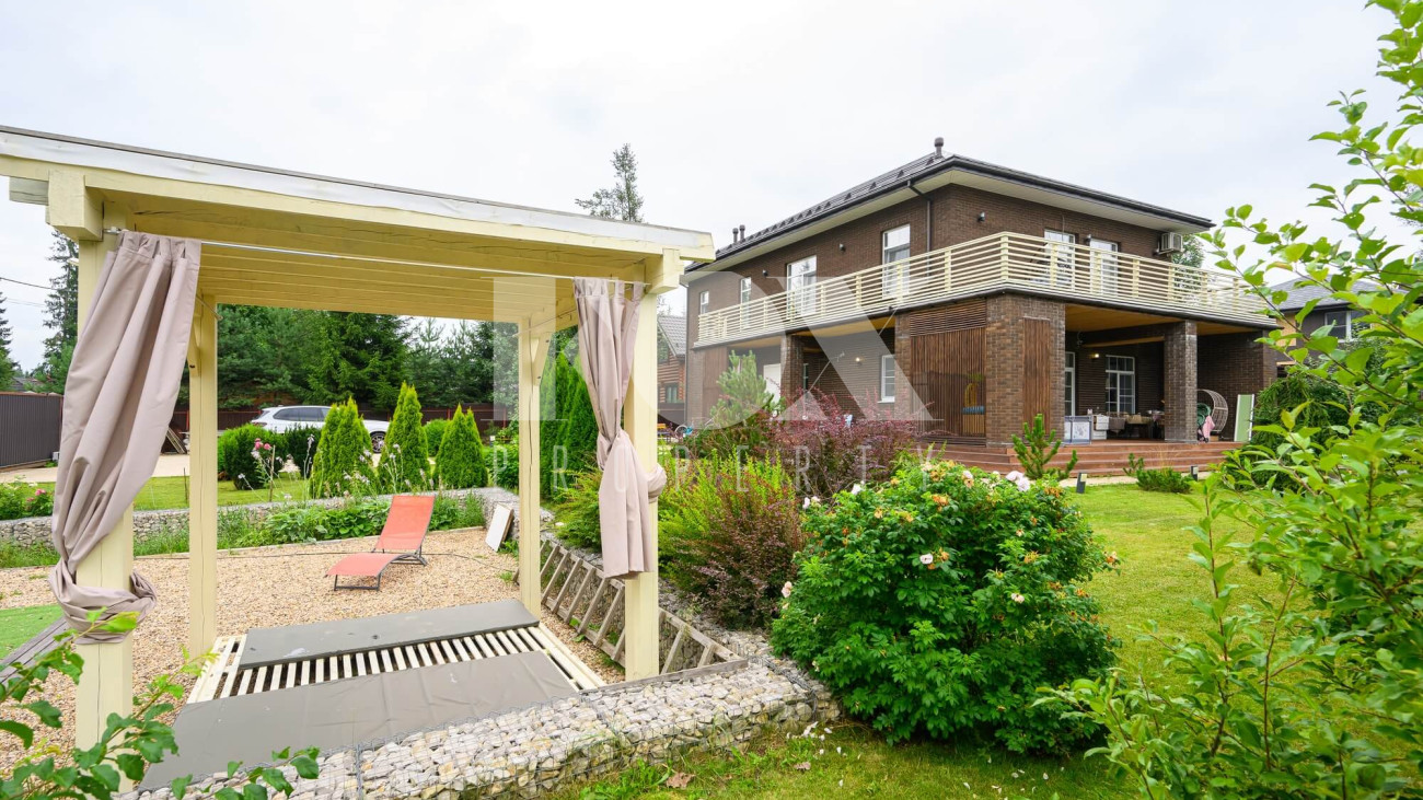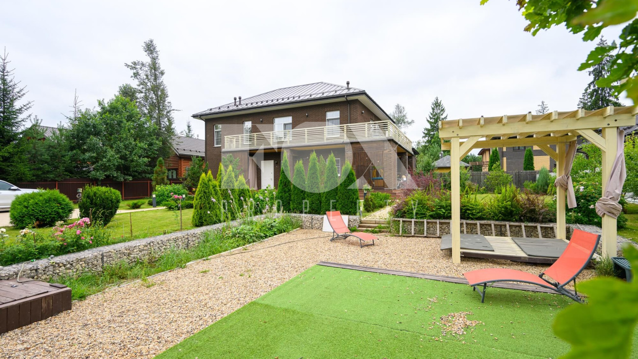 На участке ландшафтный дизайн с дорогими хвойниками, плодоносящим садом, автополивом и мощным дренажом, зона отдыха с лежаками, ландшафтный дизайн, парковка на 5 м/м с подготовленным фундаментом под навес.