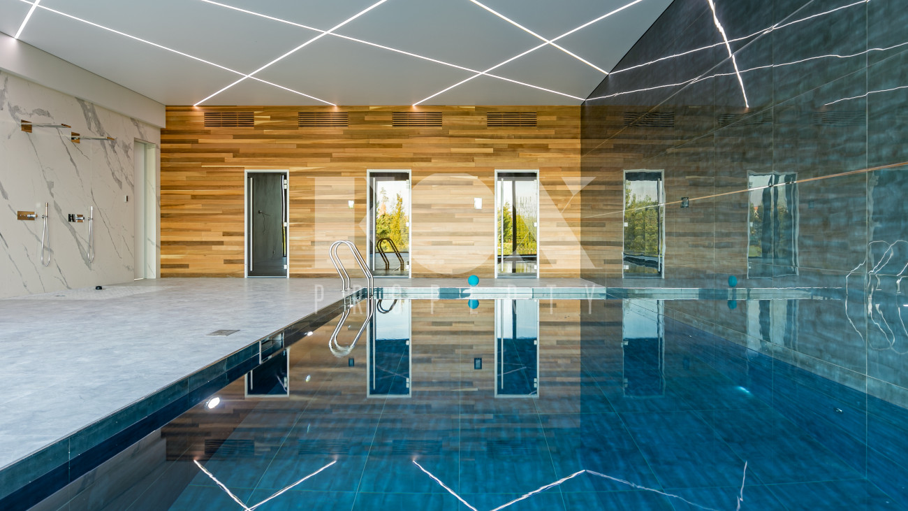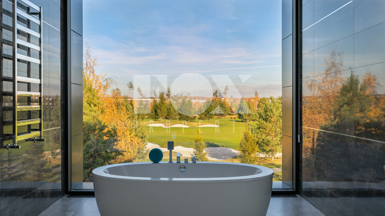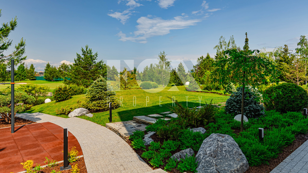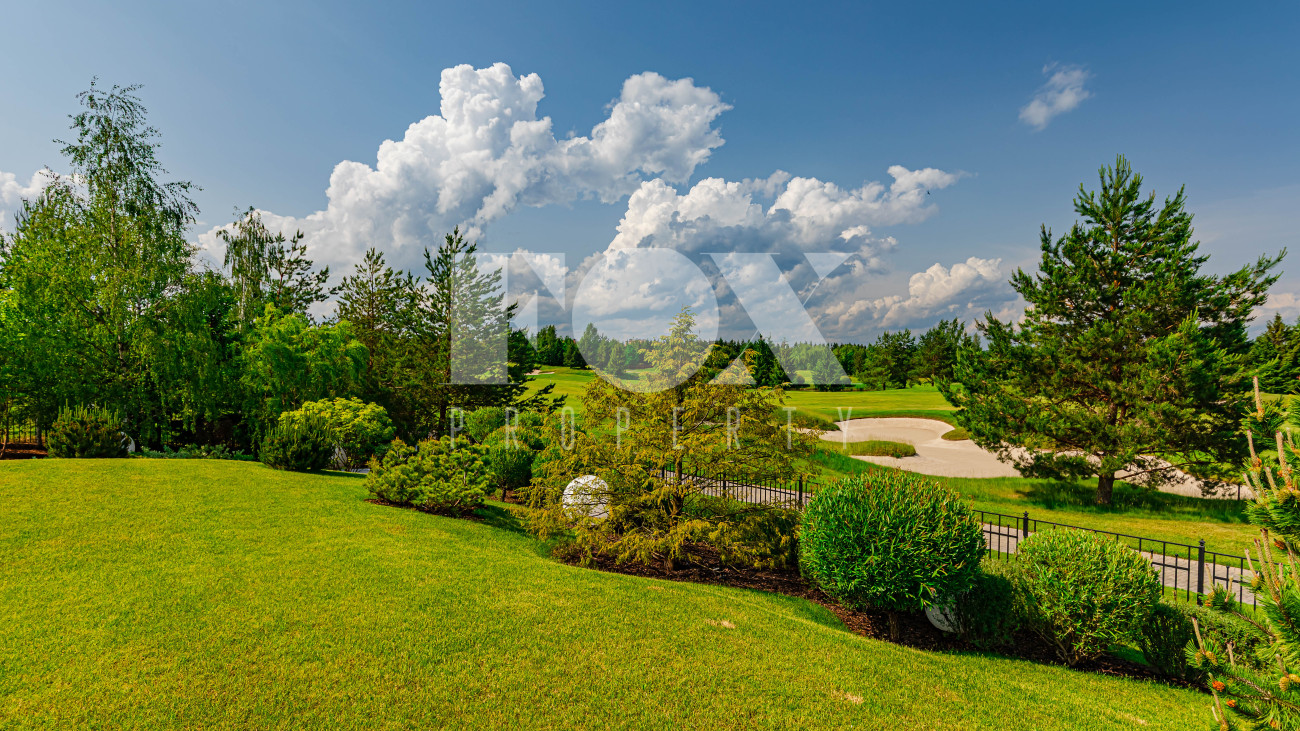 Непревзойденное качество исполнения внешней отделки с использованием высококачественных материалов. На первом этаже находится гостиная с камином, кухня, совмещенная с обеденной зоной, санузел, СПА-зона с бассейном и сауной, постирочная, две комнаты для персонала, блок для персонала. Второй этаж займут пять спален с индивидуальными гардеробными и санузлами, кабинет. Предусмотрен встроенный гараж на четыре машино-места. Особый интерес представляет ландшафт поселка с искусственно созданной коллекцией из 14 озер, водопада, фонтанов, прибрежной березовой рощей.