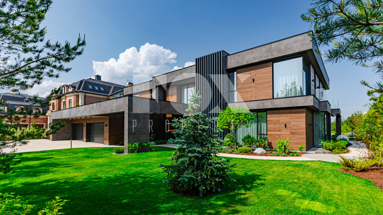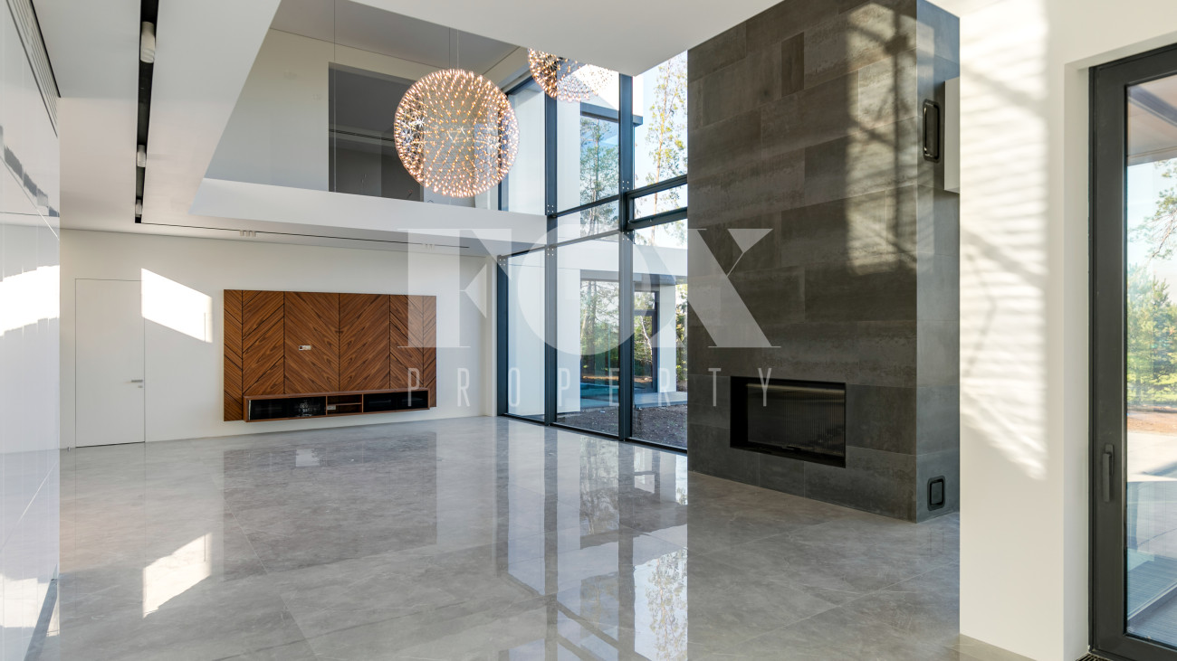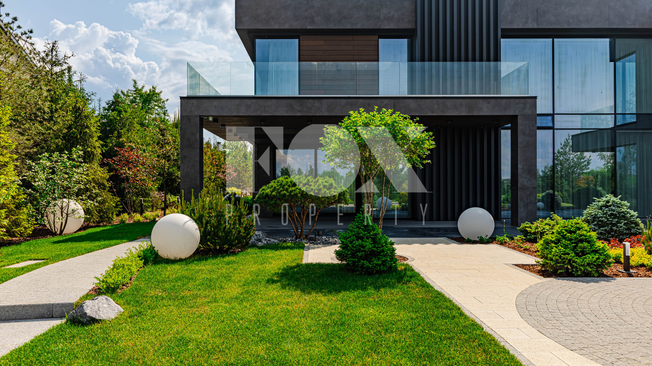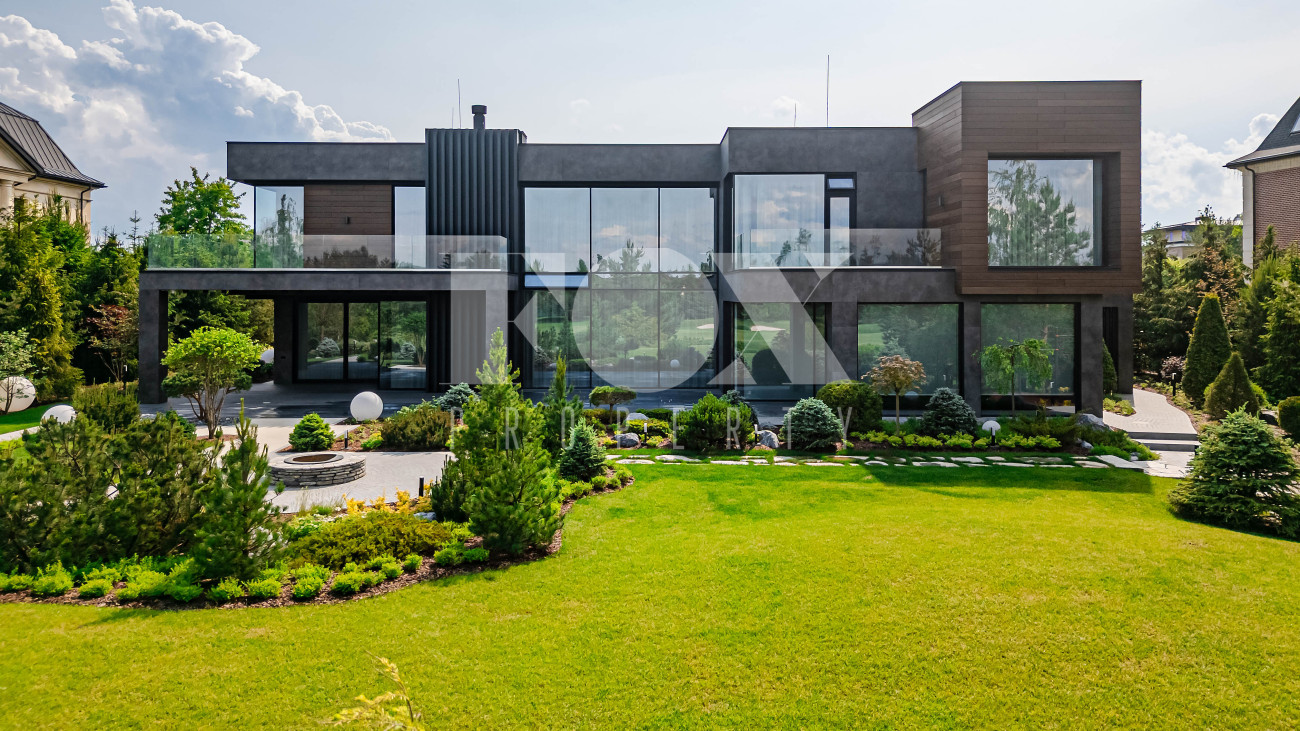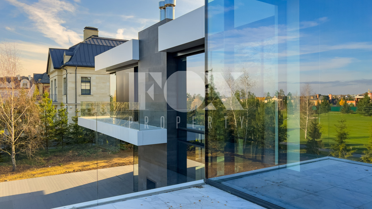 Просторная загородная резиденция в стиле hi-tech площадью 950 м² под ключ без мебели располагается на участке 33 сотки с ландшафтным дизайном в премиальном коттеджном поселке «Агаларов Эстейт».