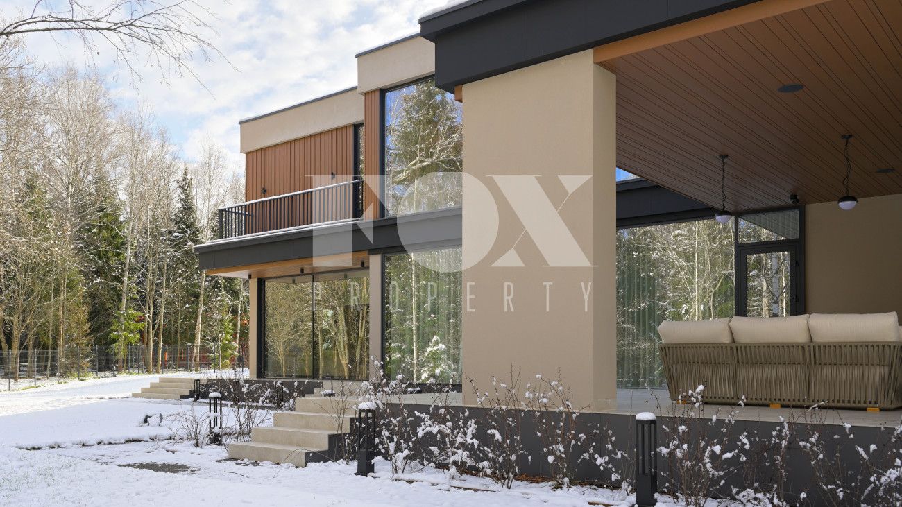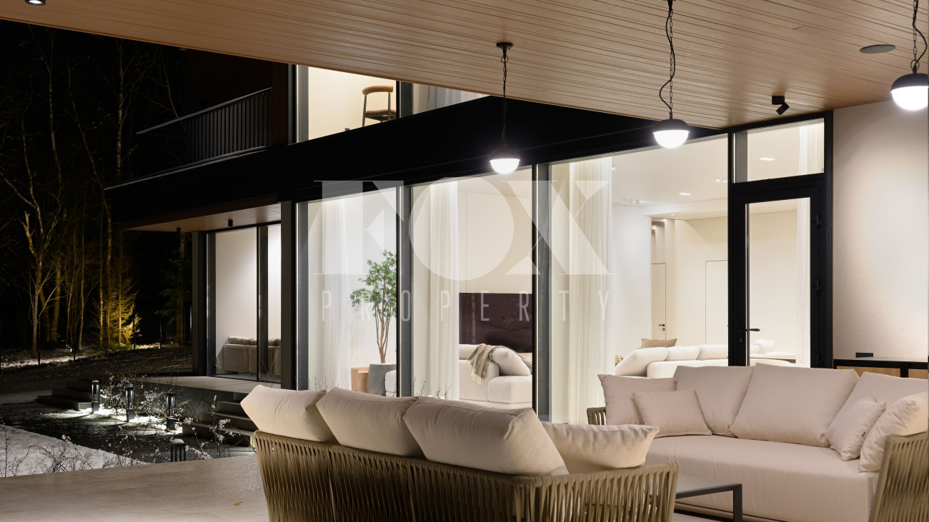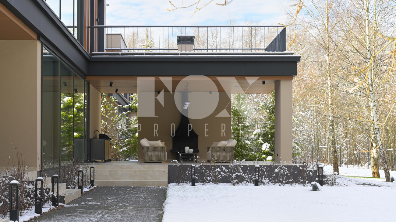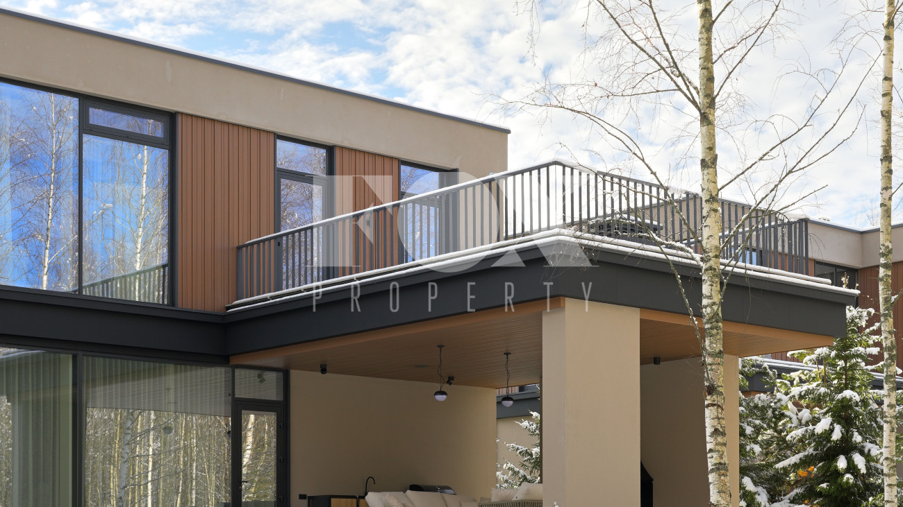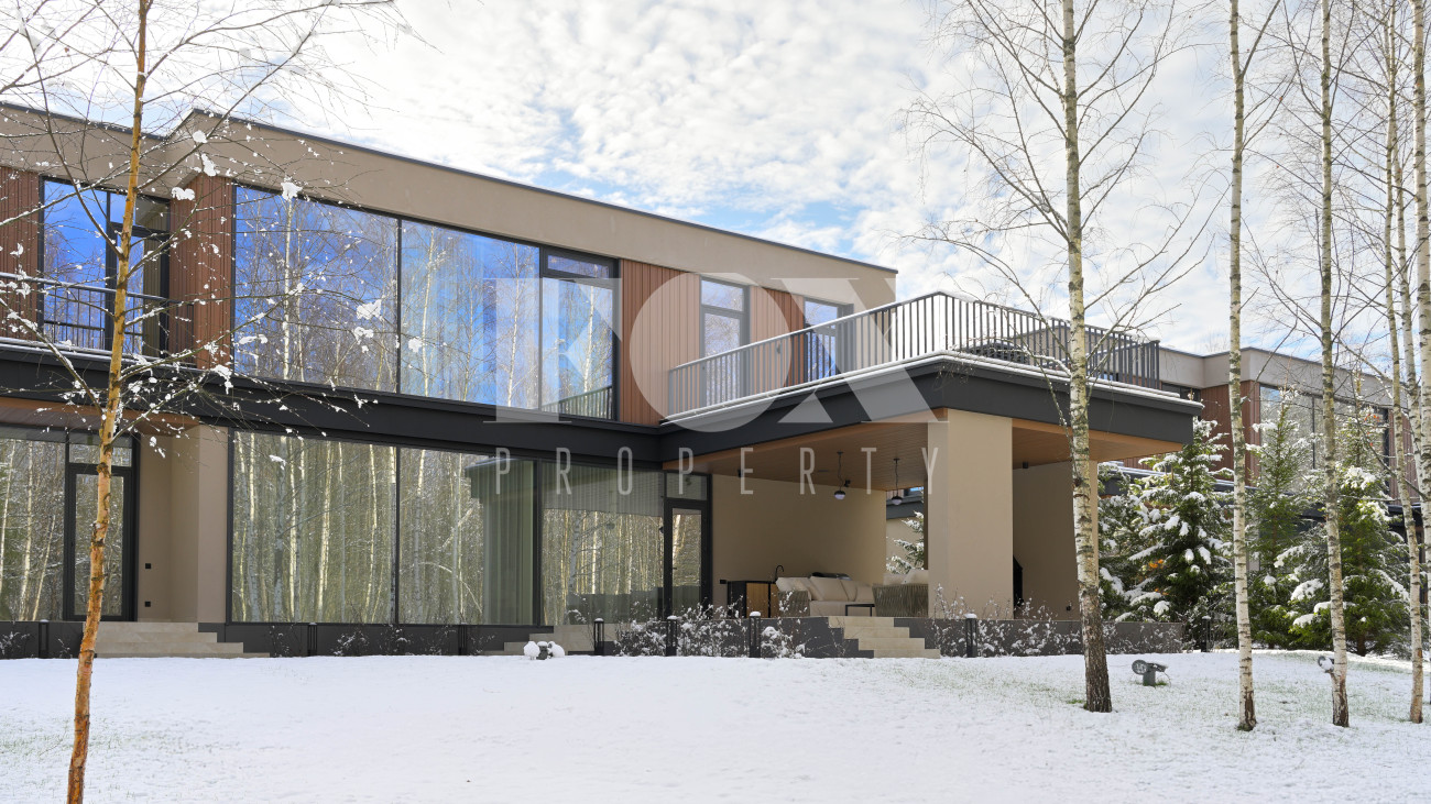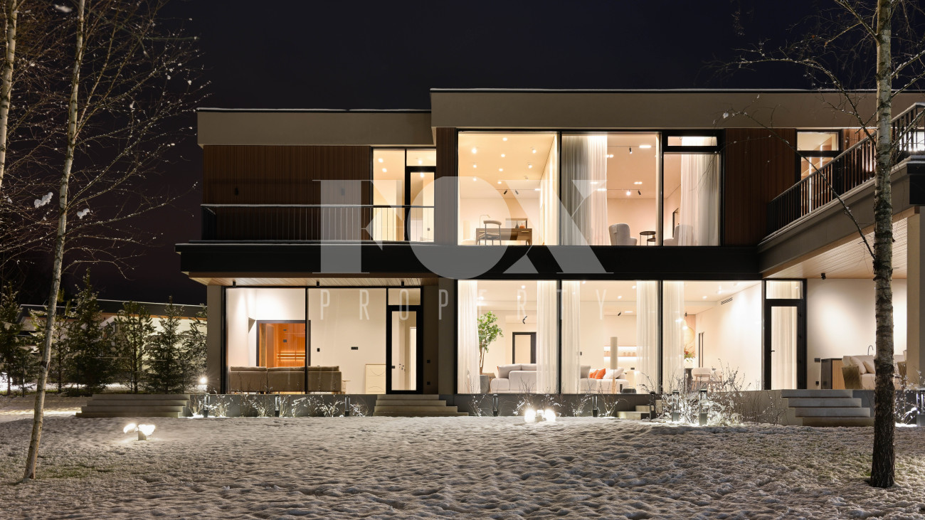Готовый к заселению дом площадью 627,5 м2 с архитектурой в стиле Hi-Tech. Пространство включает 6 спален,