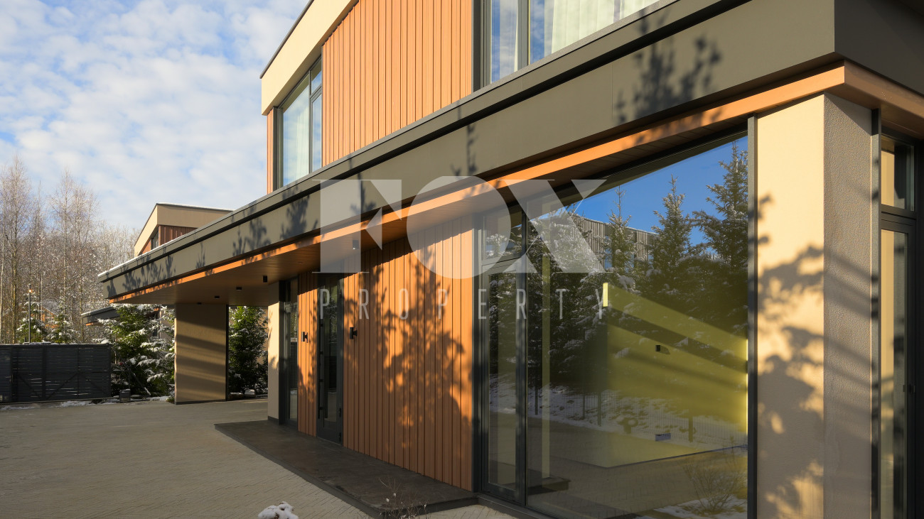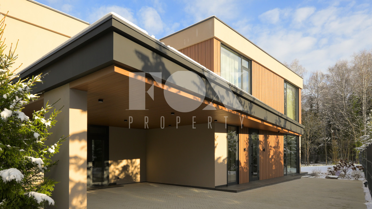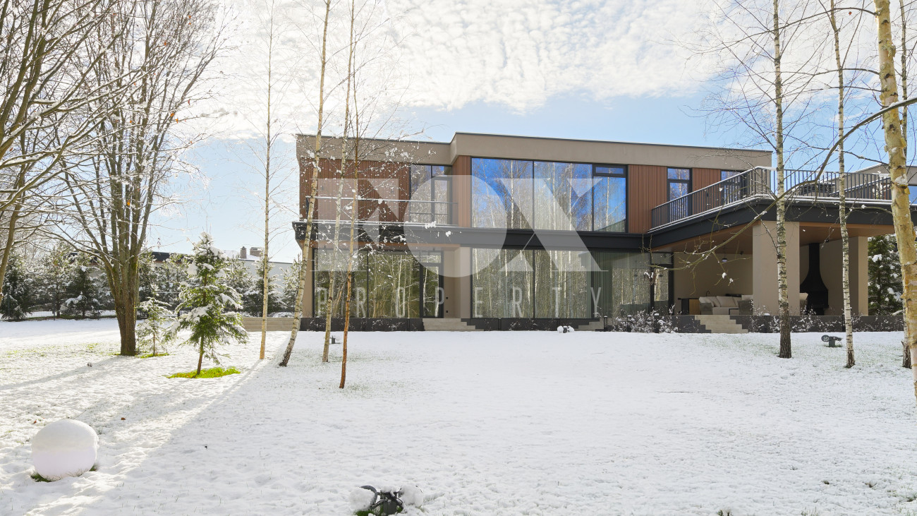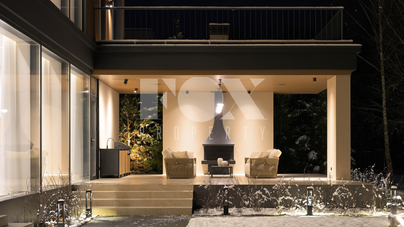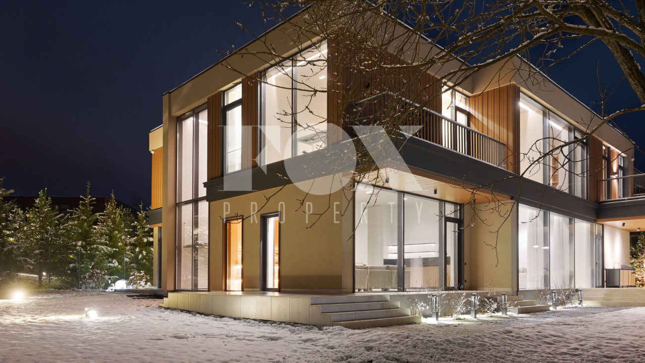 Готовый к заселению дом площадью 627,5 м2 с архитектурой в стиле Hi-Tech. Пространство включает 6 спален,