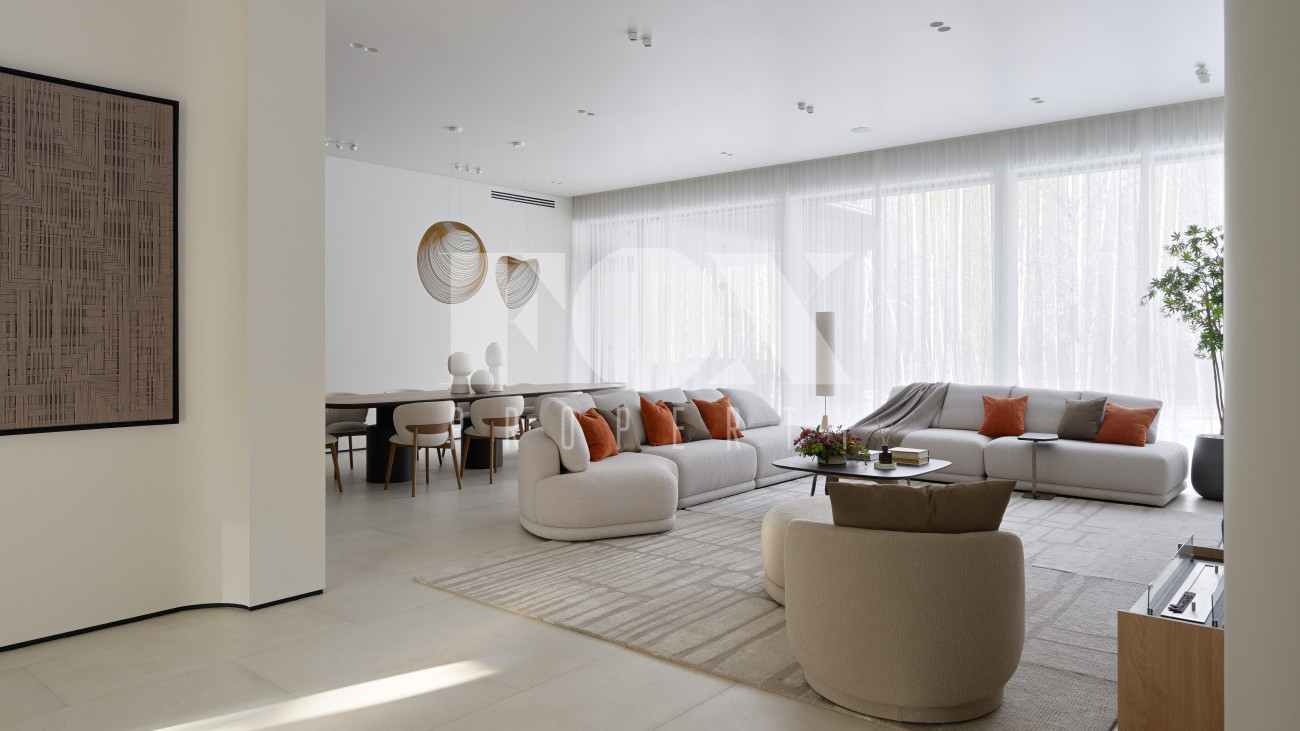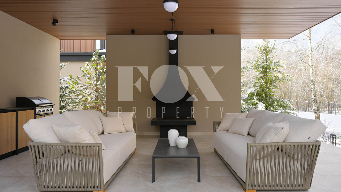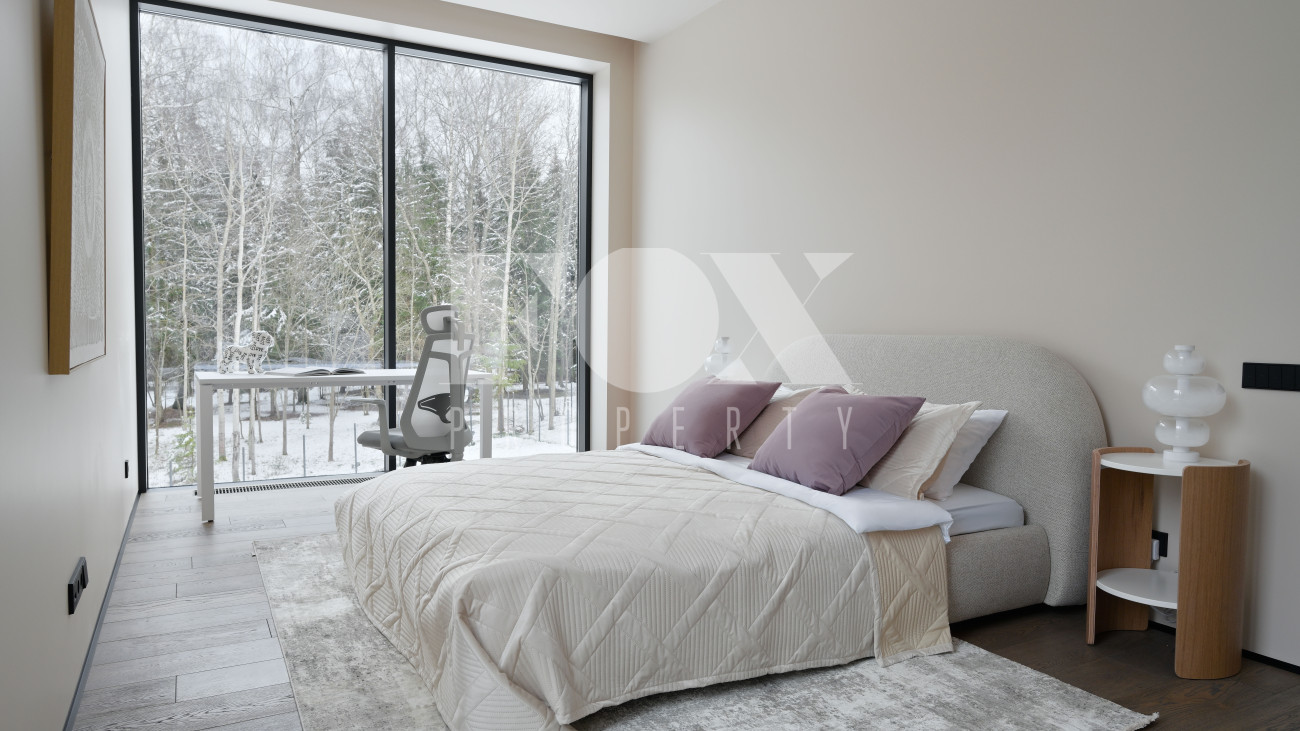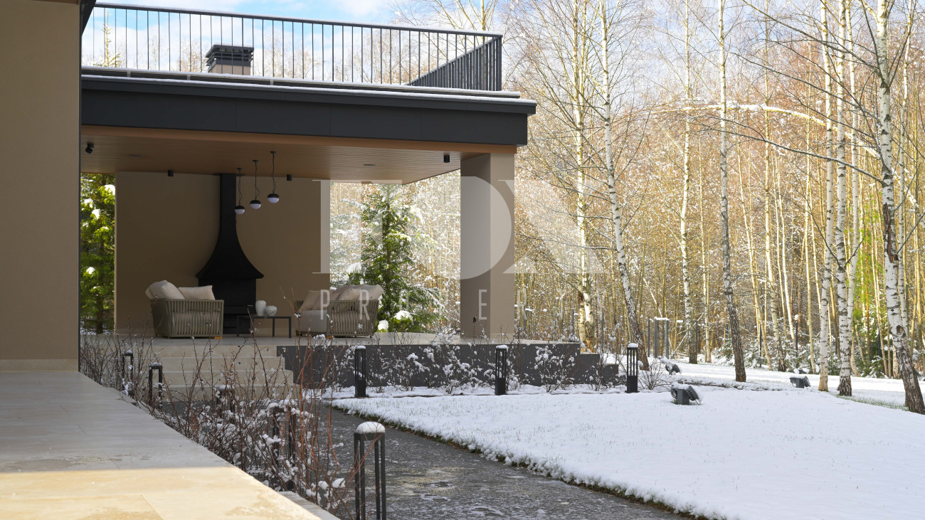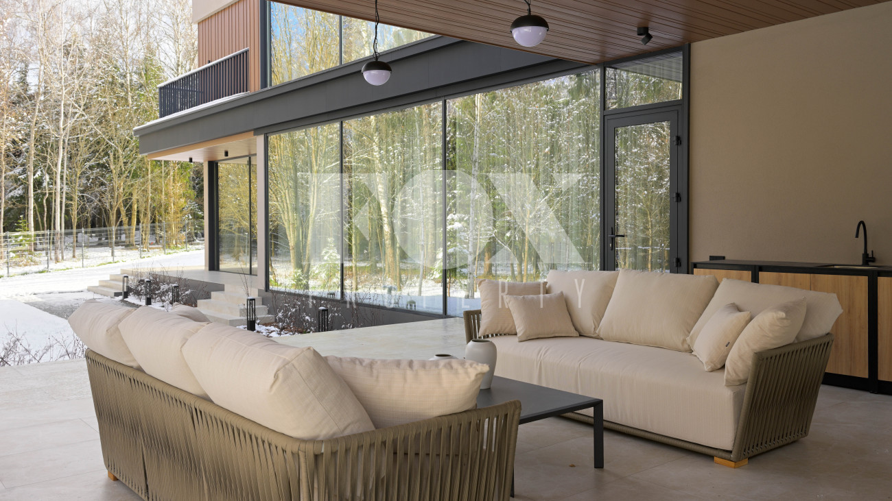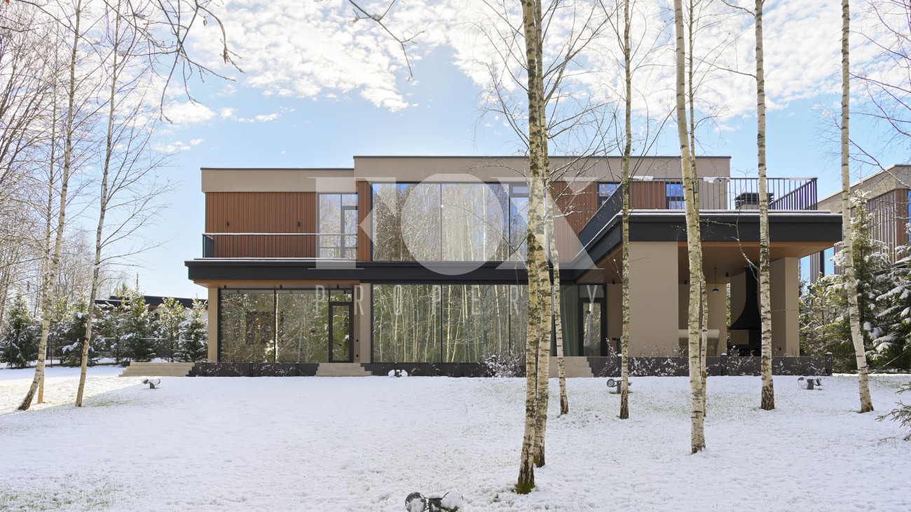Готовый к заселению дом площадью 627,5 м2 с архитектурой в стиле Hi-Tech. Пространство включает 6 спален,