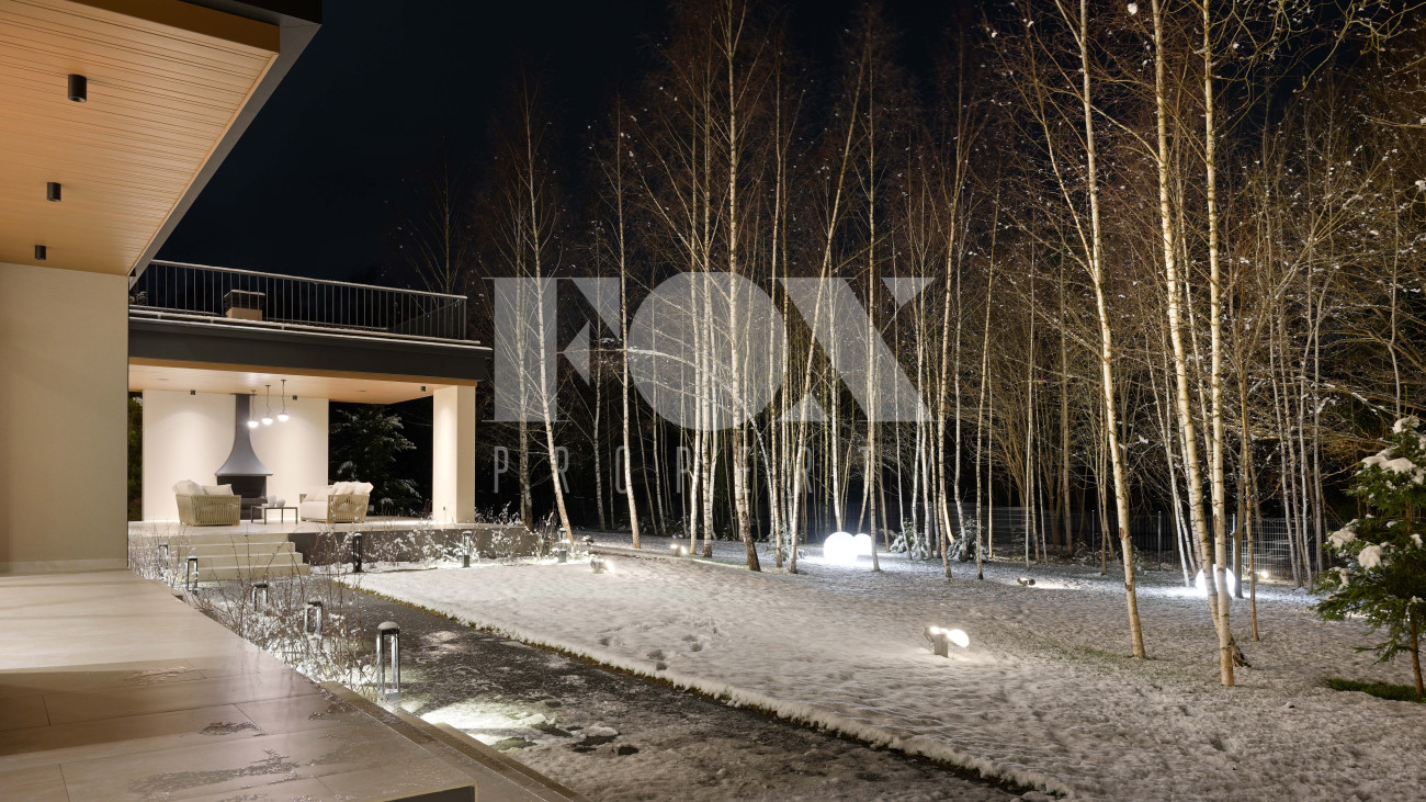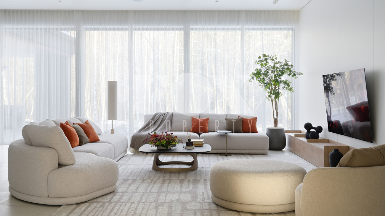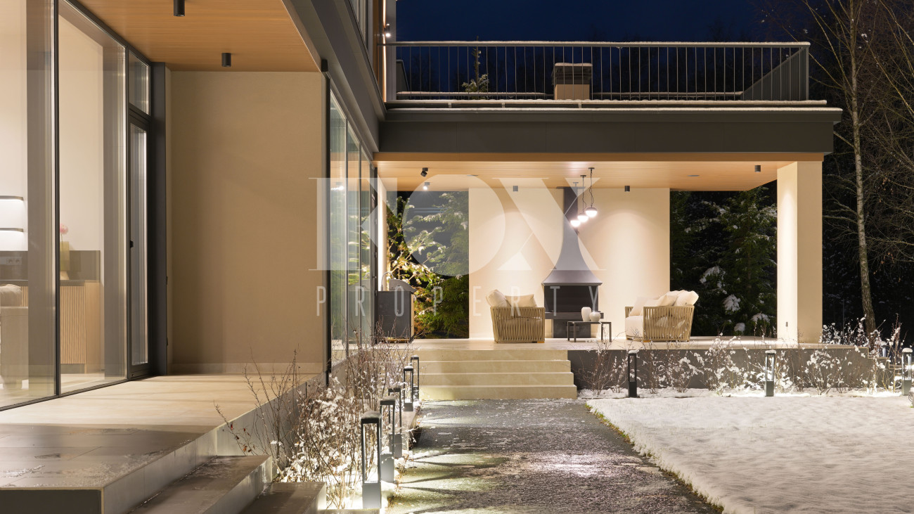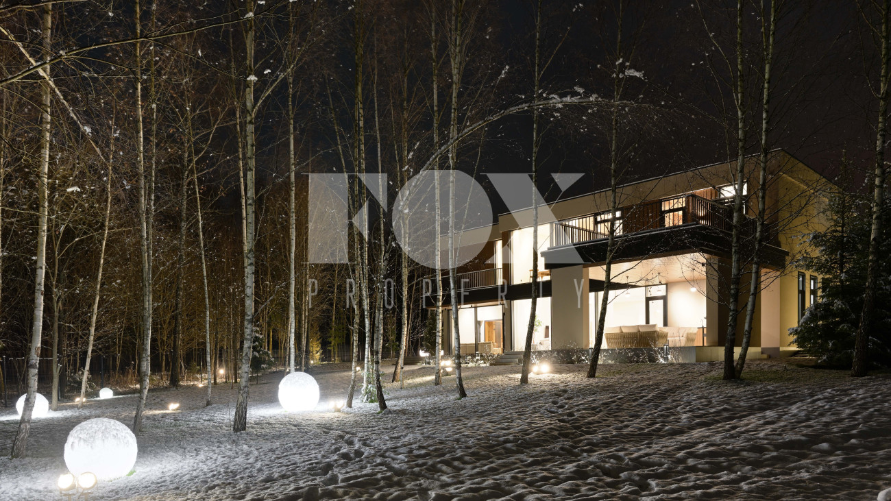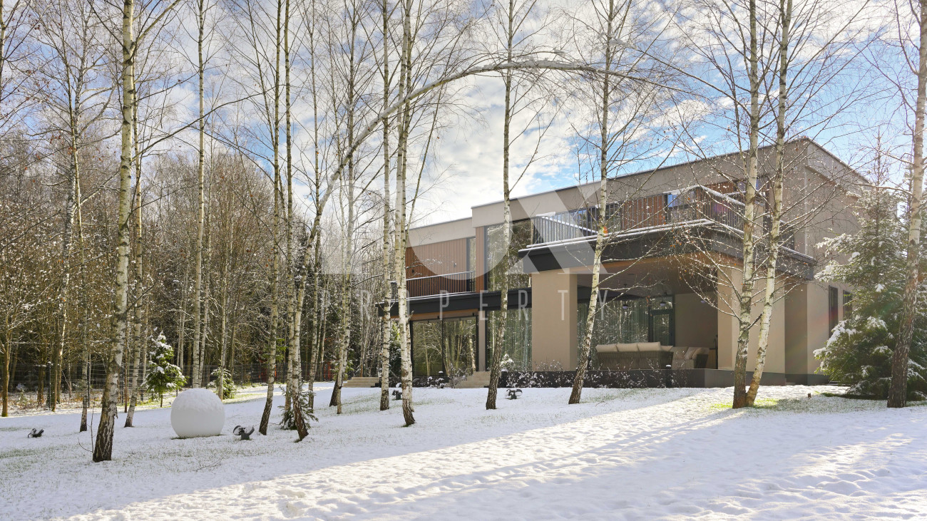 Готовый к заселению дом площадью 627,5 м2 с архитектурой в стиле Hi-Tech. Пространство включает 6 спален,