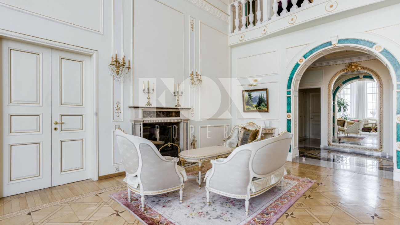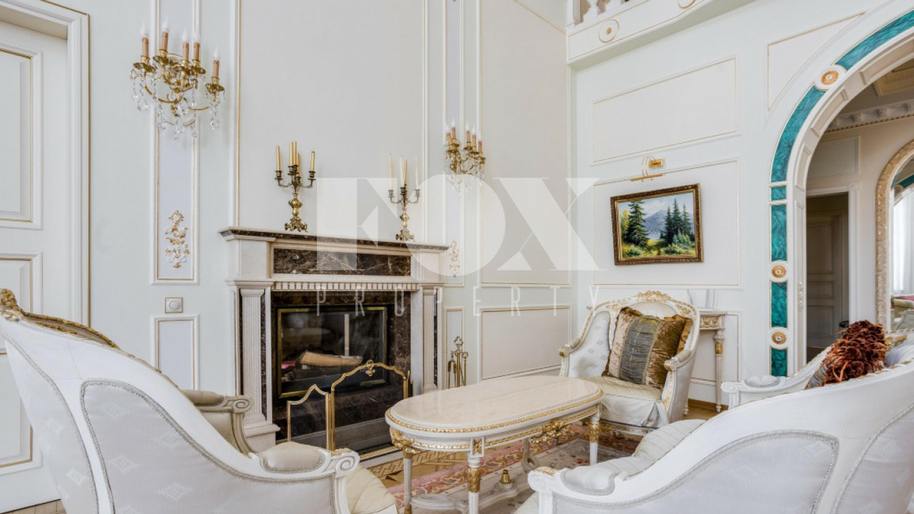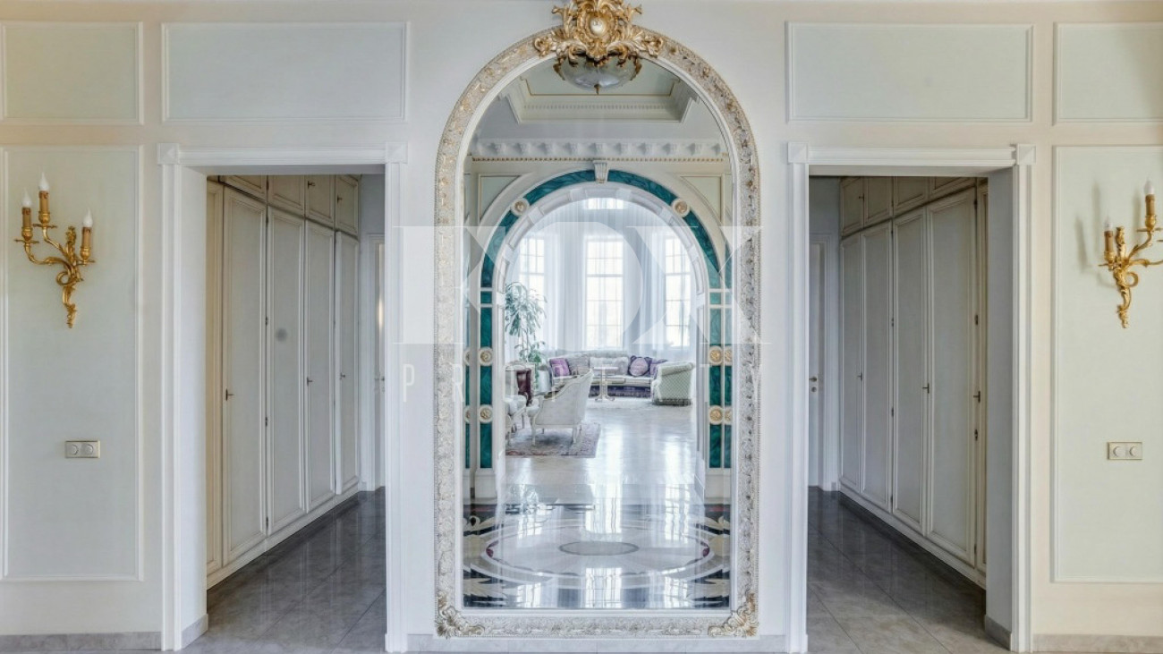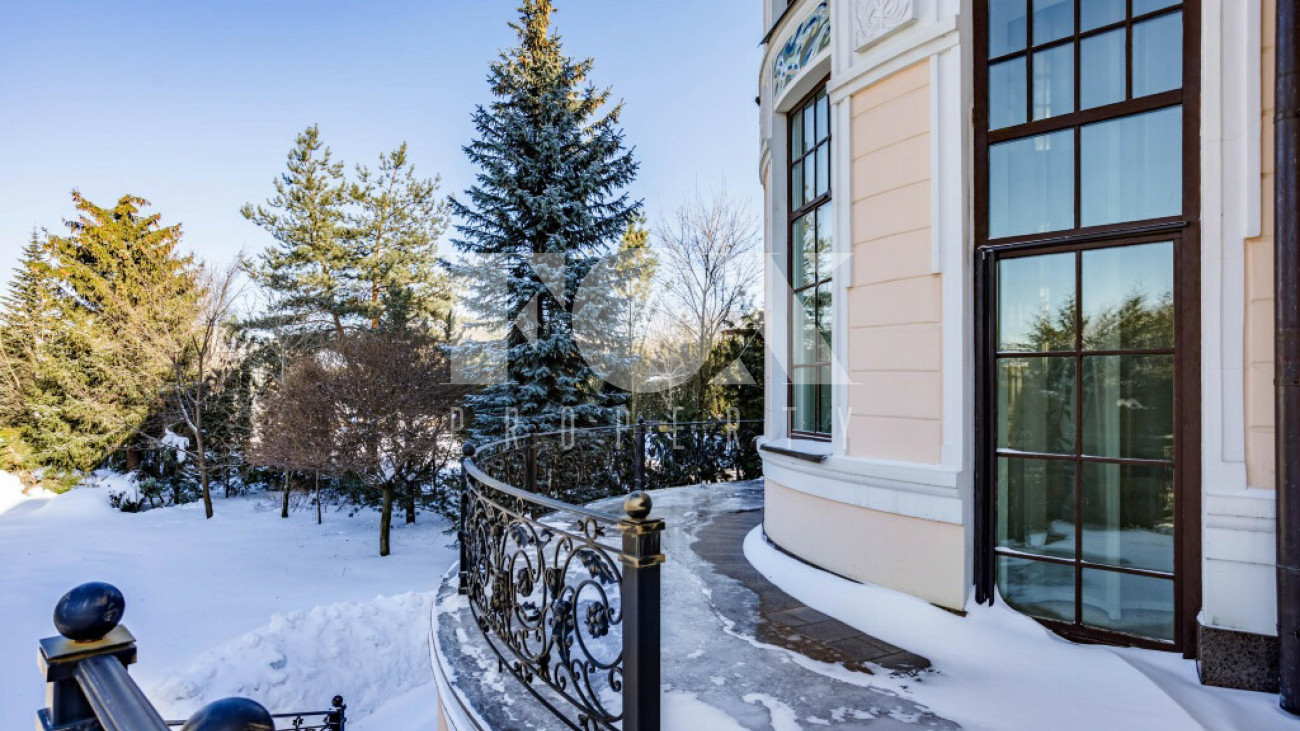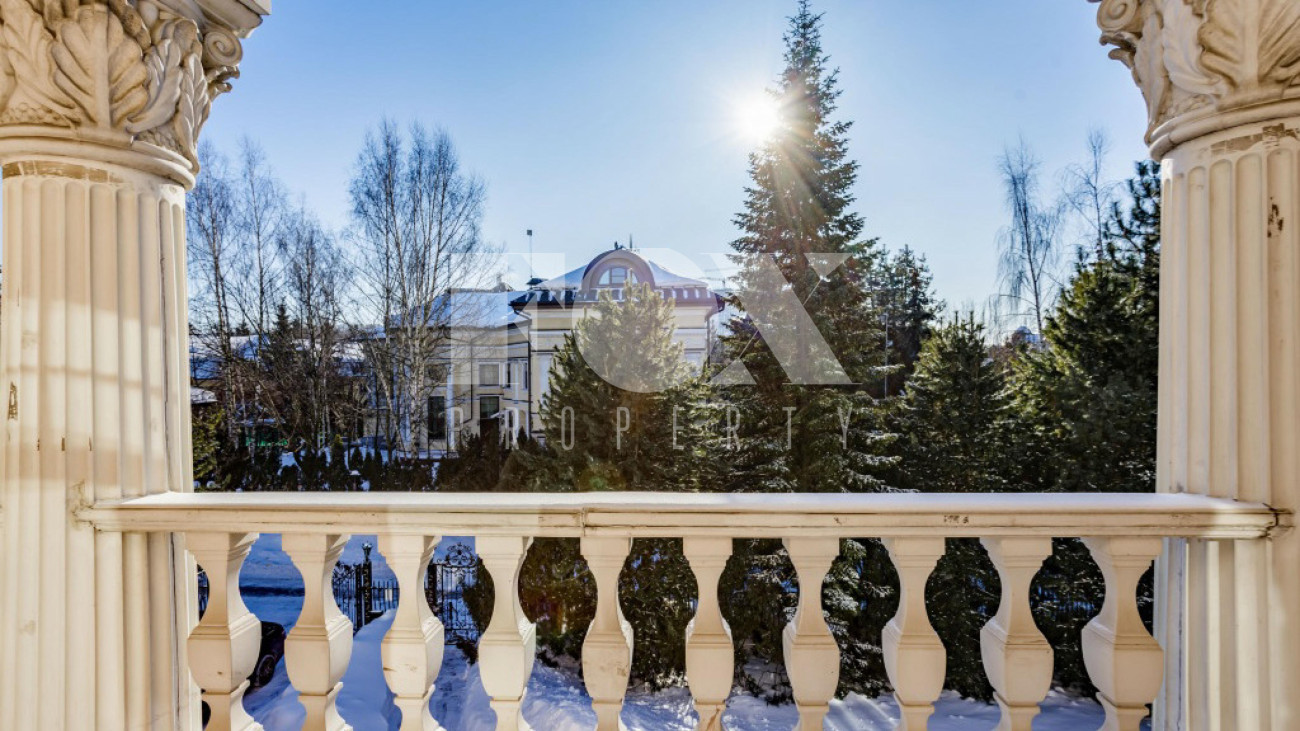Придомовая территория поражает своей красотой и ухоженностью: среди вывмощенных дорожек возвышаются вечнозеленые ели и сосны, создавая атмосферу приватности в окружении живописного ландшафта. Фасад здания выполнен в классическом стиле с изящной лепниной, колоннами и балюстрадами, что подчеркивает высокий статус объекта.