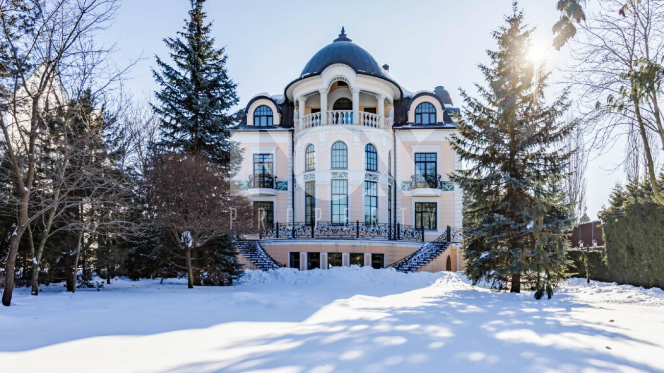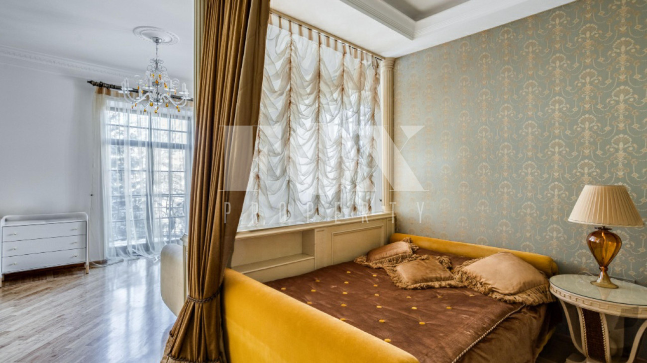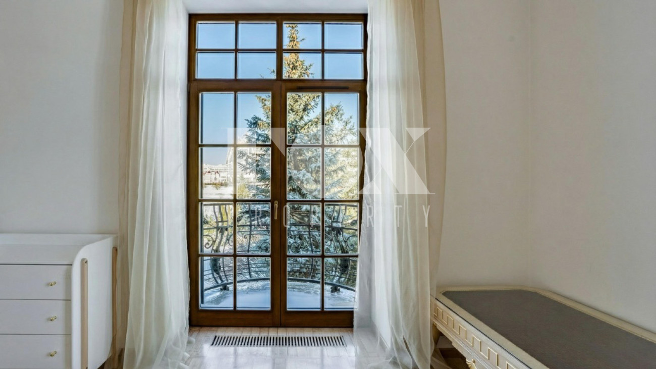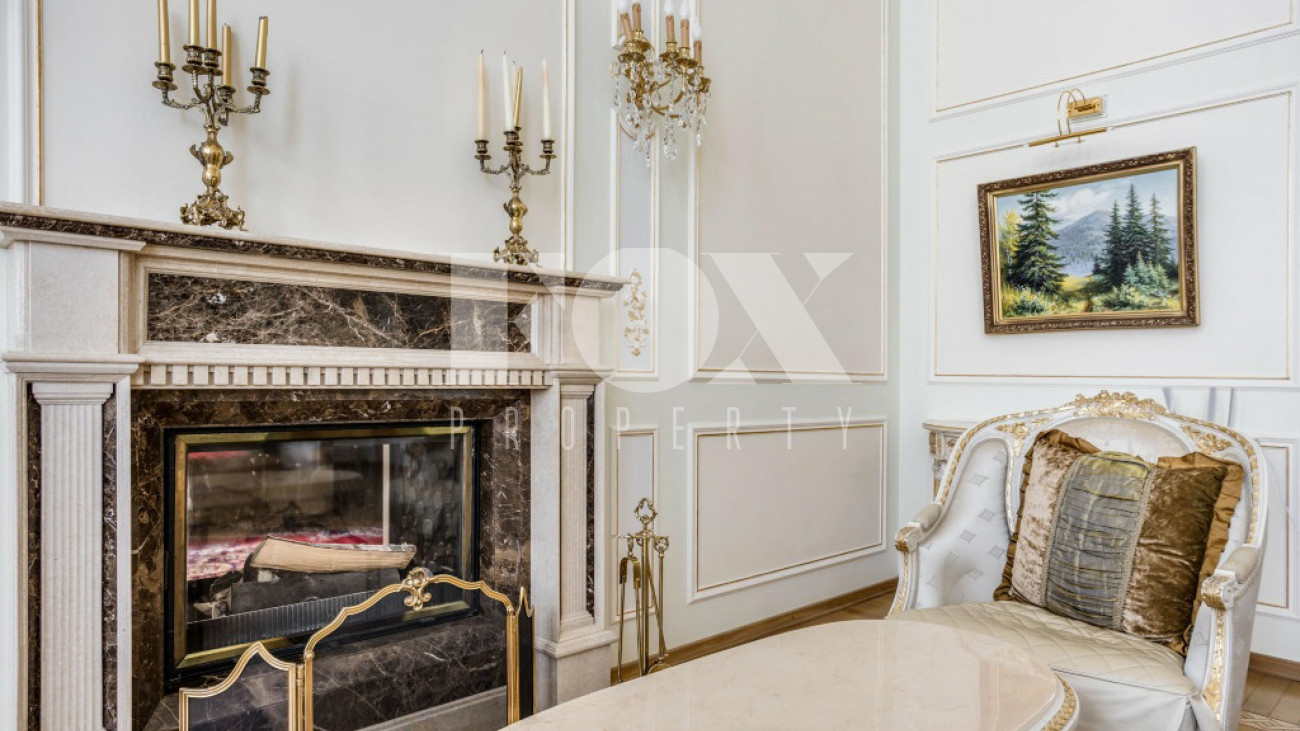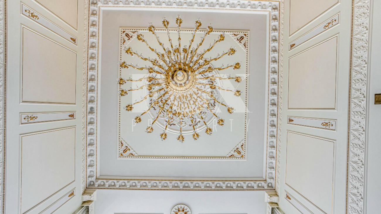 Придомовая территория поражает своей красотой и ухоженностью: среди вывмощенных дорожек возвышаются вечнозеленые ели и сосны, создавая атмосферу приватности в окружении живописного ландшафта. Фасад здания выполнен в классическом стиле с изящной лепниной, колоннами и балюстрадами, что подчеркивает высокий статус объекта.